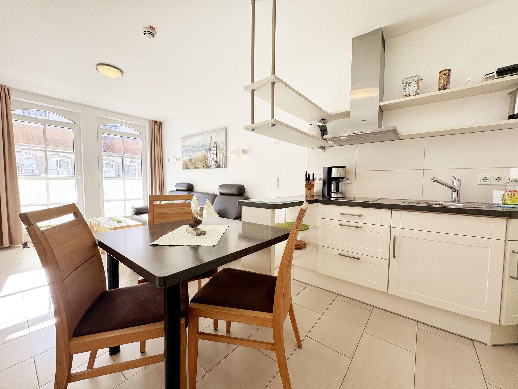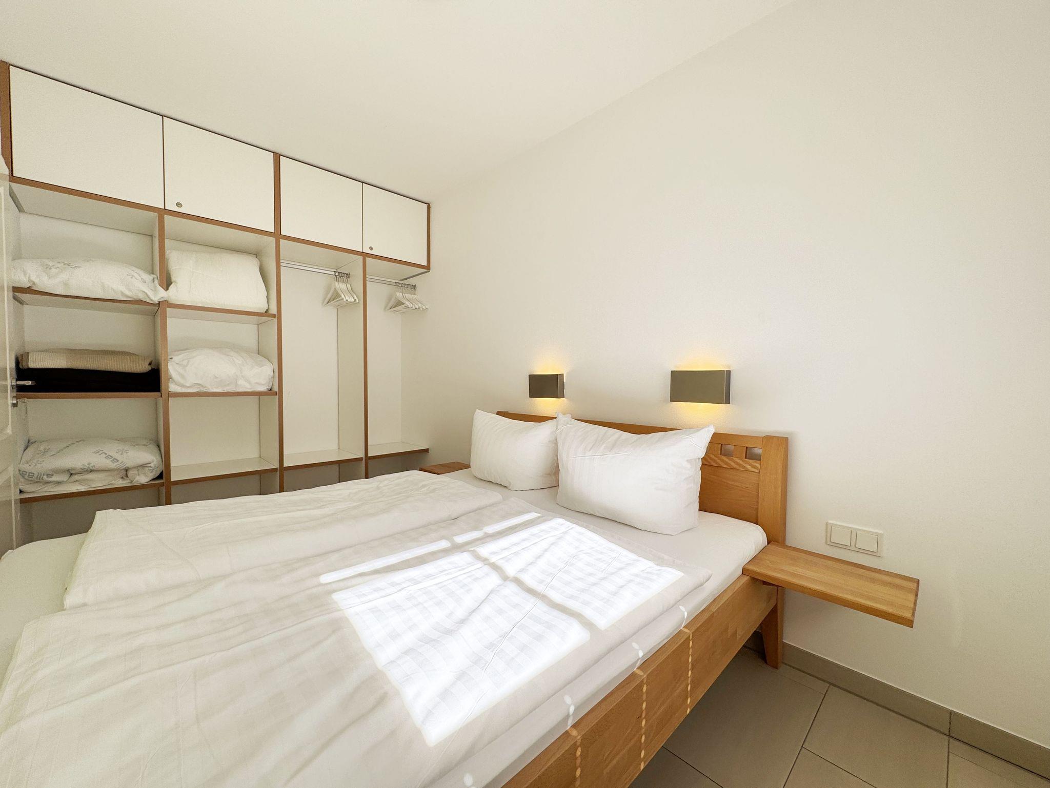 Ihre Nichtraucher-Ferienwohnung ist mit viel Liebe zum Detail ausgestattet und eingerichtet. Sie wohnen in einer ca. 40 m² großen 2-Zimmerwohnung, die ideal für 2 Personen ist (Aufbettungsmöglichkeit im Wohnbereich für eine 3. Person). Die Wohnung A 2.11 befindet sich in der 2. Etage und ist per Fahrstuhl bequem zu erreichen. In der Wohnung finden Sie einen kombinierten Wohn-/Koch- und Essbereich. Die integrierte Küchenzeile lässt mit Backofen, Ceranfeld, Spülmaschine, Kühlschrank mit Gefrierfach, Kaffeemaschine, Wasserkocher, Toaster und anderen praktischen Helfern keine Wünsche offen. Im Wohnbereich sind weiterhin eine Essecke sowie eine gemütliche Couch (1,20 m x 2,00 m) mit Ottomane, Couchtisch, Smart-TV, Blu-Ray-Player und Mini-Stereoanlage vorhanden. Auch auf einen Internetanschluss (WLAN/LAN) müssen Sie nicht verzichten. Dieser ist für Sie inklusive. Der Balkon ist vom Wohn-/Essbereich begehbar und komplett möbliert. Von hier aus haben Sie einen Blick in Richtung Inselparadies. Das Schlafzimmer ist mit einem Doppelbett (1,60 m x 2,00 m) mit verstellbaren Lattenrosten (Kopfteil), Nachttischkonsolen sowie einem offenen Kleiderschrank ausgestattet. Der Wohn- und Schlafraum kann abgedunkelt werden. Das Bad verfügt über eine ebenerdige Dusche, Waschbecken, Fön, WC und Handtuchheizkörper. Ein eigener PKW-Stellplatz Nr. 31 (Einfahrtshöhe 2,00m) befindet sich in der Tiefgarage des Hauses. Im Keller des Hauses haben Sie die Möglichkeit eine Waschmaschine/Trockner gegen Gebühr zu nutzen. Haustiere sind nicht erlaubt. Mit dem Fahrstuhl des Hauses A gelangen sie in das Untergeschoss der Meeresblickanlage, wo Sie ein großzügiger und heller Wellnessbereich erwartet. Hier können sie in einem Pool kleine Bahnen schwimmen, in 2 Saunen Ihren Kreislauf in Schwung bringen, in einem dazugehörigen Ruheraum Ihren Körper wieder beruhigen, in einer Schneckendusche sowie weiteren Duschen das kühle Nass genießen und auf einer Außenterrasse mit Außendusche die frische Luft einatmen. Die Erstausstattung eines Wäschepaketes (komplette Bettwäsche, 1 Duschhandtuch, 2 kleine Handtücher) können Sie bis 14 Tage vor Anreise gegen einen Aufpreis dazu buchen oder durch eigene ergänzen. Ab 2 gebuchten Paketen erhalten Sie einmalig 1 Geschirrhandtuch und 1 Duschvorleger hinzu.
