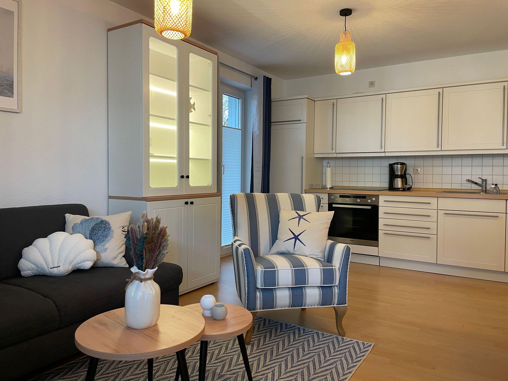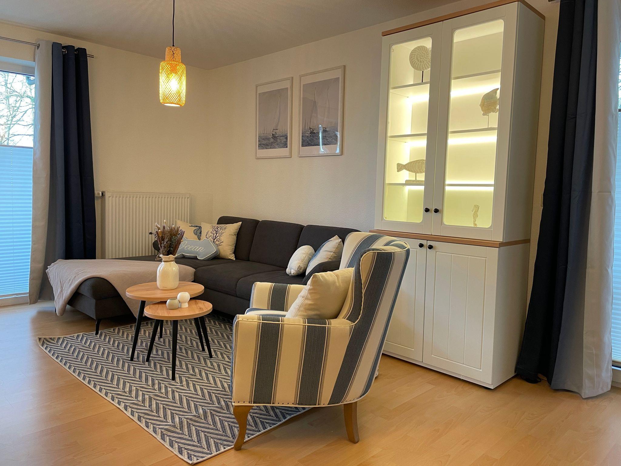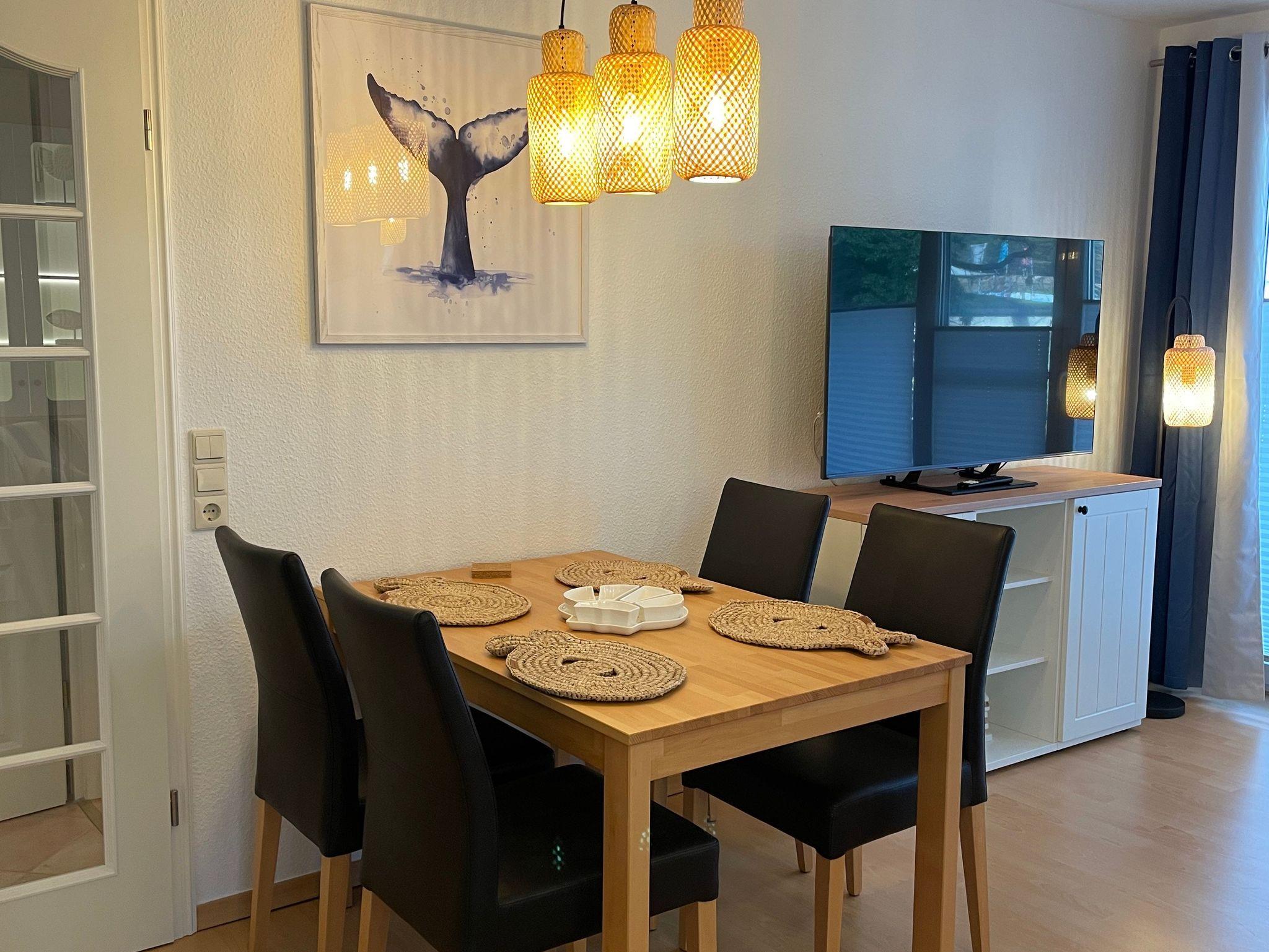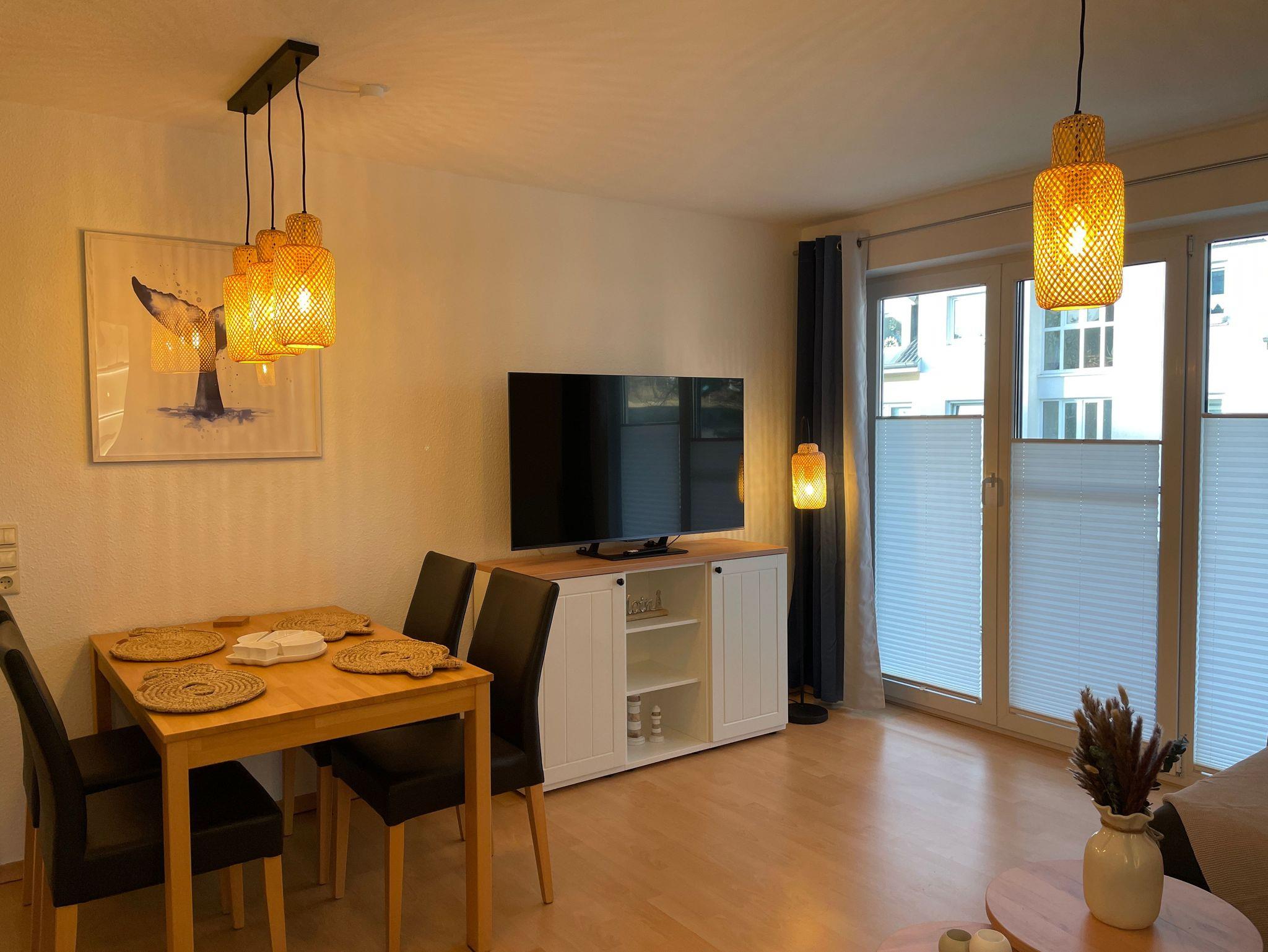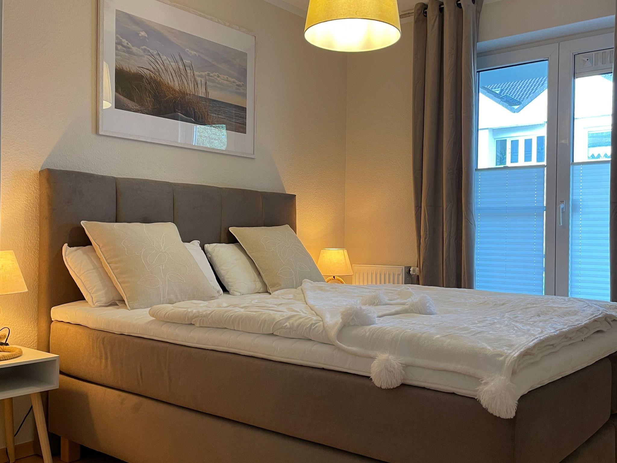 Die komfortable ca. 70 m² große 3-Raum Nichtraucherwohnung mit zwei zusätzlichen Balkonen ist ideal für max. 2 bis 4 Erwachsene + 1 Kleinkind bis 3 Jahre im Kinderreisebett geeignet. Über einen geräumigen Treppenhausflur mit Aufzug gelangen Sie direkt zur Wohnung in der 1. Etage. Von hier aus betreten Sie den Flur, der in einen hellen und offen gestalteten Wohn-/Essbereich mit bodentiefen Fenstern endet. Die gesamte Wohnung ist im maritimen Stil eingerichtet. Der Wohnbereich besticht durch eine gemütliche Atmosphäre mit einer Couch, einem Sessel, eine Stehlampe, einem Sideboard mit einem Smart-TV und einem DAB-Radio. Ein WLAN-Anschluss rundet den technischen Bereich ab. Die angrenzende komplett ausgestattete Küchenzeile mit Cerankochfeld, einem Backofen, einem großen Kühlschrank mit Gefrierfach, einem Geschirrspüler, einer Kaffeemaschine, einem Toaster, einen Wasserkocher und allen notwendigen Küchenutensilien sowie ein massiver Esstisch kompilieren den Raum. Von hier aus gelangen Sie zu Ihren bestuhlten Balkonen mit einer West- und Nord-Ausrichtung. Vom Nord-Balkon genießen Sie bei Morgensonne einen entspannenden Blick ins Grüne. Das Grillen ist auf den Balkonen nur mit Elektrogrill gestattet. Ein Sonnenschirm schützt sie vor der direkten Sonne. Das 1. Schlafzimmer ist mit einem komfortablen Boxspringbett (2,00m x 2,00m), Nachttischablagen mit Beleuchtung, einen Herrendiener und einem Kleiderschrank ausgestattet. Das 2. Schlafzimmer verfügt ebenfalls über ein Boxspringbett (1,60m x 2,00m), Nachttischablagen mit Beleuchtung, einen Herrendiener sowie einen Kleiderschrank und einen Smart-TV. Beide Schlafzimmer können abgedunkelt werden. Das moderne und innenliegende Badezimmer ist mit einer Dusche mit flachem Einstieg, einem Waschplatz, einem WC, einem beleuchteten Spiegelschrank, einer Waschmaschine, einem beheizbarem Handtuchtrockner, einem Fön und einer leistungsfähigen Entlüftungsanlage ausgestattet. Alle Räume sind mit Insektenschutzgittern versehen. Ein Staubsauger, Bügeleisen/ -brett und Reinigungsutensilien befinden sich im kleinen Abstellraum direkt in Ihrer Wohnung. Der Tiefgaragenstellplatz Nr.09 (Einfahrtshöhe 1,90m) befindet sich mit einem Zugang zum Treppenhaus/ Fahrstuhl im Untergeschoß des Hauses. Am Stellplatz steht Ihnen ein eigener ca. 6 qm großer abschließbarer Kellerraum zur Verfügung, welcher auch für E-Bikes zum Laden genutzt werden kann. Haustiere sind nicht erlaubt. Die Erstausstattung eines Wäschepaketes (komplette Bettwäsche, 1 Duschhandtuch, 1 kleines Handtuch) können Sie bis 14 Tage vor Anreise gegen einen Aufpreis dazu buchen oder durch eigene ergänzen. Ab 2 gebuchten Paketen erhalten Sie einmalig 1 Geschirrhandtuch und 1 Duschvorleger hinzu.