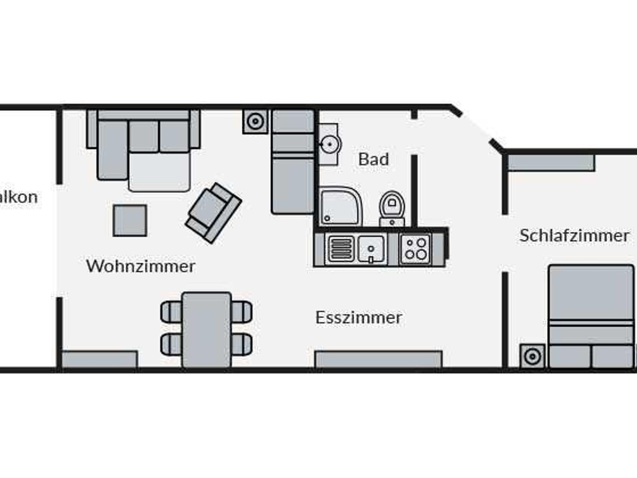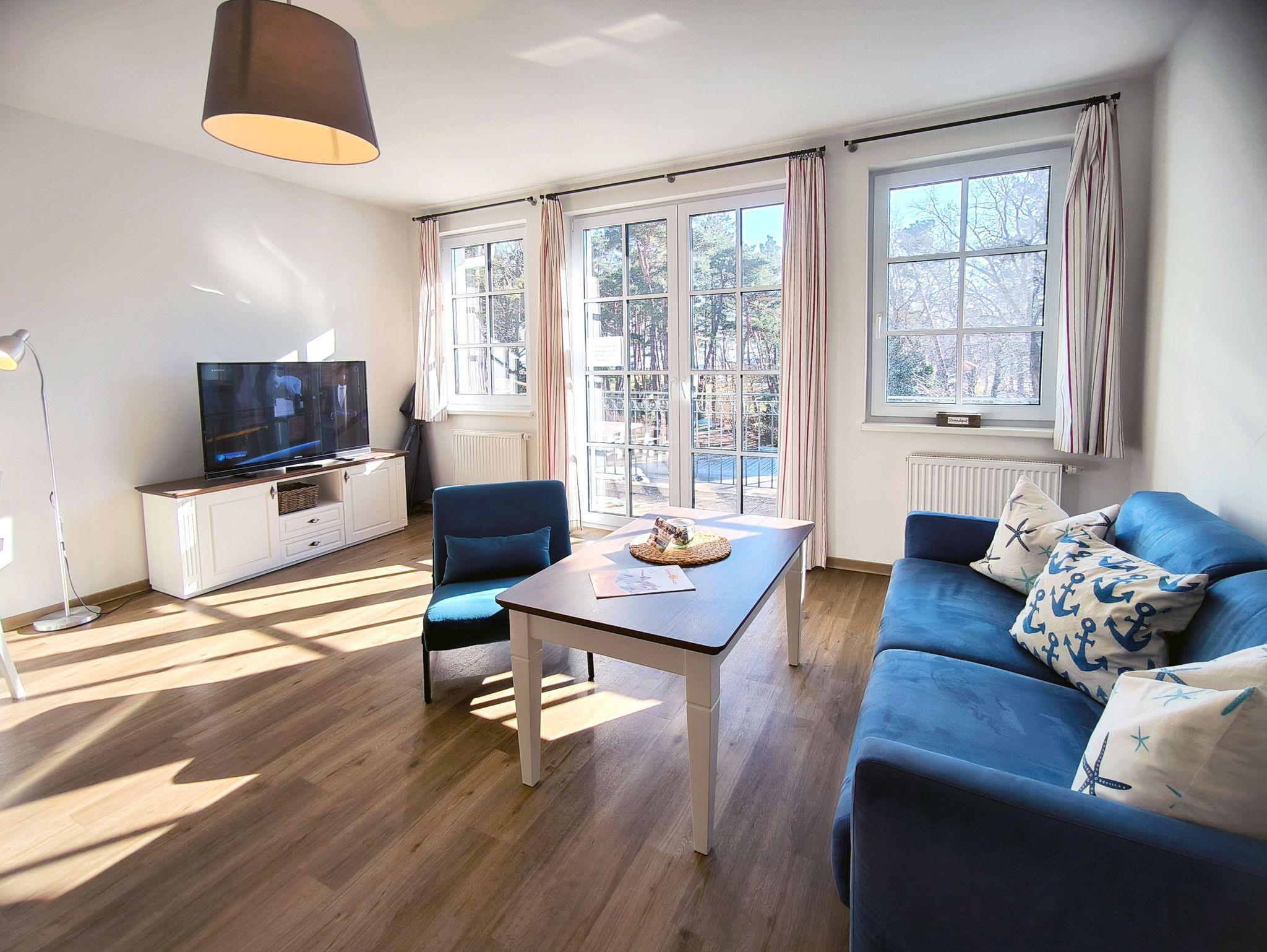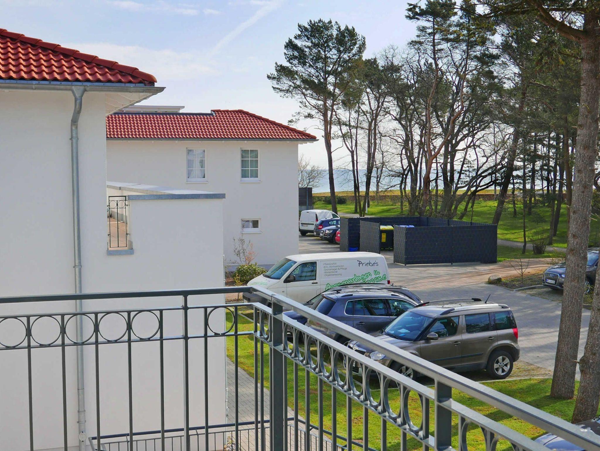 Helle schöne 2 Zimmerferienwohnung mit Meerblick und Balkon. Für die Wohnung sind neue geweißte Holzmöbel angefertigt worden. Die Küche ist komplett eingerichtetet und hat eine Geschirrspülmaschine und Backofen. Im Wohnbereich befindet sich ein Schlafsofa, der Ess- und Küchenbereich. von hier geht es auf den schönen Balkon mit Blick zum Meer. Am Ende der Wohnanlage befindet sich der nun neu restaurierte Mütherbau .