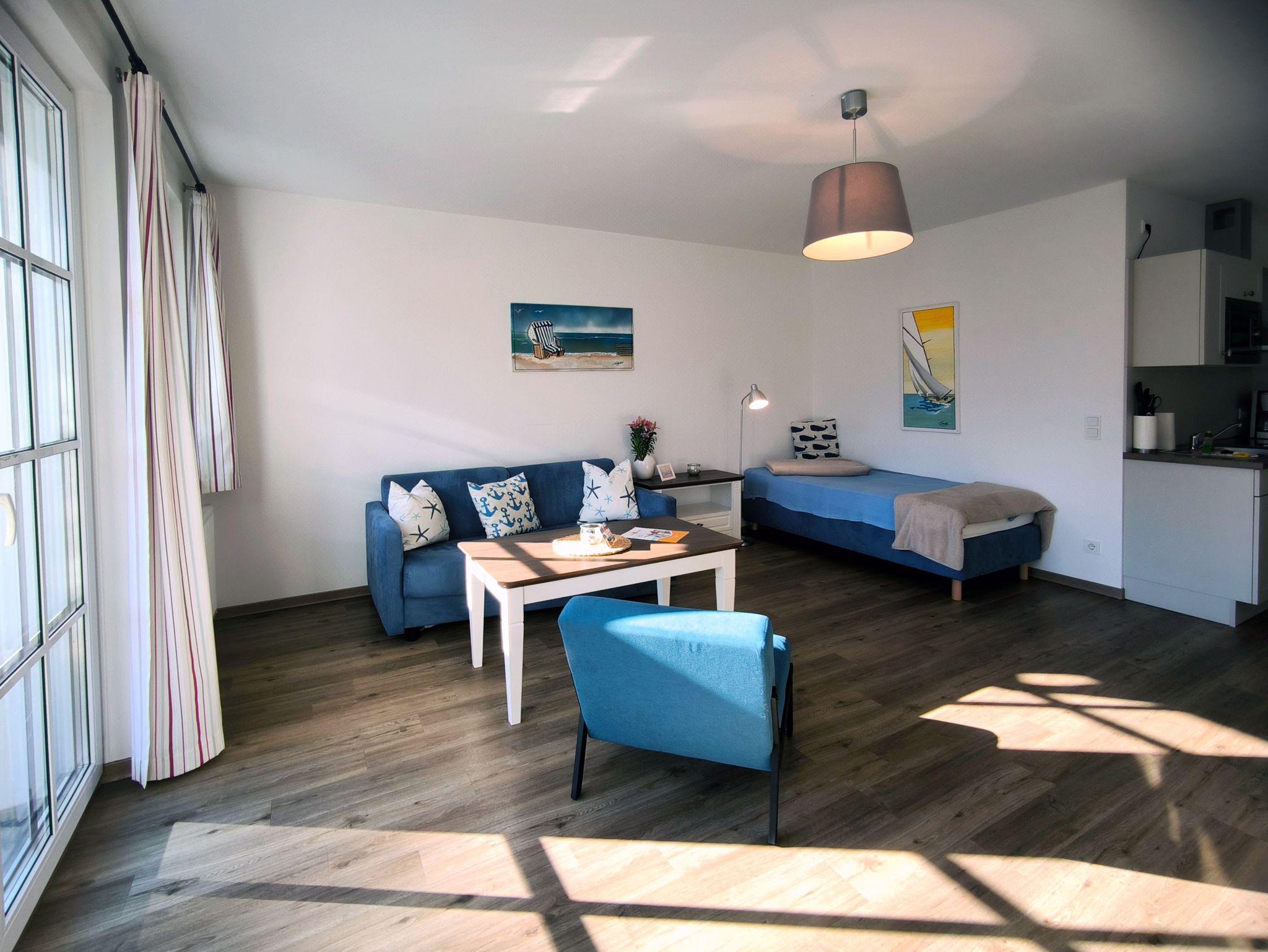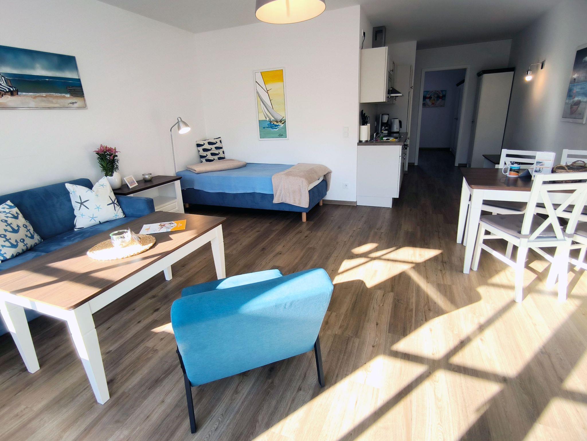 Helle schöne 2 Zimmerferienwohnung mit Meerblick und Balkon. Für die Wohnung sind neue geweißte Holzmöbel angefertigt worden. Die Küche ist komplett eingerichtetet und hat eine Geschirrspülmaschine und Backofen. Im Wohnbereich befindet sich ein Schlafsofa, der Ess- und Küchenbereich. von hier geht es auf den schönen Balkon mit Blick zum Meer. Am Ende der Wohnanlage befindet sich der nun neu restaurierte Mütherbau.