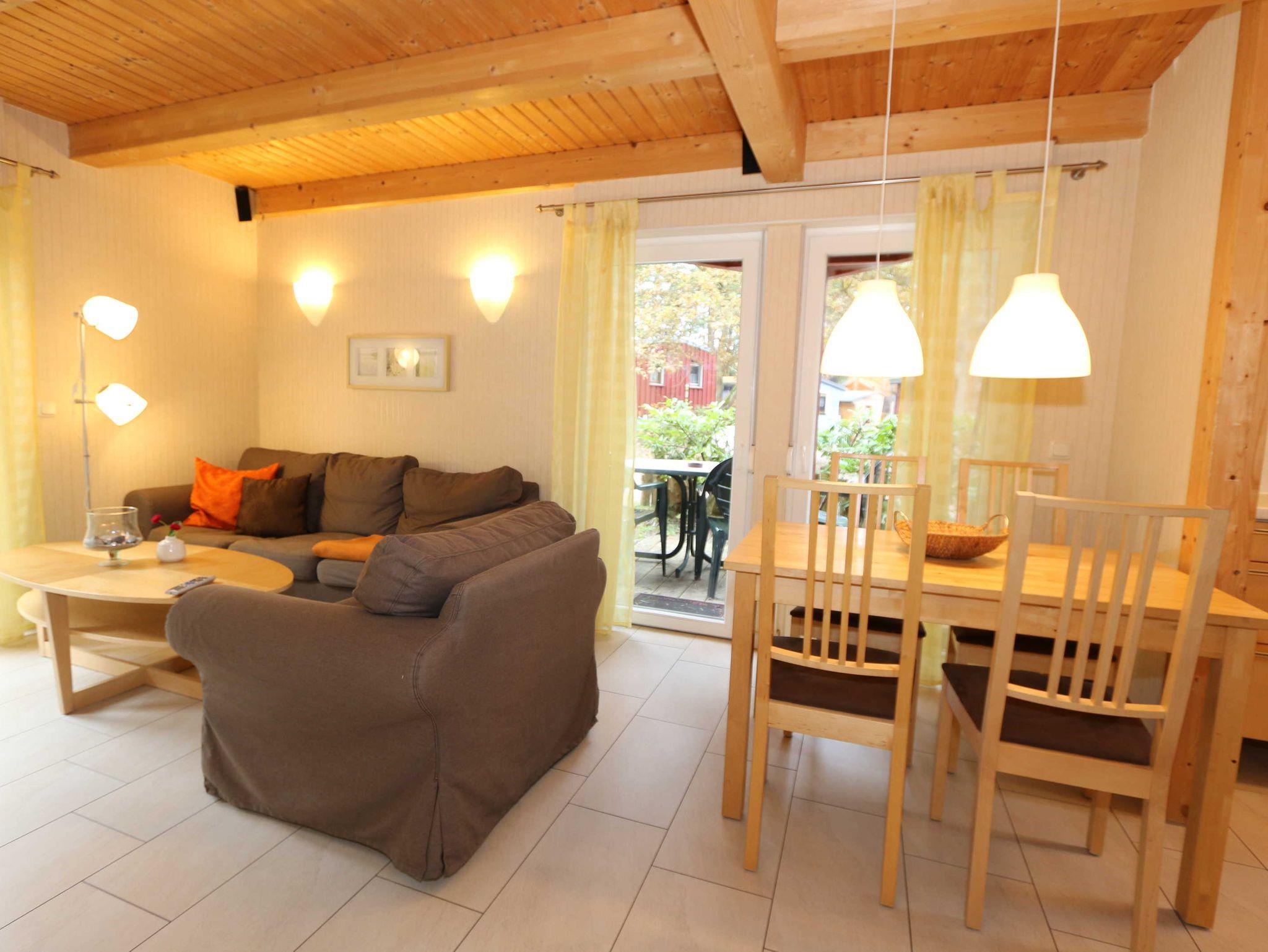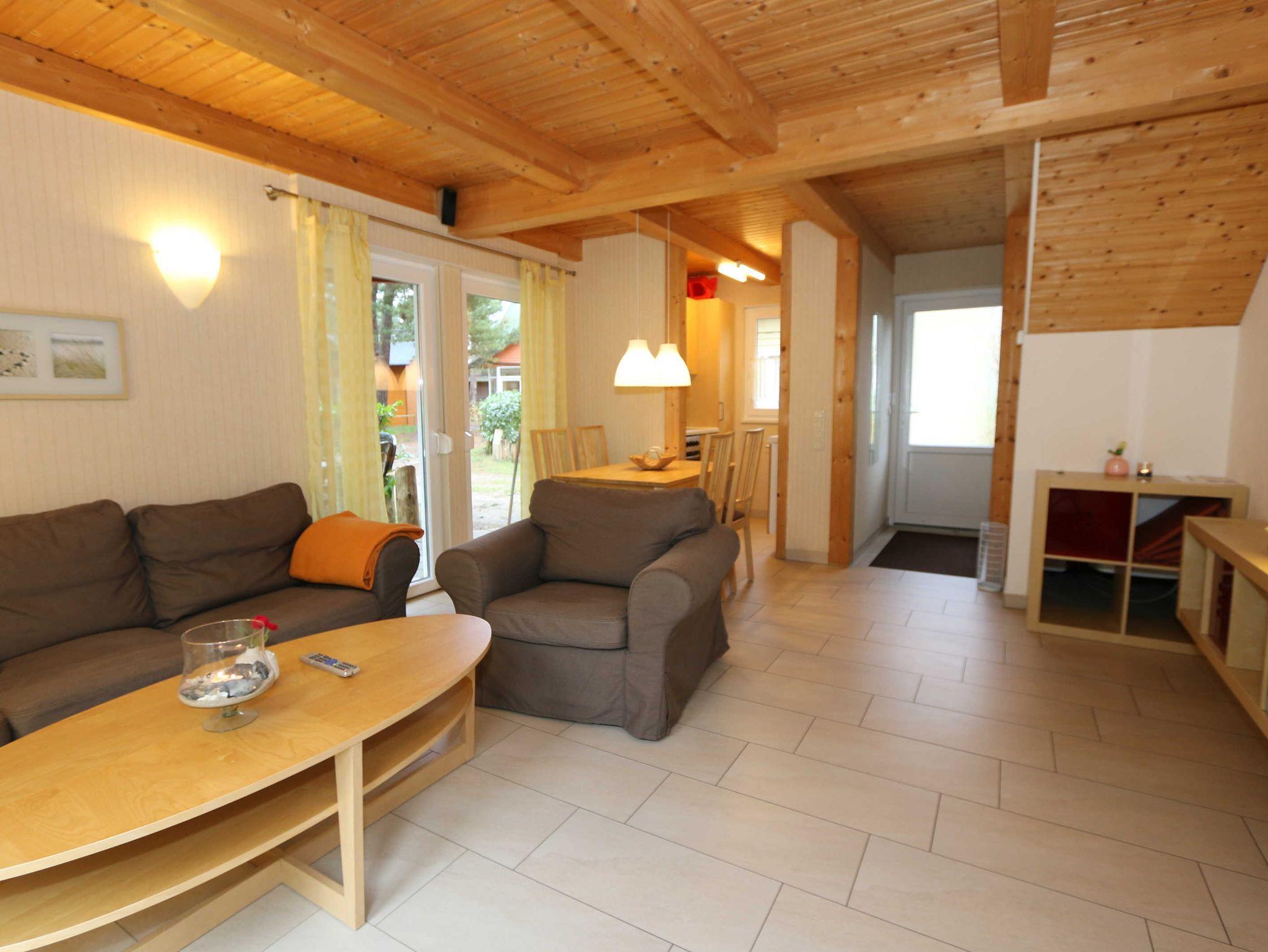 Die Doppelhaushälfte (Nichtraucher) mit Ihren 55 m² Wohnfläche bietet ausreichend Platz für 4 Erw. + 1 Kleinkind bis 3 Jahre im Kinderreisebett. Die bodentiefen Fenster im Wohn-/Essbereich lassen viel Tageslicht herein und geben Ihnen den direkten Zugang zur überdachten und bestuhlten Terrasse (Süd-Ost). Abgerundet wird diese durch einen Grill. Der gemütlich, im Schwedenstil, eingerichtete Wohnbereich ist mit einer Couchecke, Couchtisch, LCD-TV mit HD-Qualität und Satellitenempfang, DVD-Player mit Radio und ein Sideboard aus Naturholz ausgestattet. Für die kühleren Tage bieten Ihnen der Kamin (Kaminholz inklusive) sowie die Fußbodenheizung eine angenehme Wärme. Ihre Unterhaltungstechnik wird durch einen kostenfreien WLAN-Zugang abgerundet. Die angrenzende Küchenzeile mit Backofen, Ceranfeld, Dunstabzug, Kühlschrank + Eisfach, Spülmaschine, Mikrowelle, Kaffeemaschine, Toaster, Wasserkocher und kleinen Küchenhelfern lässt keine Wünsche offen. Ihre Mahlzeiten nehmen Sie am dazugehörigen Esstisch mit 4 Stühlen ein. Im Obergeschoss befinden sich beide Schlafzimmer die jeweils mit 2 Boxspringbetten (je mit 0,80 m x 2,00 m), Nachtischablagen, Safe und einem Kleiderschrank ausgestattet sind. Von beiden Schlafzimmern gelangen Sie auf den Balkon. Zusätzlich können Sie ein Kinderreisebett in eines der Schlafzimmer aufstellen. Das Tageslichtbad, was sich auf der gleichen Höhe befindet, wurde mit einer ebenerdigen Dusche, WC, Waschplatz, Handtuchtrockner und Fön ausgestattet. Für unsere kleinen Gäste steht Ihnen 1x Kinderhochstuhl und 1x Kinderreisebett (inkl. Matratze, ohne Bett Inlett) inklusive zur Verfügung. 2 kleine Haustiere sind gegen eine Gebühr gern gesehene Gäste. Eine kleine Waschküche steht Ihnen inklusive zur Verfügung. Die Erstausstattung eines Wäschepaketes (komplette Bettwäsche, 1 Duschhandtuch, 2 kleine Handtücher) können Sie bis 14 Tage vor Anreise gegen einen Aufpreis dazu buchen oder durch eigene ergänzen. Ab 2 gebuchten Paketen erhalten Sie einmalig 1 Geschirrhandtuch und 1 Duschvorleger hinzu.