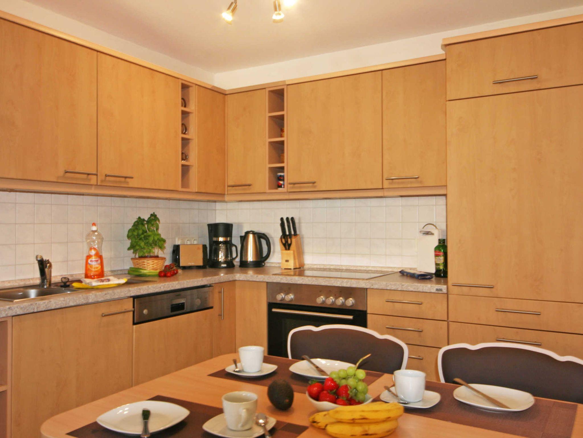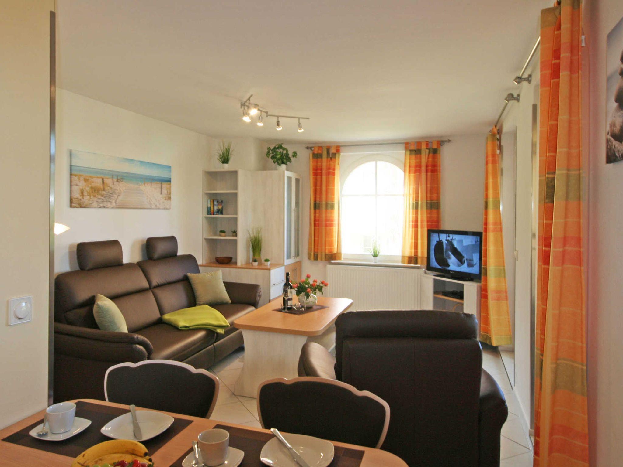 Traumhafte 3-Zimmer-Ferienwohnung in bester Lage mit wunderbarem Blick auf die Ostsee. Verteilt auf zwei Schlafzimmer (jeweils eines mit Doppelbett und eines mit zwei Einzelbetten) können hier 4 Personen Platz finden und einen erholsamen Urlaub genießen. In dem geräumigen Wohnzimmer mit integrierter Küche gibt es sowohl einen Essbereich, als auch einen Sitzbereich mit einem gemütlichem Sofa, Sessel und Fernseher. Von hier aus gelangen Sie auch auf den Hauptbalkon mit Meerblick, auf welchem sich morgens herrlich frühstücken lässt. Der zweite Balkon ist über beide Schlafzimmer begehbar. Die Küche verfügt über einen 4-Plattenherd, Kühlschrank, Backofen, Geschirrspülmaschine, Kaffeemaschine, sowie einen Toaster.