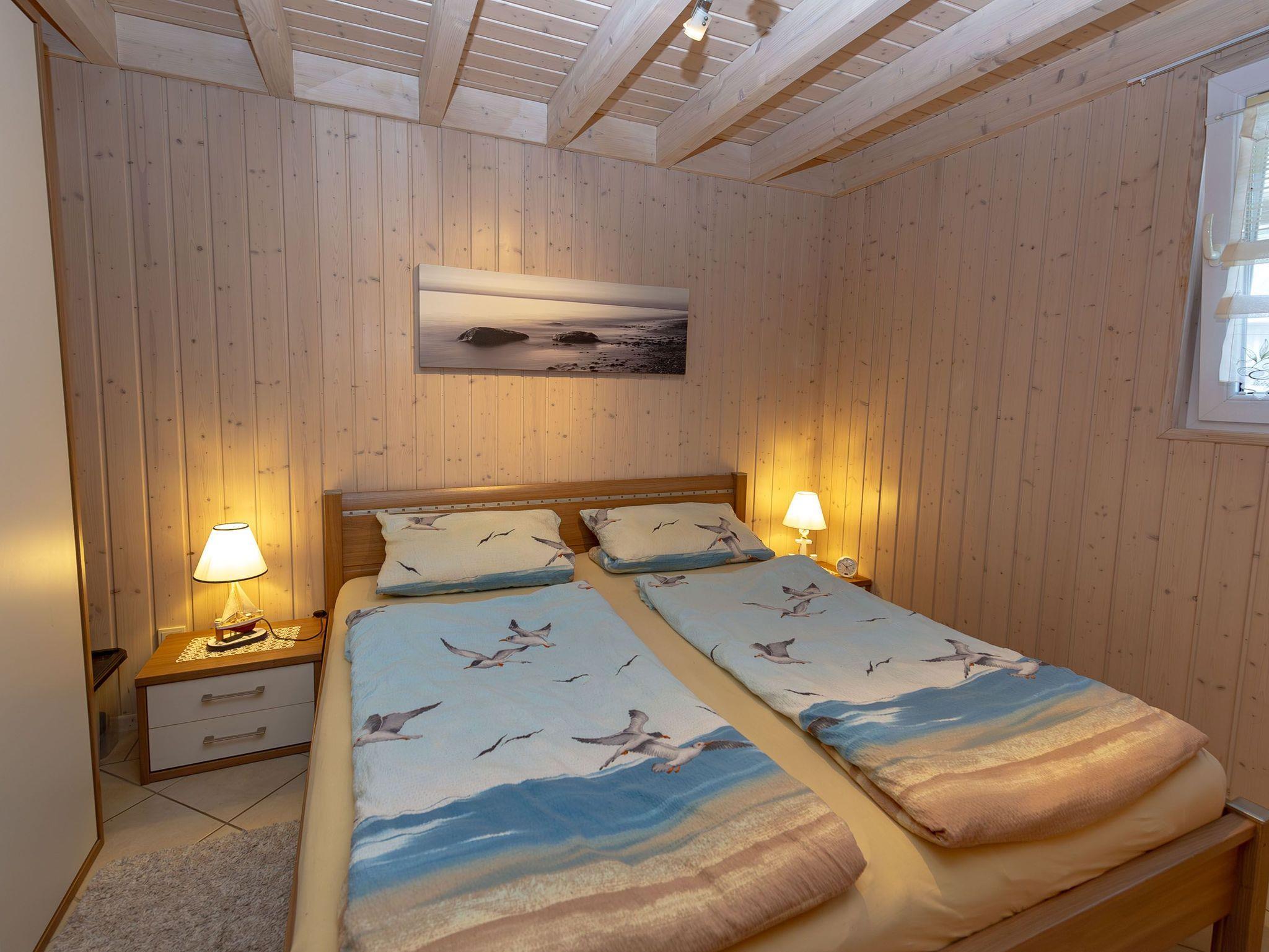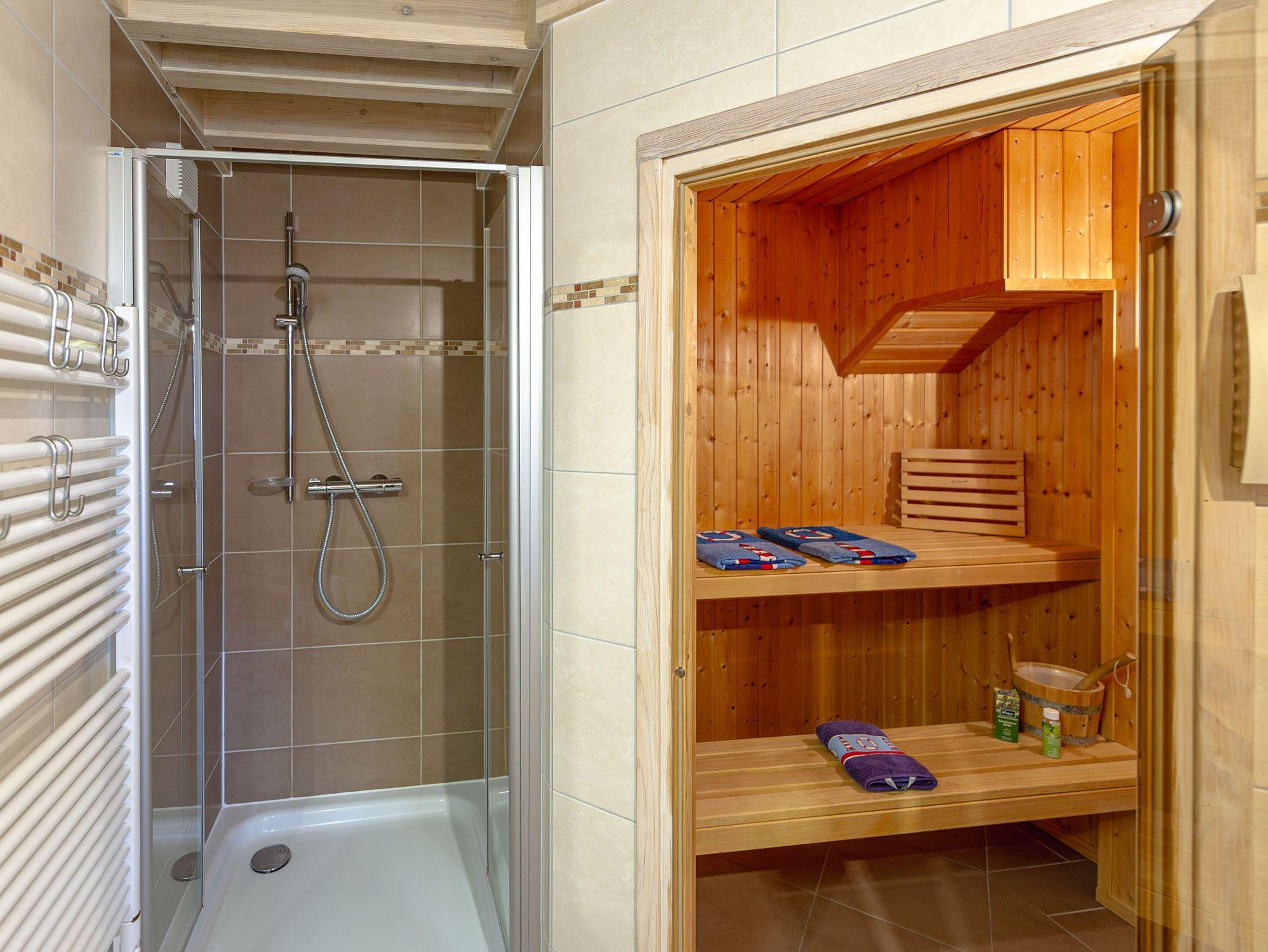 Im Erdgeschoss gibt es außerdem ein Schlafzimmer mit einem kuscheligen Doppelbett nebst Kleiderschrank und das Badezimmer mit Dusche/WC, Badewanne mit Whirlpoolfunktion, Finnischer Sauna und Waschmaschine.
