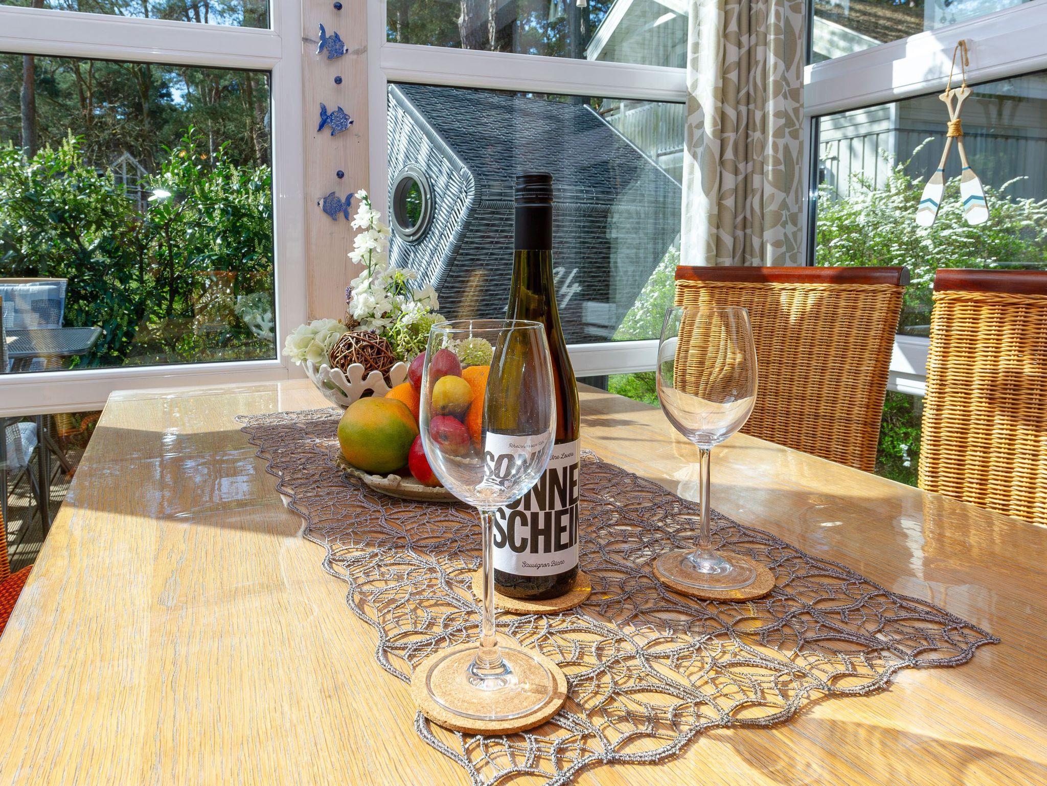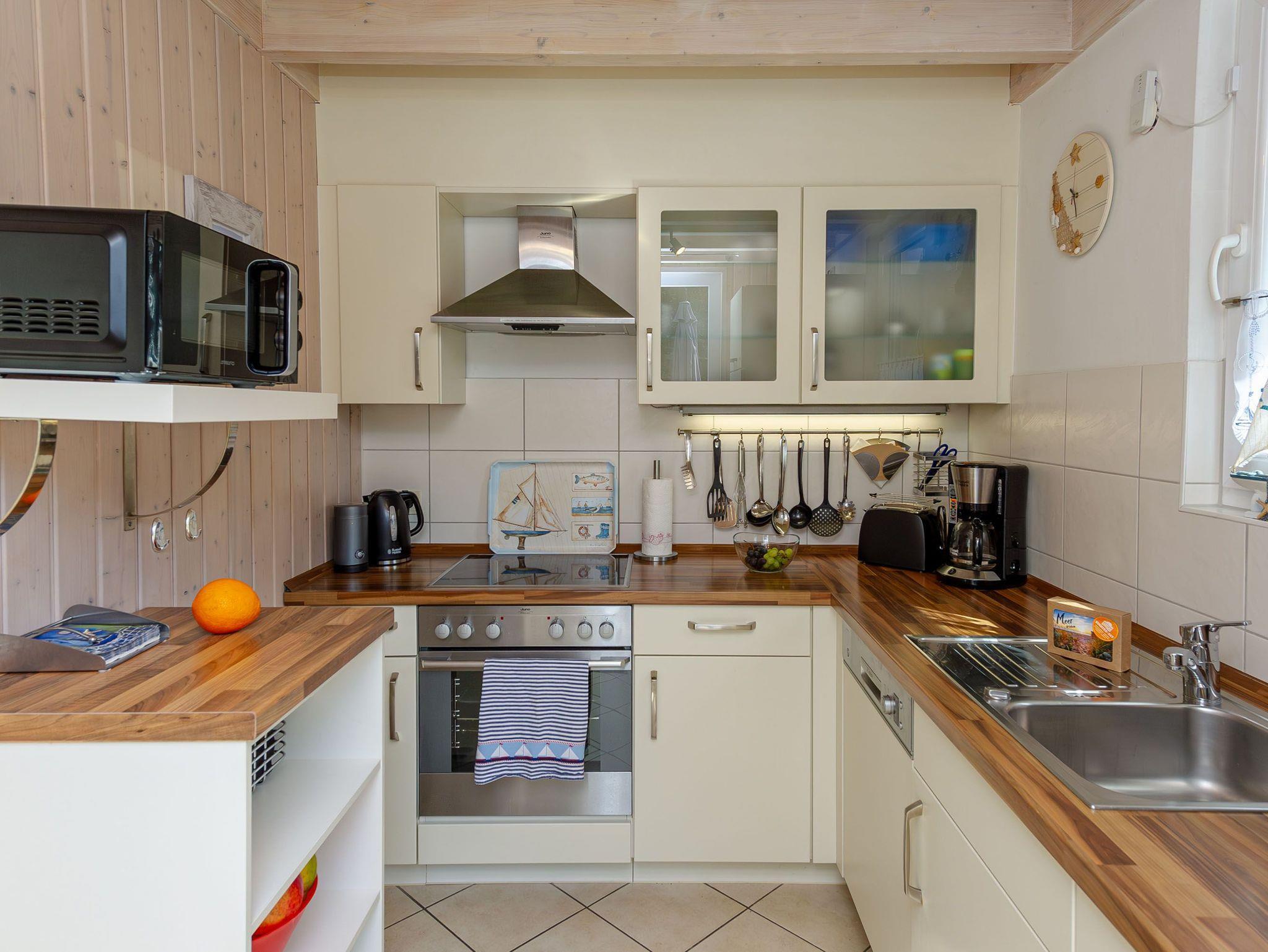 Die separate Küche überzeugt mit einem 4-Platten-Cerankochfeld, Backofen, Kühlschrank, Geschirrspüler, Kaffeemaschine, Wasserkocher, Toaster und allerlei Kleininventar, das die Küchenausstattung vervollständigt. Speisen können Sie wahlweise am Esstisch drinnen oder aber draußen auf Ihrer großen Terrasse, wo Sie vom Morgen bis zum Nachmittag die Sonne zu Gast haben. Die Terrassenmöbel inkl. Strandkorb zum Einkuscheln stehen Ihnen saisonal - in der Regel von Mai bis Ende September - zur Verfügung.