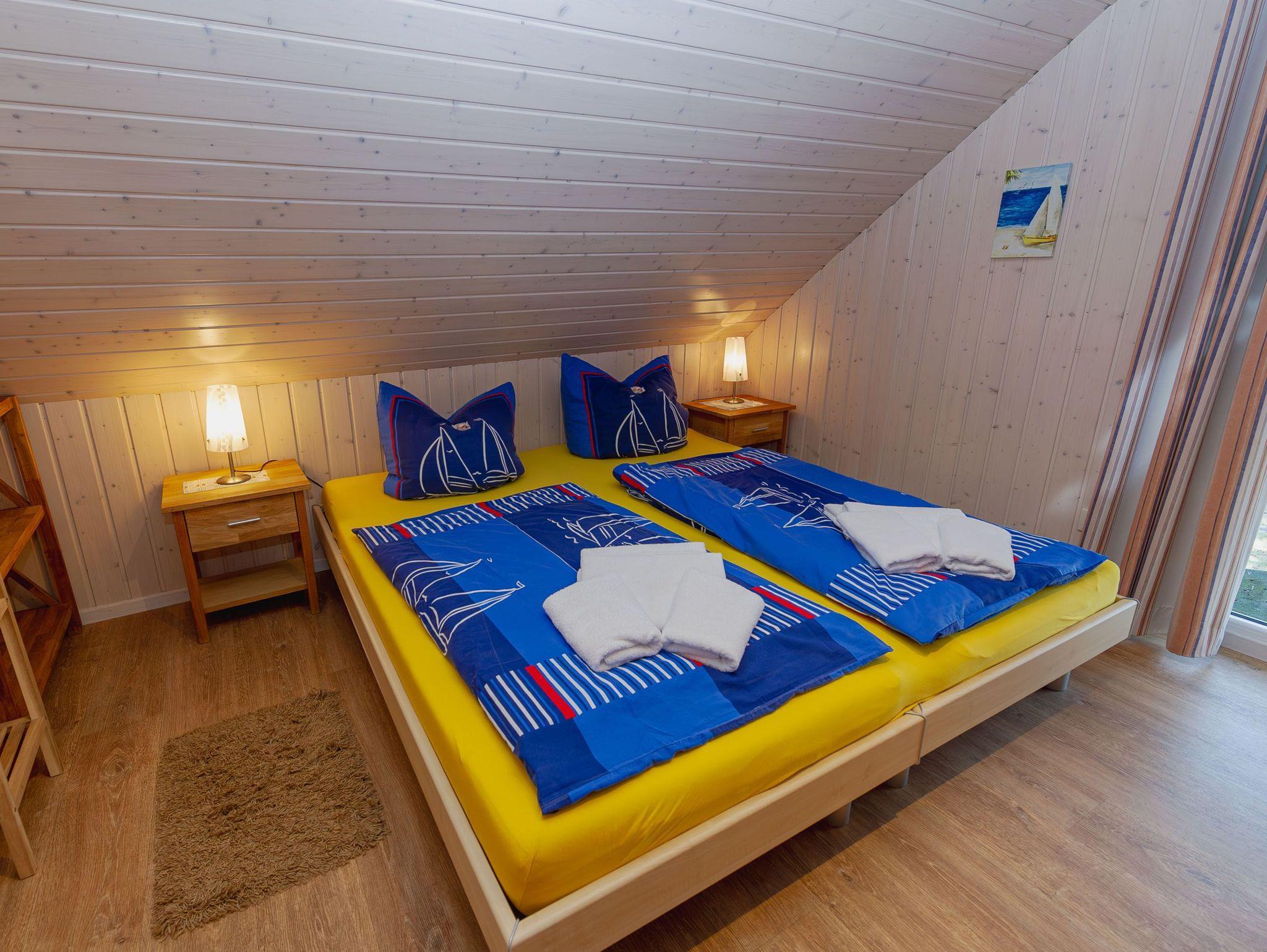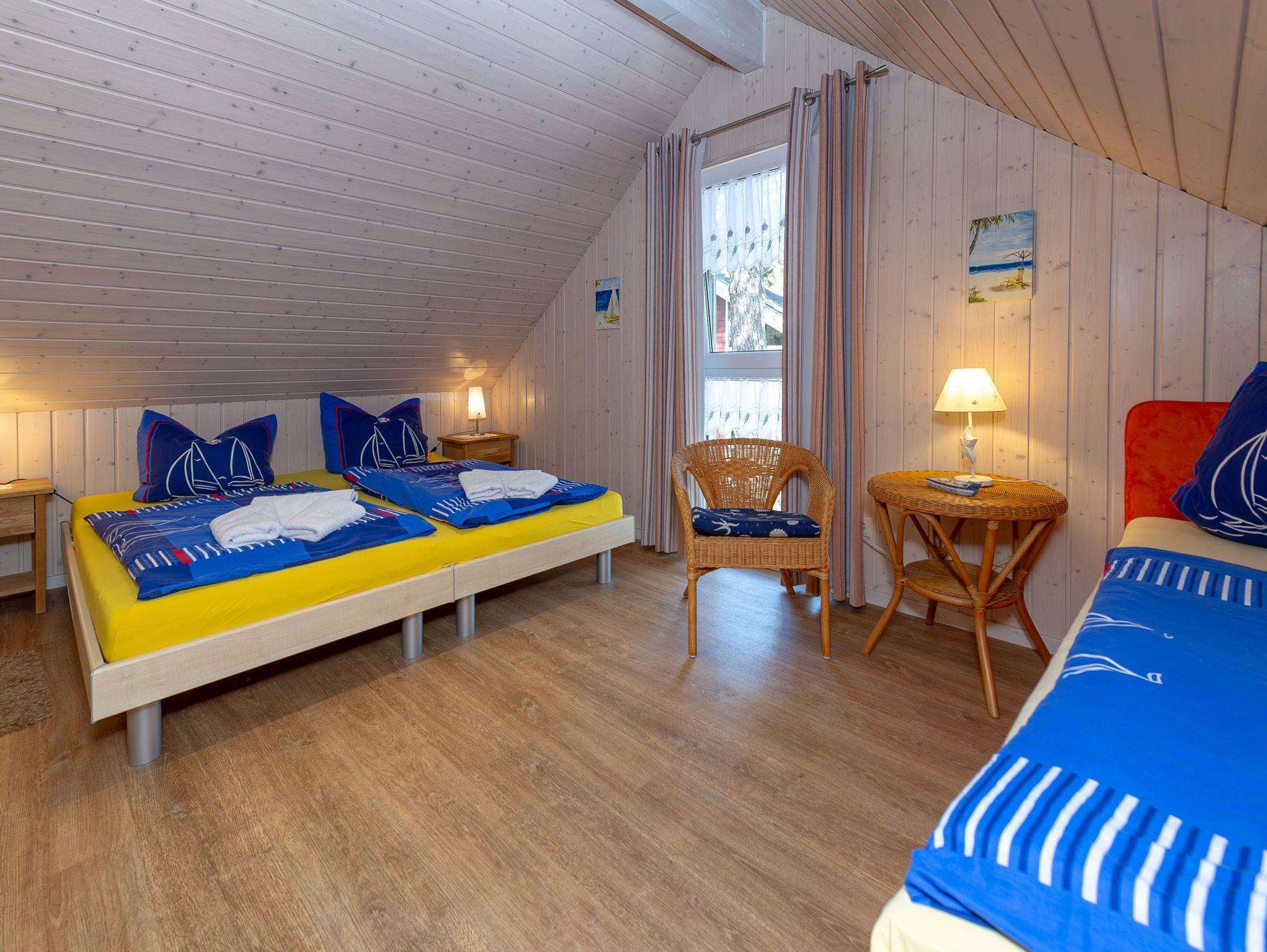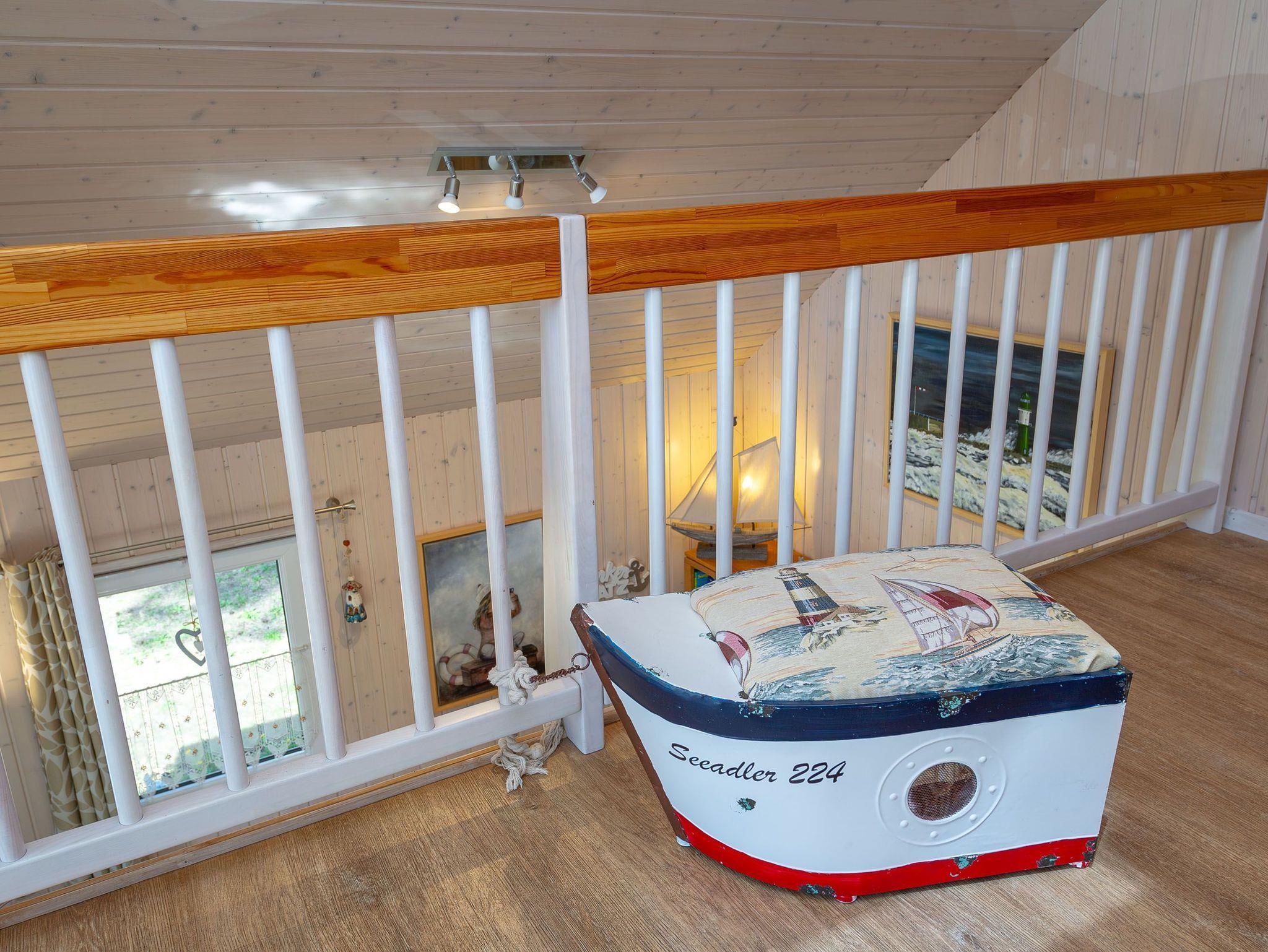 Im Obergeschoss finden Sie unter gemütlichen Dachschrägen ein weiteres Schlafzimmer mit einem Doppelbett und einem Einzelbett vor. In der offenen Galerie bietet eine Relaxecke mit zwei bequemen Schwingstühlen ein zauberhaftes Plätzchen mit Blick nach draußen.