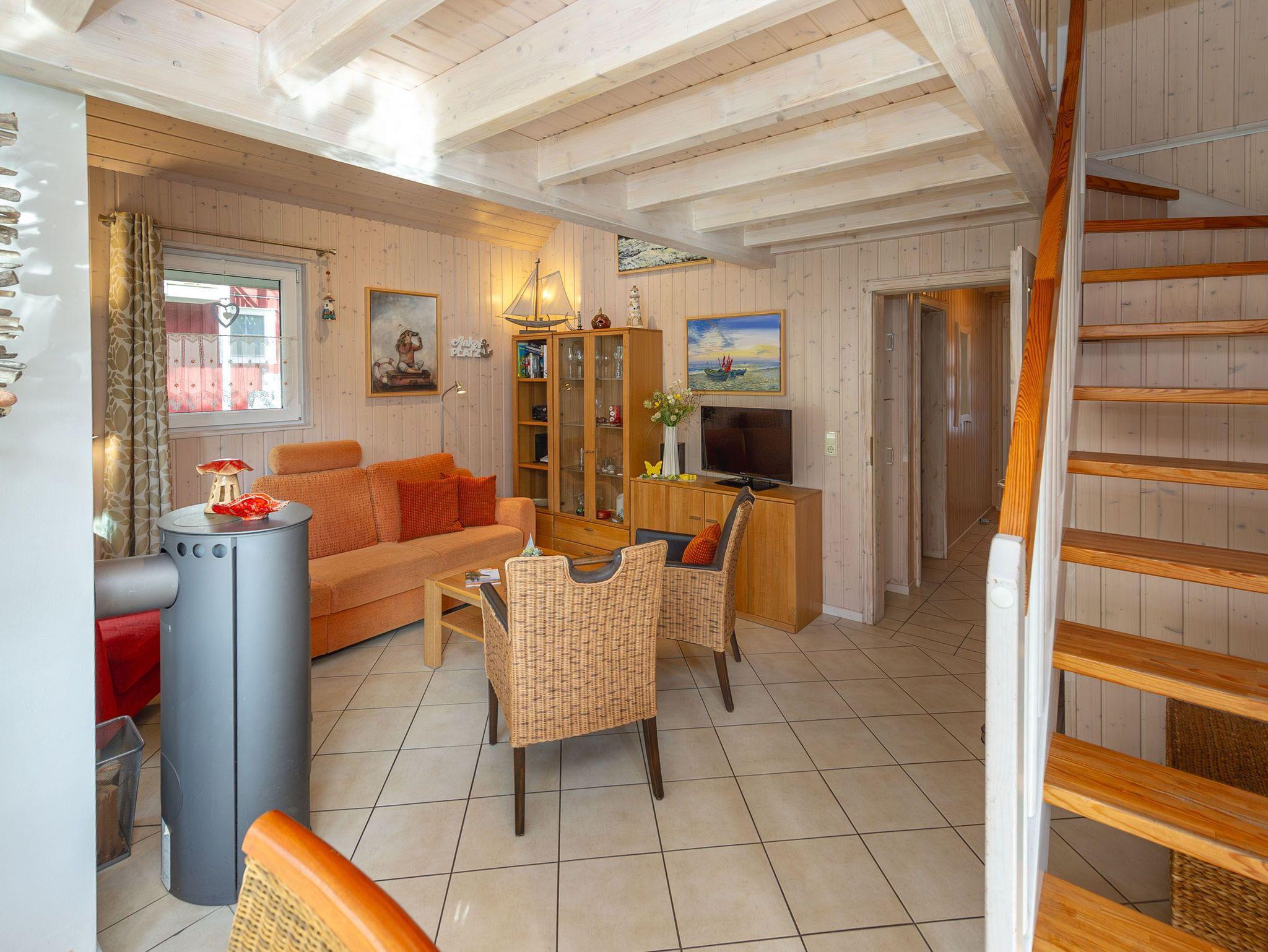 Im Erdgeschoss, ausgestattet mit einer Elektro-Fußbodenheizung, finden Sie Ihr Wohnzimmer mit einer Sitzecke, einem Kaminofen sowie Flachbild-TV und Stereoanlage vor. W-LAN ist selbstverständlich kostenfrei verfügbar.