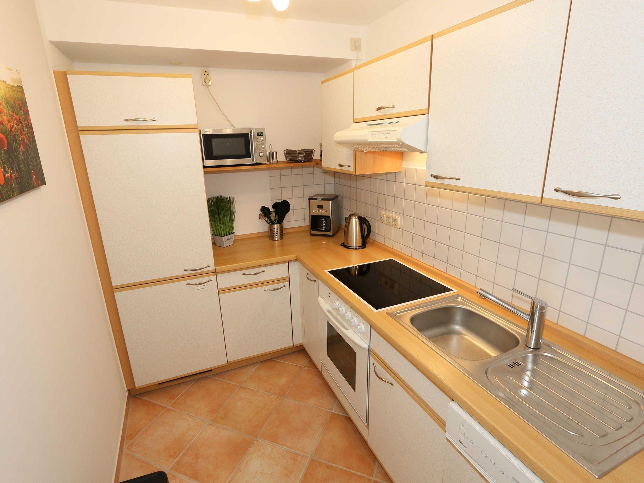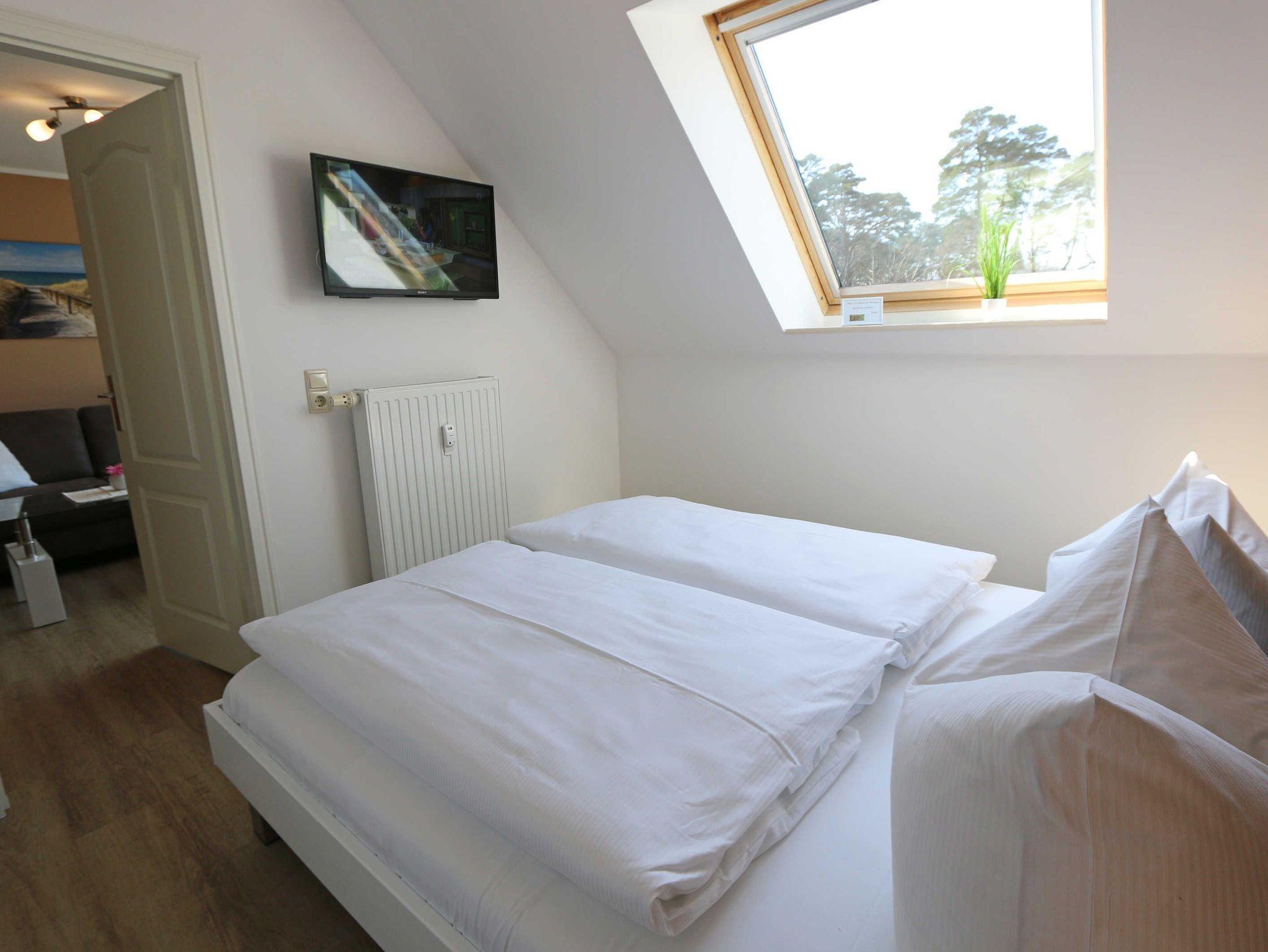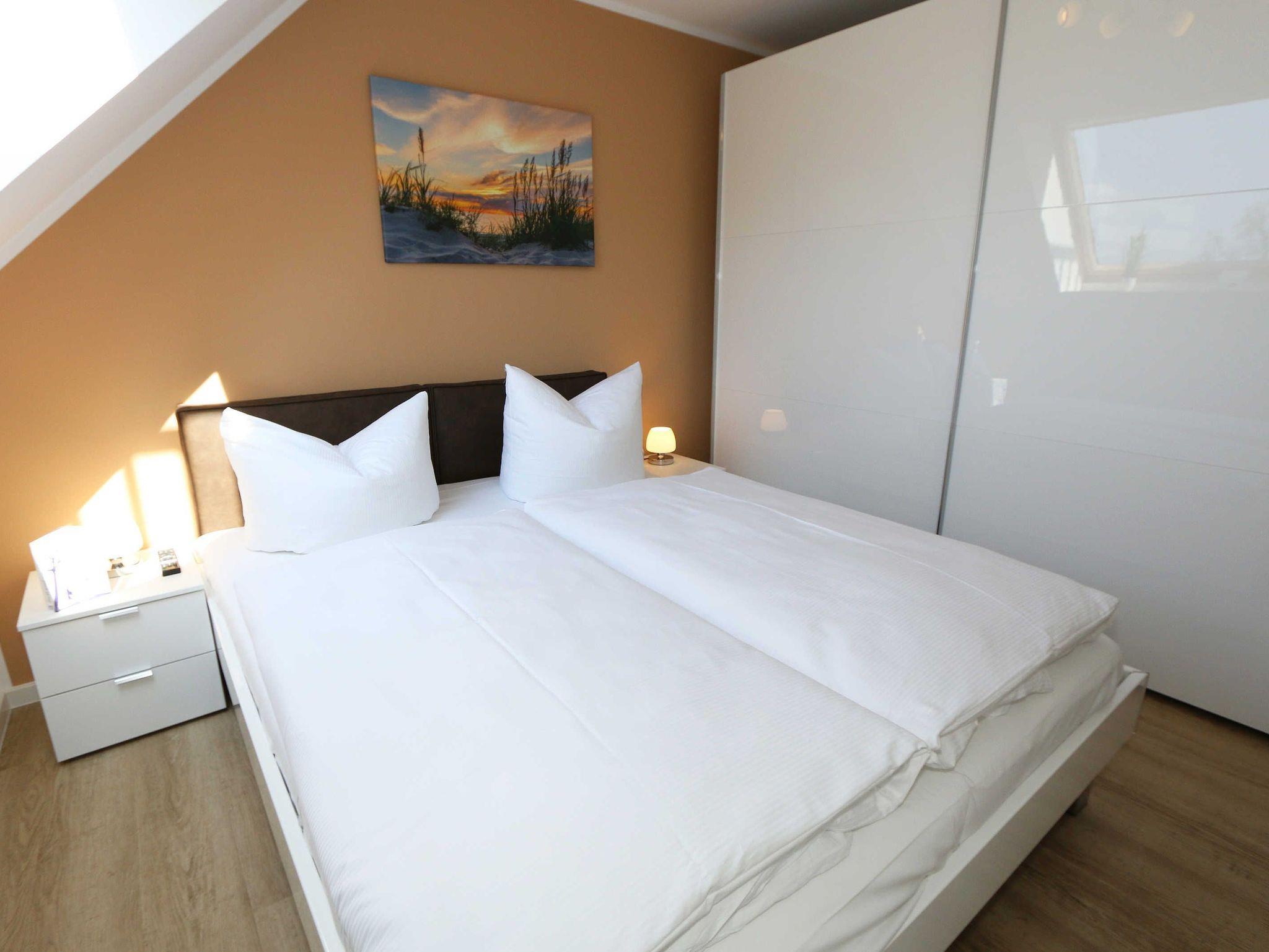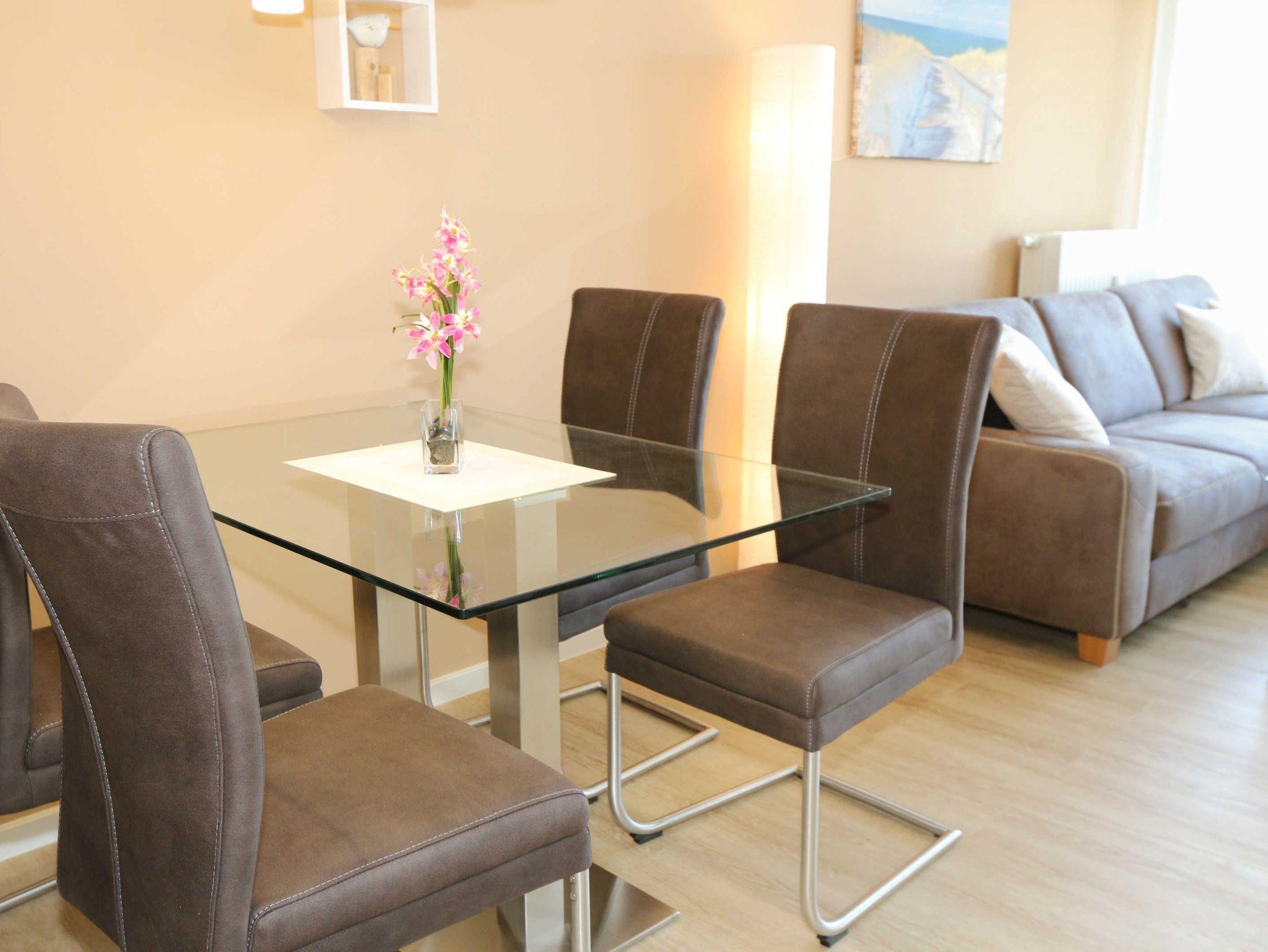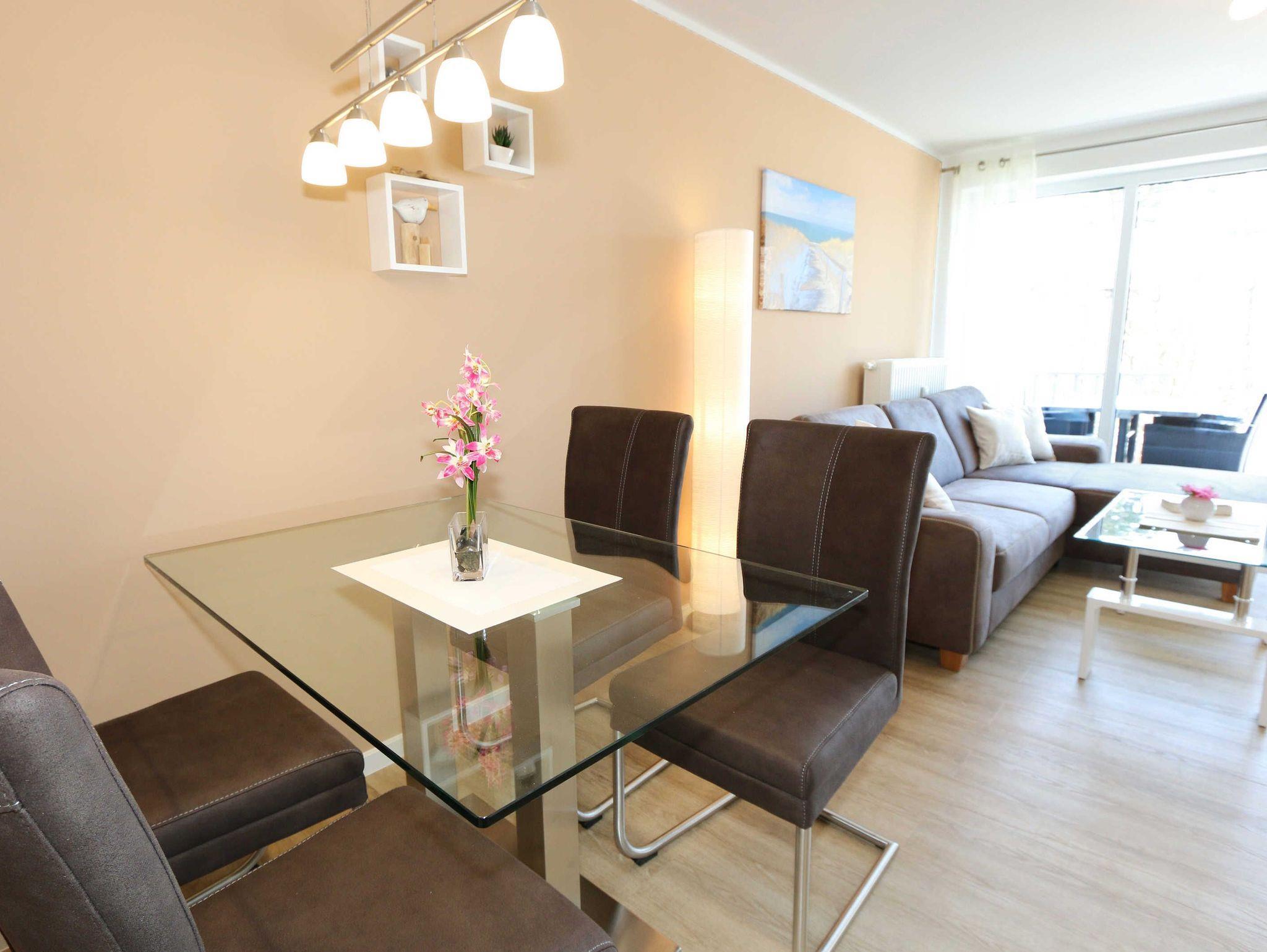 Die helle und modern eingerichtete 2-Raum-Nichtraucher-Ferienwohnung Ostseebrise Nr. 10 befindet sich in der 2. Etage und bietet mit Ihren ca. 47 m² Platz für max. 2 Erwachsene + 1 Kind bis 17 Jahre. Der geräumige Wohn- & Essbereich ist mit einer gemütlichen Couch (Aufbettung für 3. Person, 1,20 m x 2,00 m), Couchtisch, Leselampe, TV-Board mit Smart-TV, Blu-Ray Player und Mini-Stereo-Anlage sowie einem großen Esstisch ausgestattet. Eine kleine Auswahl an Gesellschaftsspielen und DVDs steht Ihnen zur Verfügung. Ein Internetanschluss (WLAN) ist für Sie zusätzlich inklusive. Den bestuhlten Balkon (Süd/Südwest) mit Sonnenschirm erreichen Sie vom Wohnbereich. Die separate Küche umfasst einen Geschirrspüler, Cerankochfeld, Backofen, Kühlschrank mit Gefrierfach, Mikrowelle, Kaffeemaschine, Senseo Padmaschine, Wasserkocher, Toaster und diverse Küchenutensilien. Das helle Schlafzimmer verfügt über ein Doppelbett mit 7-Zonen Tonnentaschenfederkern Matratzen (1,60m x 2,00m), verstellbare Lattenroste, Nachttischablagen, einen großen Kleiderschrank sowie ein LED-Flachbildschirm. Verdunklungsrollos sorgen für einen erholsamen Schlaf. Das geflieste Bad wird durch eine Dusche, Waschtisch, Fön, Kosmetikspiegel, WC und Handtuchheizkörper abgerundet. Im Flurbereich befindet sich eine Garderobe mit Spiegel und ein Schuhschrank. Angrenzend befindet sich ein kleiner Abstellraum. Von Ihrem Tiefgaragenstellplatz (Nr. 10, Einfahrtshöhe: 1,90m) gelangen Sie bequem mit dem Aufzug zu Ihrer Ferienwohnung. Ihre mitgebrachten oder geliehenen Fahrräder können in dem zur Wohnung gehörenden abschließbaren Keller (Nr.10) abgestellt werden. Haustiere sind nicht erlaubt. Die Erstausstattung eines Wäschepaketes (komplette Bettwäsche, 1 Duschhandtuch, 1 kleines Handtuch) können Sie bis 14 Tage vor Anreise gegen einen Aufpreis dazu buchen oder durch eigene ergänzen. Ab 2 gebuchten Paketen erhalten Sie einmalig 1 Geschirrhandtuch und 1 Duschvorleger dazu.