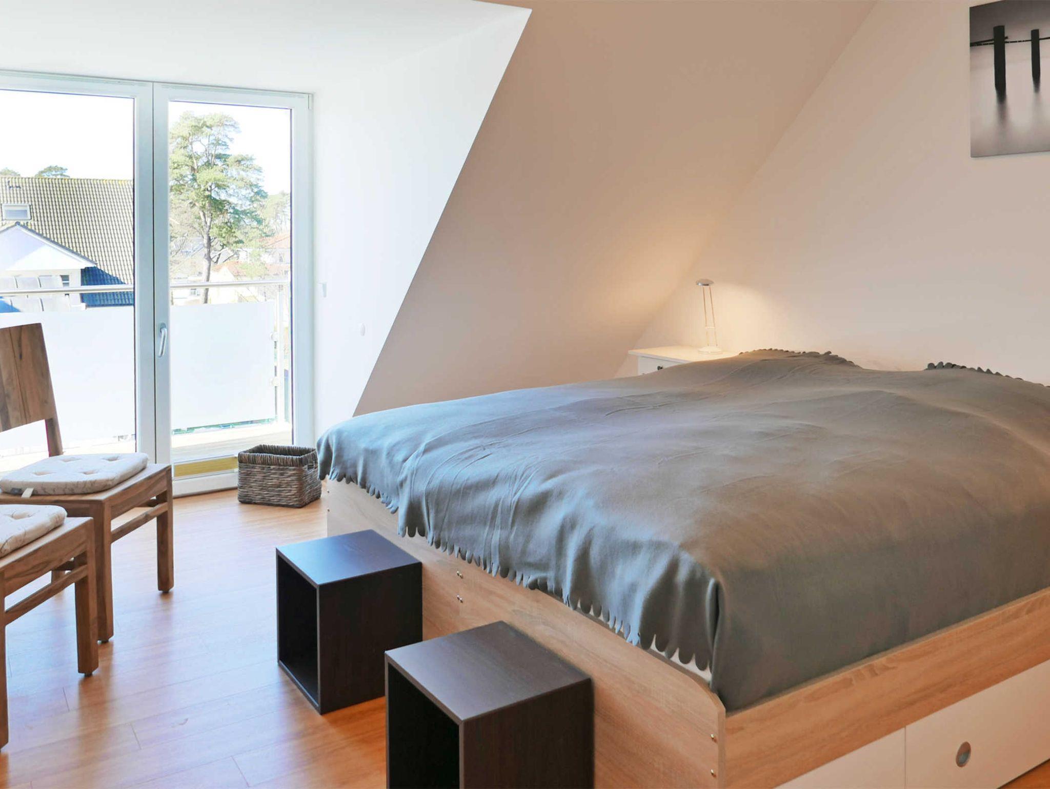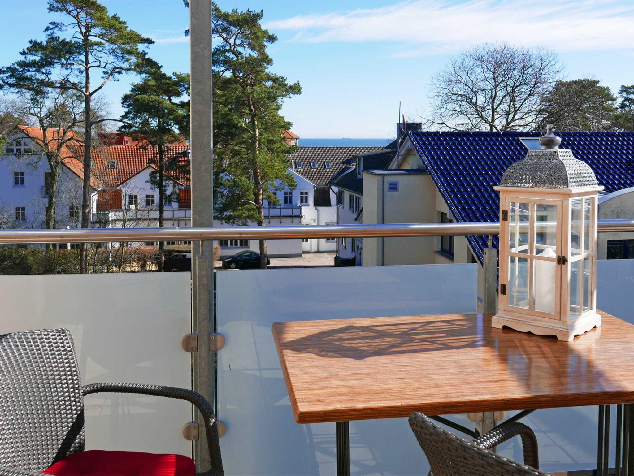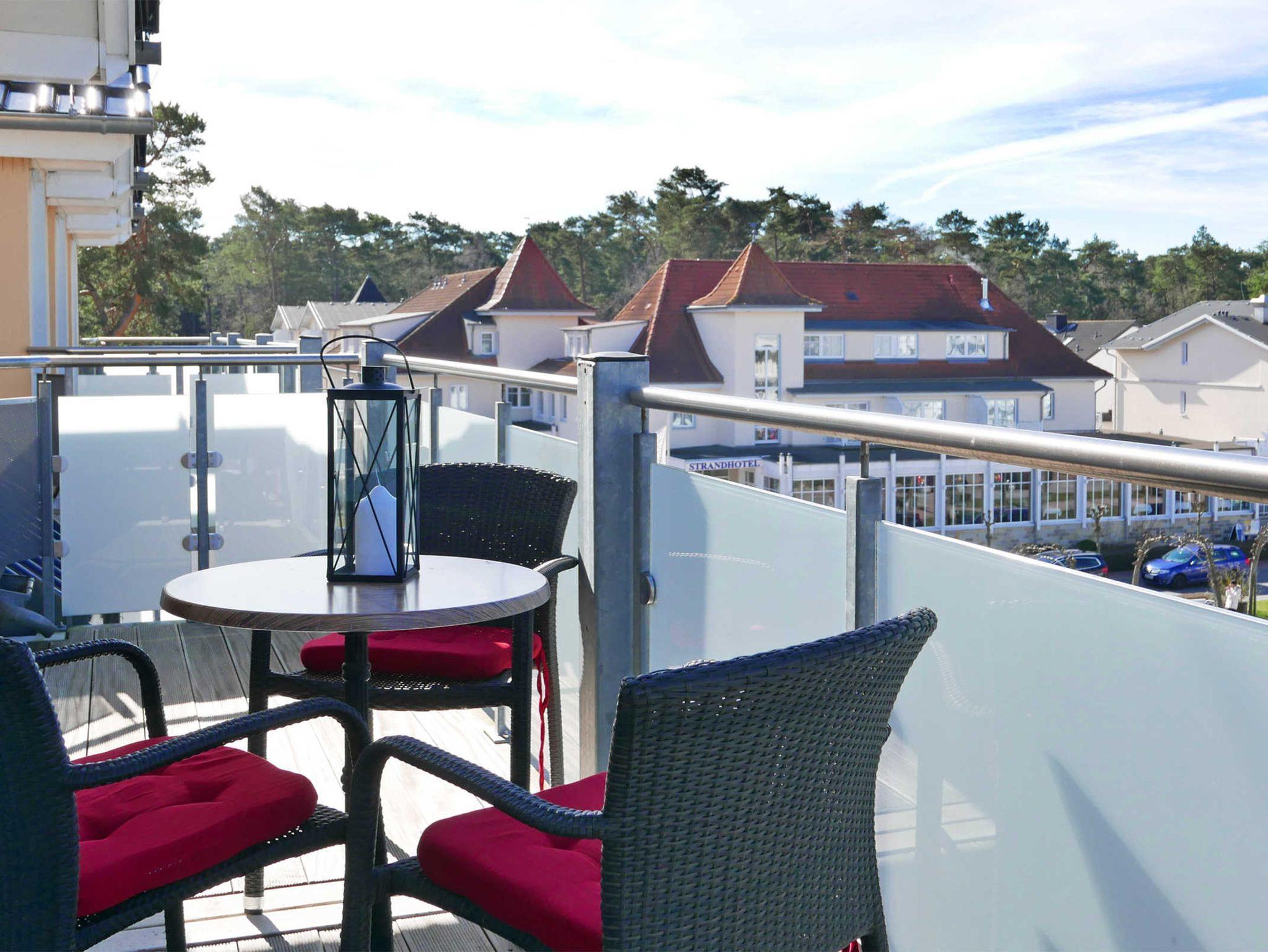 Große moderne 100 qm Ferienwohnung für bis zu 6 Personen, hell und lichtdurchflutet mit tollen Blicken bis zum Meer, barrierefreundlich eingerichtet mit 2 barrierefreien Duschen/WC, Terrasse mit Glasdach und Meerblick, Ein Fitnessraum und eine Saunalandschaft ist im Haus, Aufzug bis zur Wohnung, Parkplatz, WLAN. Gelegen in der Strandstr. 31, direkt an der schönsten Straße von Baabe mit Blick bis zum Meer