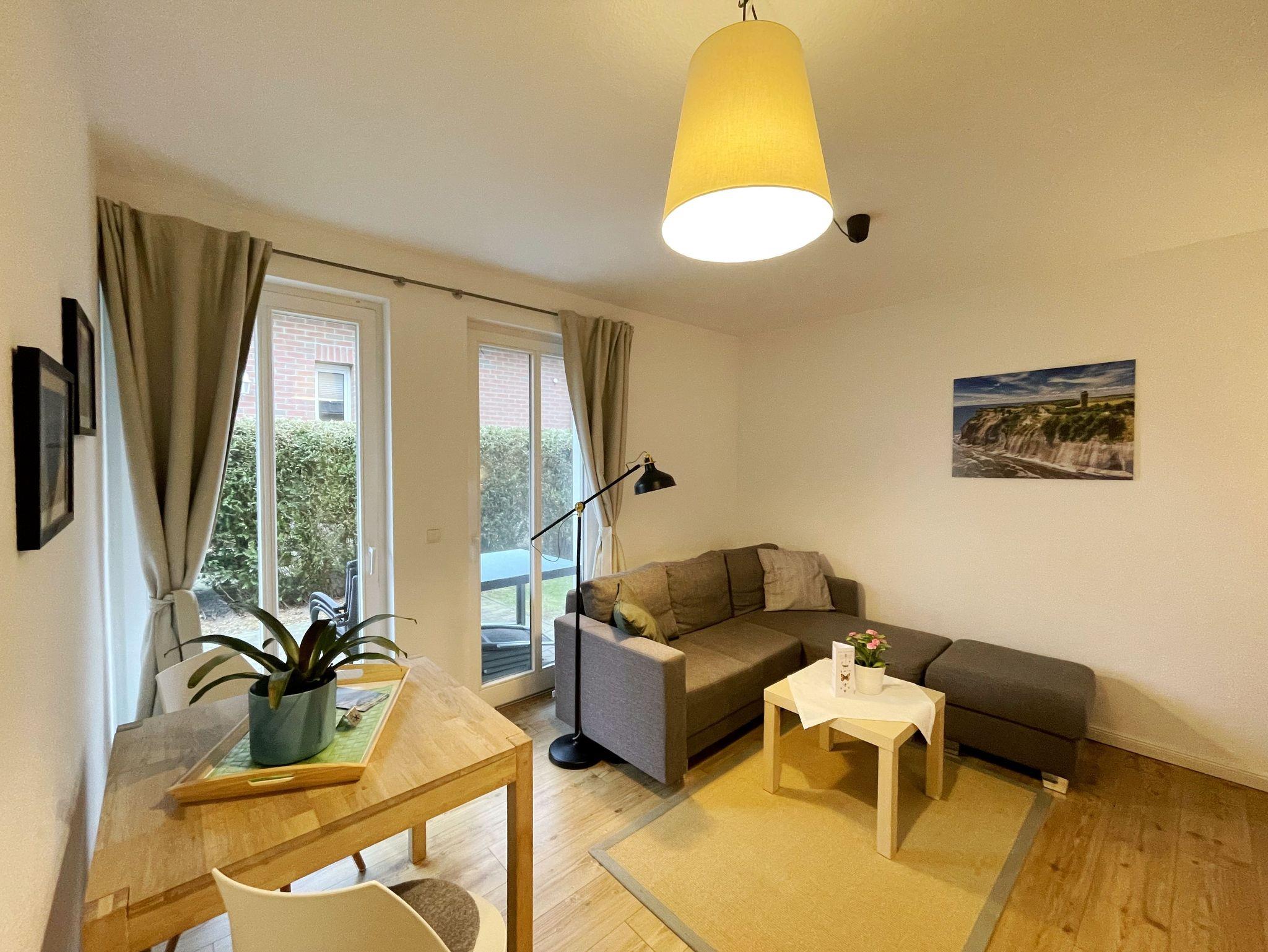 Die 45 qm Nichtraucher-Wohnung ist modern, hell und im skandinavischen Stil eingerichtet. Sie bietet Ihnen Platz für max. 2 Personen. Fotografien der Insel lassen Sie beim Eintreten sofort auf Rügen ankommen. Über einen kleinen Flur indem sich auch die Küchenzeile befindet, gelangen Sie direkt in den Wohn- und Essbereich. Die bodentiefe Terrassentür und Fenster mit Insektenschutz sorgen für viel Tageslicht. Das Wohn-Esszimmer ist gemütlich gestaltet und lädt zum Entspannen ein. Es verfügt über eine bequeme Eckcouch mit beweglichem Fußteil, ein Couchtisch und eine Stehlampe. Hier können Sie es sich gemütlich machen, einen Film auf dem 32-Zoll-Smart-TV genießen oder der Musik aus dem Bluetooth-Radio lauschen. Ein WLAN-Anschluss rundet den technischen Bereich ab. In dem Sideboard finden Sie ausreichend Stauraum für Ihre persönlichen Gegenstände. Zusätzlich befindet sich dort eine Spielesammlung sowie eine kleine Auswahl an Büchern. Die Fenster sind mit Plissees ausgestattet, die Sonnen- und Sichtschutz bieten. Der angrenzende Esstisch rundet den Raum ab. Von hier aus gelangen Sie auch auf ihre eigene, teilüberdachte und bestuhlte Terrasse mit Süd-Ausrichtung, die an warmen Tagen ganztägig zum Verweilen in der Sonne einlädt. Zusätzlich haben Sie hier einen Sonnenschirm sowie zwei Lounge-Sonnenliegesessel. Der kleine, eigene Gartenabschnitt wird durch eine Hecke vor neugierigen Blicken geschützt und ist durch einen Zaun mit Tor vom Gemeinschaftsgarten getrennt. Auch Ihr Vierbeiner kann so entspannt draußen Verweilen. Hier können Sie es sich gemütlich machen, ein gutes Buch lesen oder die Rügensonne genießen. Die Pantry-Küche beinhaltet alles, was Sie zur Zubereitung Ihrer Mahlzeiten benötigen. Wie ein Induktionsherd, ein Kühlschrank mit Gefrierfach, eine Mikrowelle und ein Geschirrspüler. Darüber hinaus steht Ihnen sowohl eine Filter-Kaffeemaschine als auch eine Nespresso-Kapselmaschine, ein Wasserkocher, ein Toaster, ein Messerblock sowie viele Kochutensilien zur Verfügung. Das moderne Schlafzimmer verfügt über ein komfortables Doppelbett (1,80m x 2,00m) mit einer Wand-Nachttischlampe, verstellbare Lattenroste, Insektenschutzgitter sowie ein geräumiger und offener Kleiderschrank. Die bodentiefen Fenster sind neben den Plissees mit Verdunklungsvorhängen ausgestattet, um Ihnen einen erholsamen Schlaf zu ermöglichen. Das kompakte, innenliegende Bad ist funktional gestaltet und verfügt über eine Eck-Dusche, ein Fön, ein WC, ein Insektenschutzgitter und ein Waschplatz. Eine Ablage bietet Platz für Kosmetikutensilien und ein beleuchteter Spiegel sorgt für die richtige Ausleuchtung. Ebenso finden Sie in Ihrer Wohnung ein Wäscheständer, Reinigungsutensilien und ein Staubsauger vor. Zusätzlich zu Ihrem eigenen kleinen Außenbereich steht Ihnen ein 2500 qm großer Gemeinschaftsgarten zur Verfügung, der zum Verweilen einlädt. Dort finden Sie Strandkörbe Sitzgelegenheiten sowie einen Grillplatz, den Sie gemeinsam mit anderen Gästen nutzen können. Ein Haustier ist gegen eine Gebühr ein gern gesehener Gast. Ihre mitgebrachten oder geliehenen Fahrräder können Sie auf dem Grundstück abstellen. Ein PKW-Stellplatz befindet sich direkt am Haus. Die Erstausstattung eines Wäschepaketes (komplette Bettwäsche, 1 Duschhandtuch, 2 kleine Handtücher) können Sie bis 14 Tage vor Anreise gegen einen Aufpreis dazu buchen oder durch eigene ergänzen. Ab 2 gebuchten Paketen erhalten Sie einmalig 1 Geschirrhandtuch und 1 Duschvorleger hinzu.