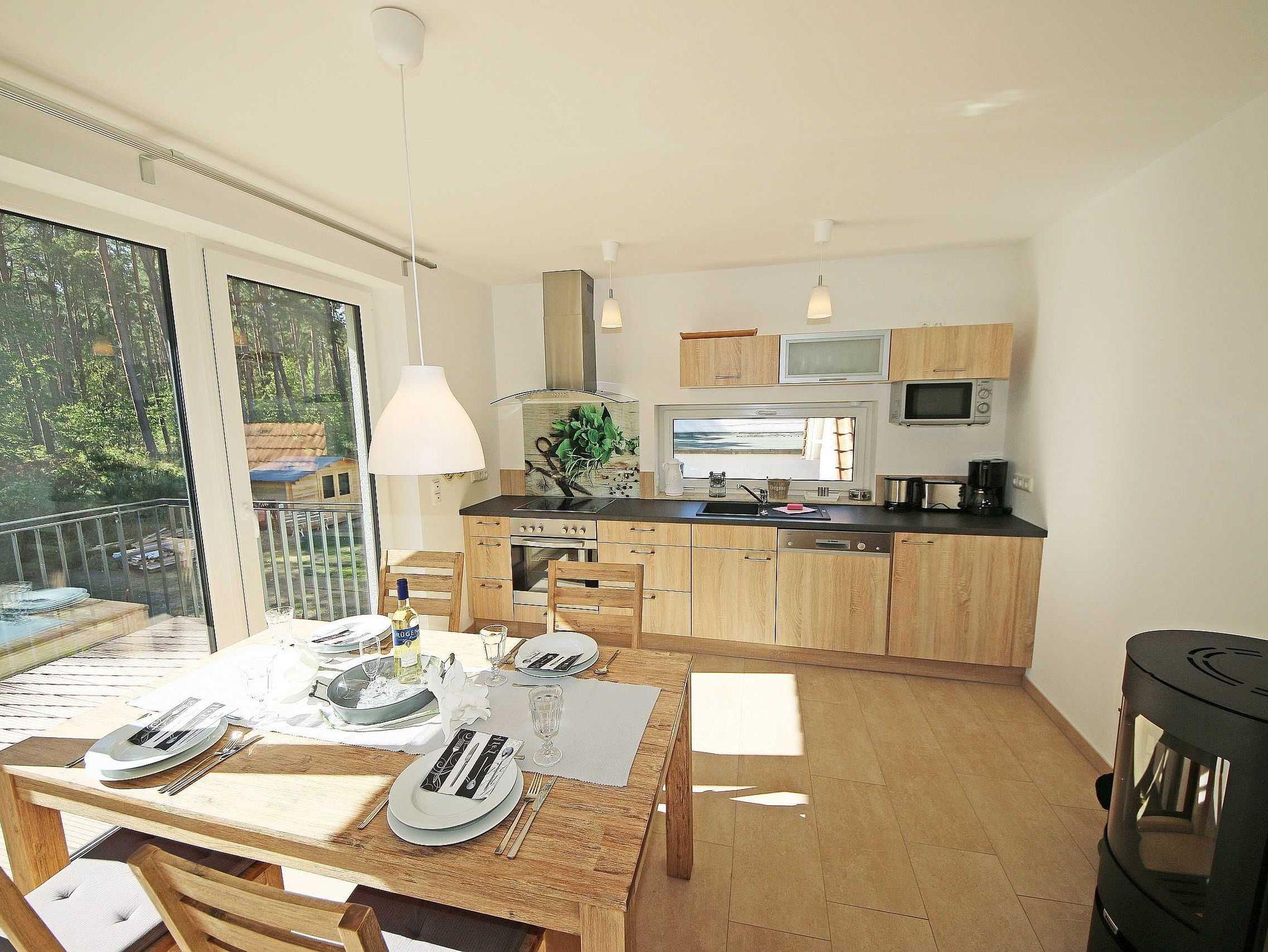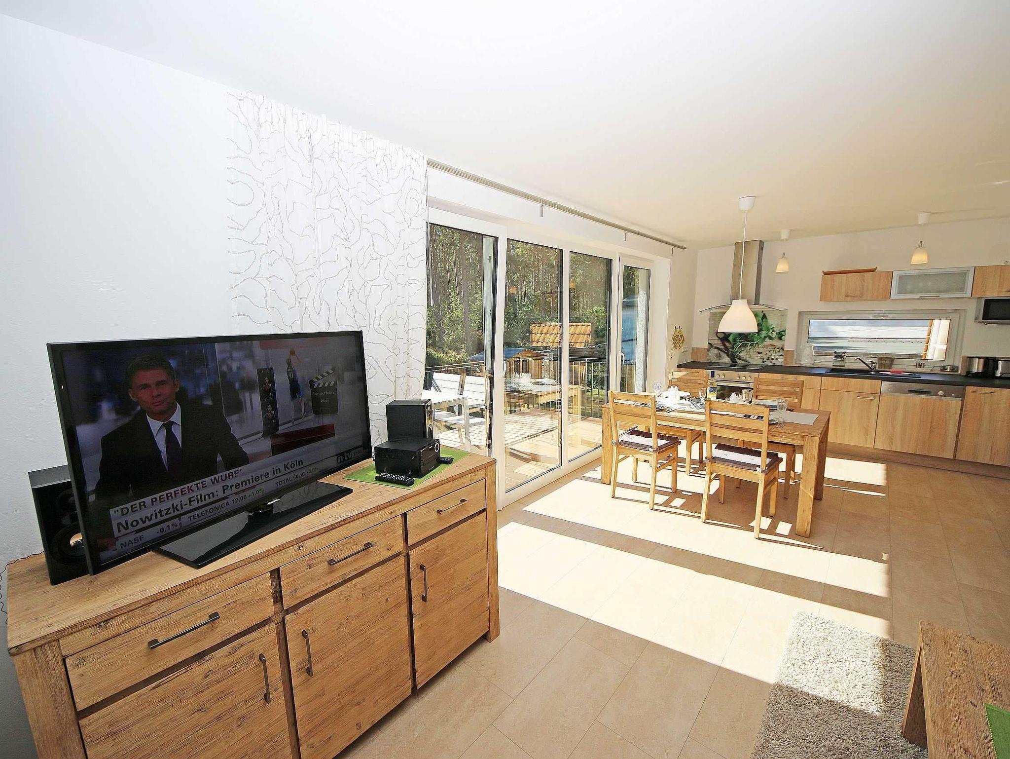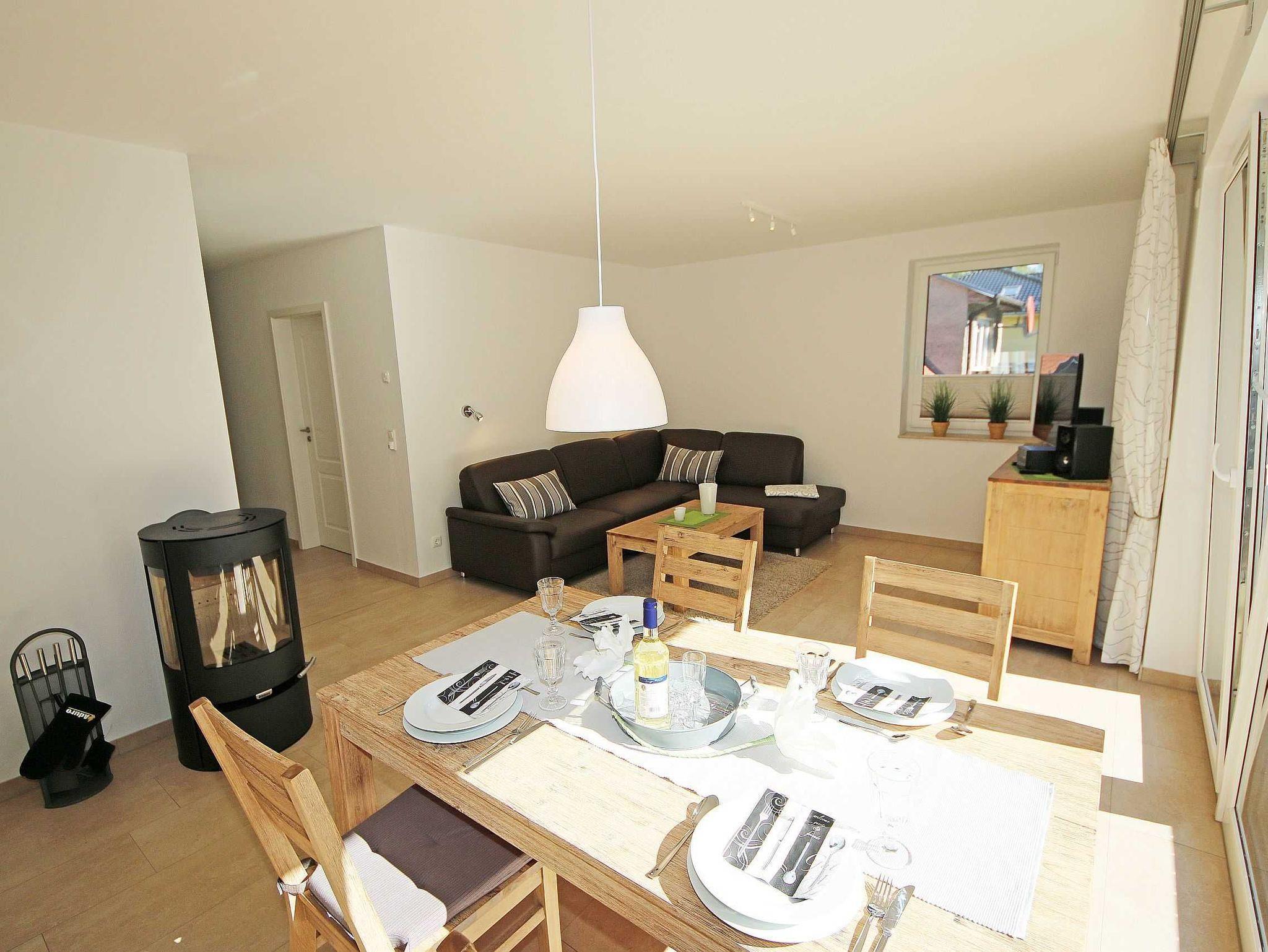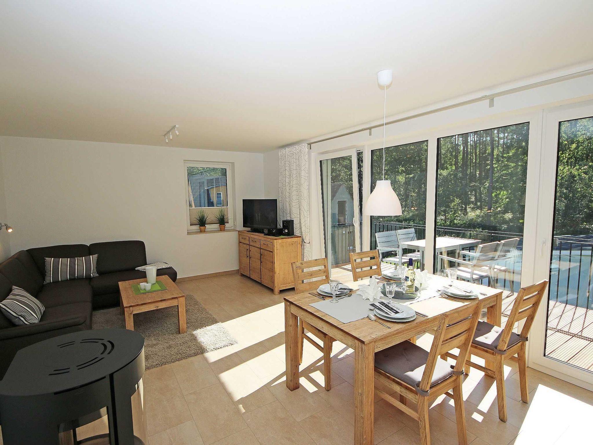 Die gebaute, modern eingerichtete Ferienwohnung hat eine Größe von ca. 65 qm und ist mit ausgewählten Stilelementen versehen. Sie bietet Platz für 2 bis 4 Erwachsene und 1 Kleinkind bis 3 Jahre im Kinderreisebett. Die Allergikerfreundliche Nichtraucherwohnung befindet sich im Obergeschoss. Zu der Wohnung gehört ein bestuhlter und mit Sonnenschirm versehener Balkon mit Blick in den Küstenwald. Ein Grillplatz befindet sich im Gartenbereich. Der Wohnbereich ist mit einer gemütlichen Eckcouch (Leder), Couchtisch; Leselampe sowie Sideboard ausgestattet. Zu den Unterhaltungsmöglichkeiten in den Abendstunden oder bei schlechtem Wetter gehören ein Smart-TV, Blu-Ray-Player sowie eine Hi-Fi Kompaktanlage mit CD- und USB-Anschluss. Auch auf einen Internetanschluss (WLAN) brauchen Sie nicht verzichten. Dieser ist inklusive. Ein Kaminofen für wohlige Wärme rundet die Gemütlichkeit ab. Kaminholz ist nicht inklusive. Die komplett ausgestattete Küchenzeile mit Ceranfeld, Backofen, Geschirrspüler, Kühlschrank mit Eisfach, Mikrowelle, Kaffeemaschine, Wasserkocher, Toaster, div. Küchenutensilien wird durch den Essplatz am Panoramafenster komplettiert. Eines der 2 Schlafräume ist mit einem Doppelbett (1,80m x 2,00m), Nachttischablagen und einem geräumigen Kleiderschrank ausgestattet. Das zweite Schlafzimmer hat zwei Einzelbetten (0,90m x 2,00m), Nachttischablagen und einen Kleiderschrank sowie einen LCD-TV. Die Schlafräume sind mit einem modernen Vinylbelag versehen und können für einen angenehmen Schlaf abgedunkelt werden, zudem sind sie mit Insektenschutzgitter versehen. In allen anderen Räumlichkeiten sind Fliesen verlegt worden. Für eine angenehme Wärme sorgt die im ganzen Haus verlegte Fußbodenheizung. Das Tageslichtbad wird durch eine flache Duschwanne, einen Waschtisch, ein WC, Fön und einem beheizten Handtuchhalter abgerundet. Das Gäste-WC wurde zusätzlich mit einem beheizten Handtuchtrockner ausgestattet. Für unsere kleinen Gäste ist 1x Hochstuhl inklusive. Haustiere sind nicht erlaubt. Ein PKW-Stellplatz befindet sich auf dem Grundstück. Mitgebrachte oder geliehene Fahrräder können Sie im hauseigenen Abstellraum unterbringen. Die Erstausstattung eines Wäschepaketes (komplette Bettwäsche, 1 Duschhandtuch, 1 kleines Handtuch) können Sie bis 14 Tage vor Anreise gegen einen Aufpreis dazu buchen oder durch eigene ergänzen. Ab 2 gebuchten Paketen erhalten Sie einmalig 1 Geschirrhandtuch und 1 Duschvorleger hinzu.