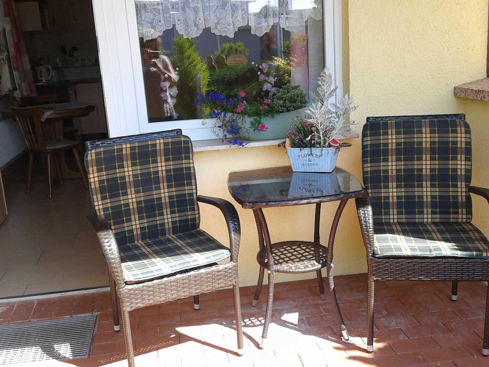 kleine Terrasse mit Sitzecke direkt vor der Fewo.