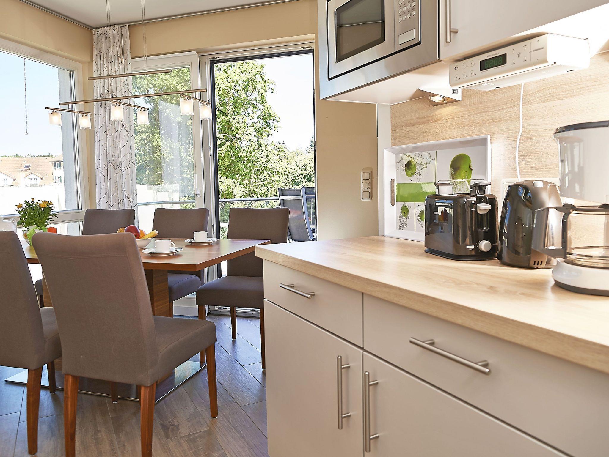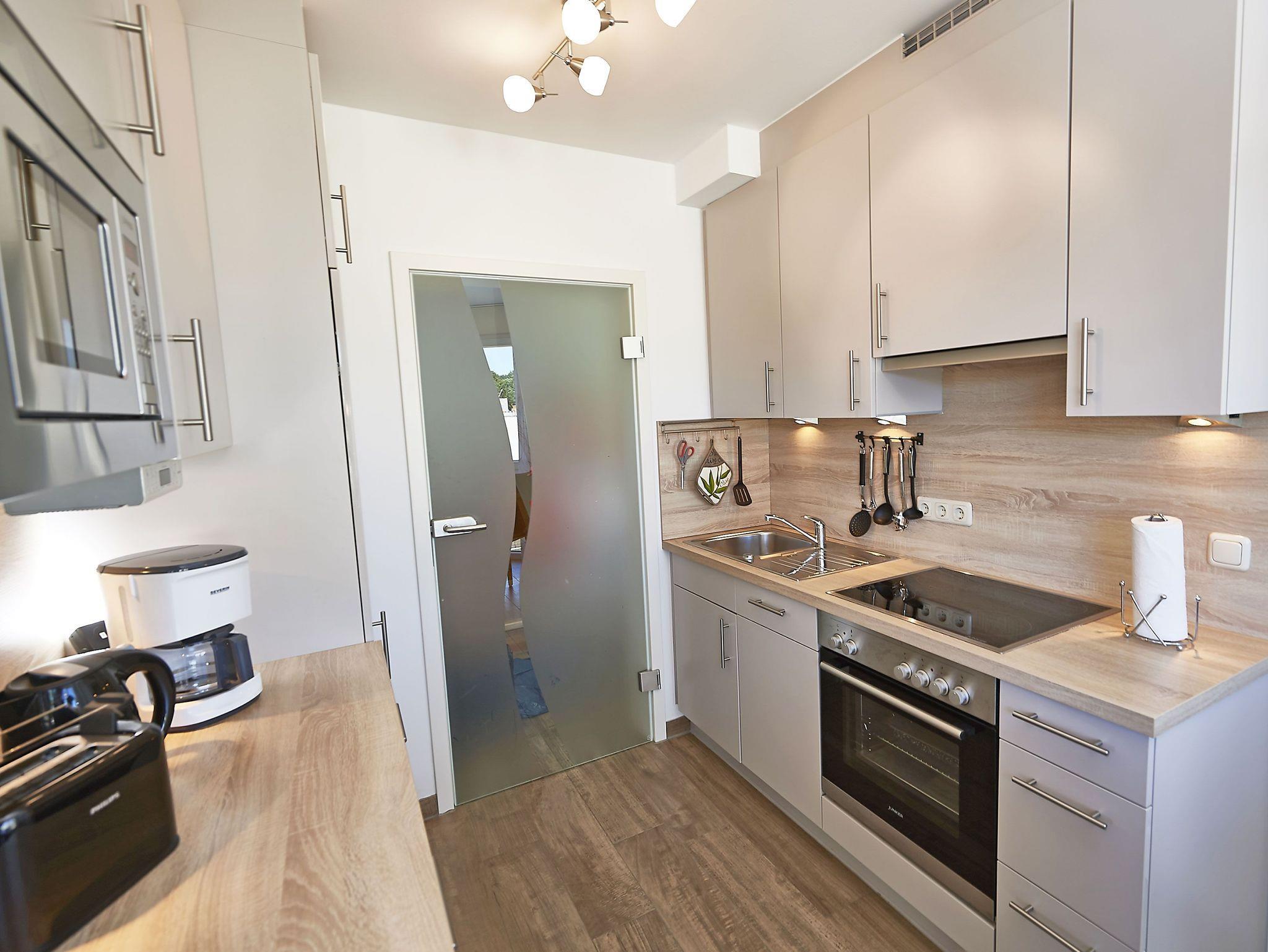 Die offene Küche wurde harmonisch in diesen Raum integriert und ist voll ausgestattet mit Geschirrspüler, Kühlschrank mit Gefrierfach, Backofen, Mikrowelle, Kaffeemaschine, Wasserkocher, Toaster und diversem Kleininventar.