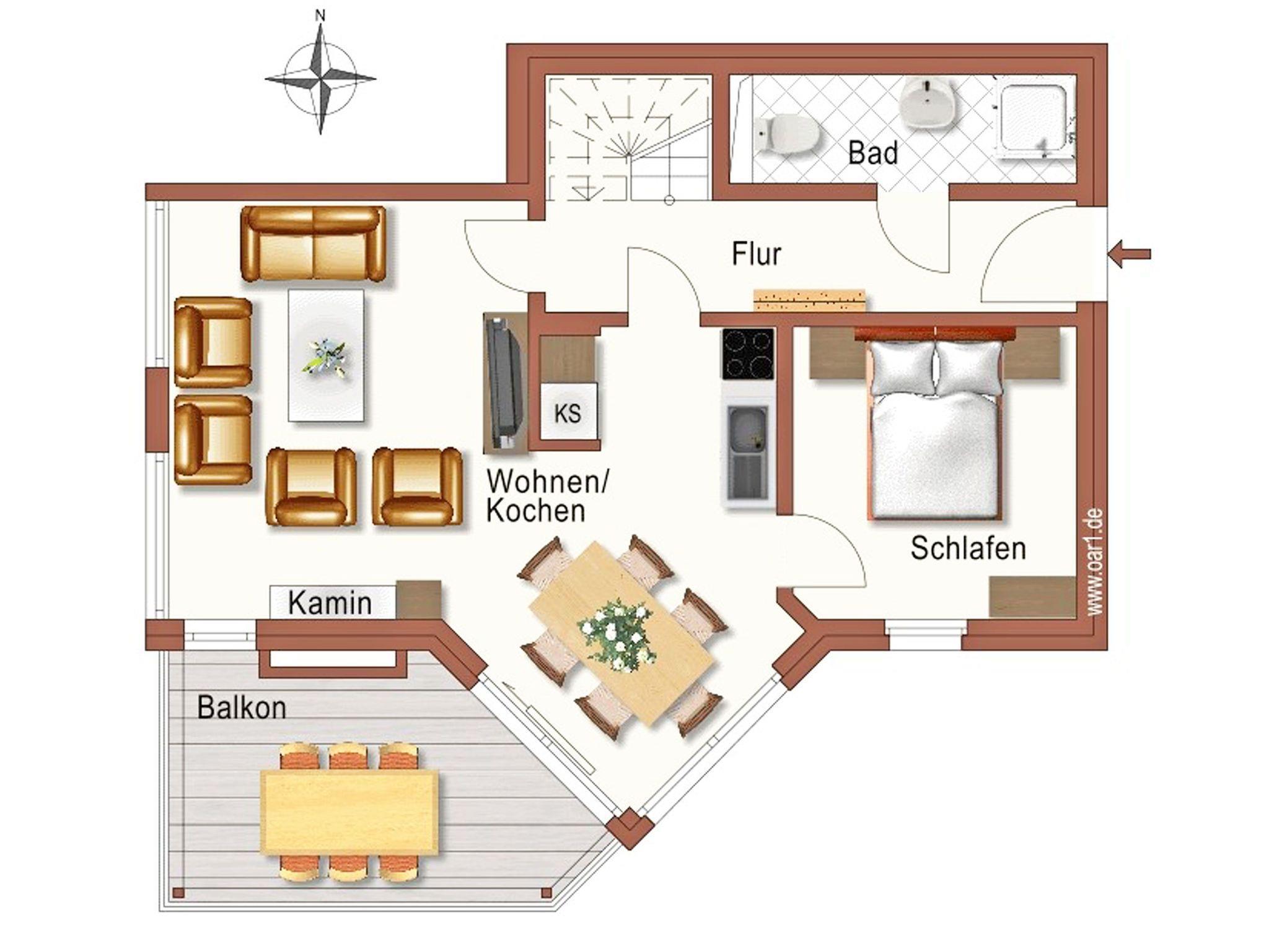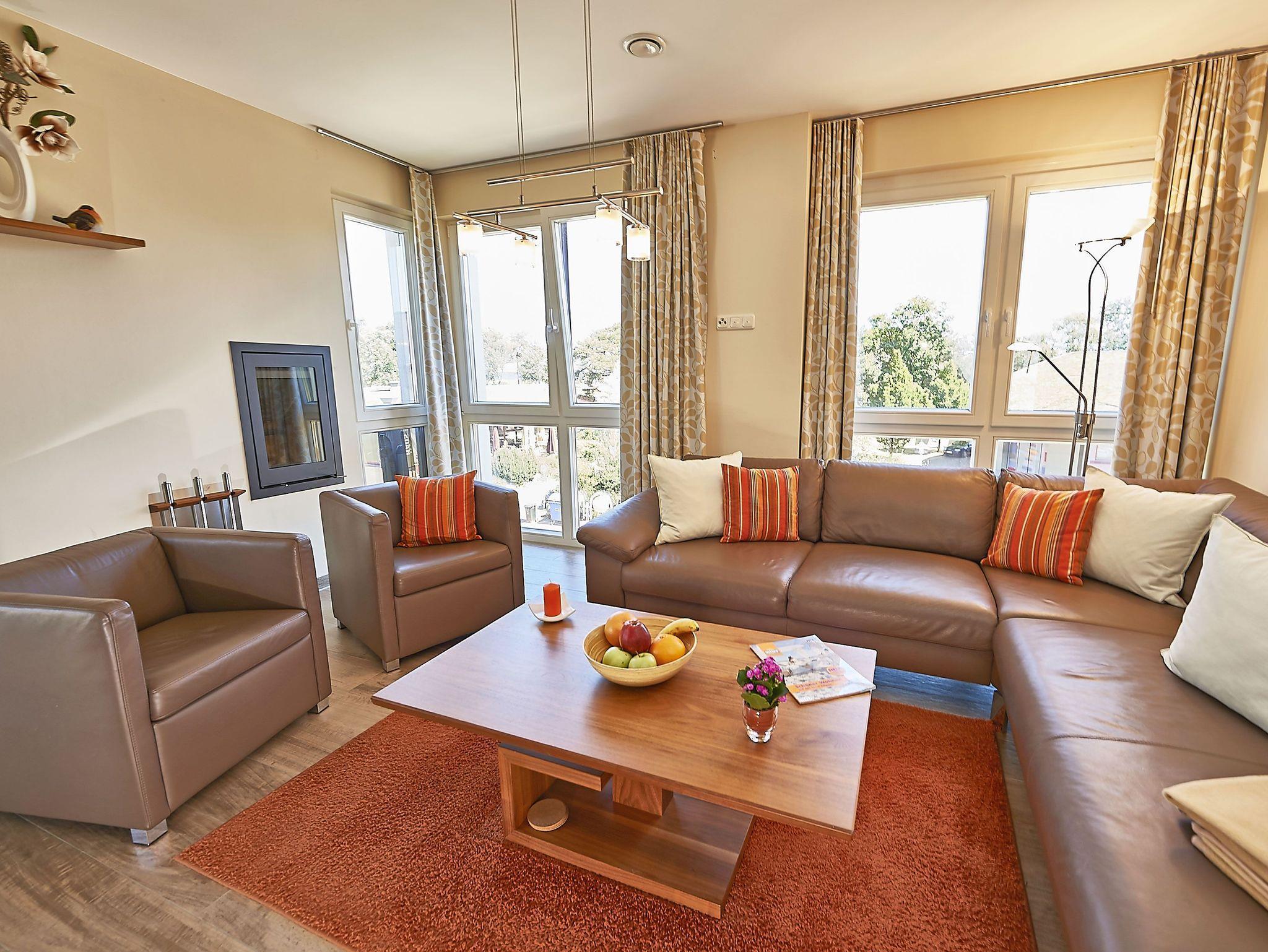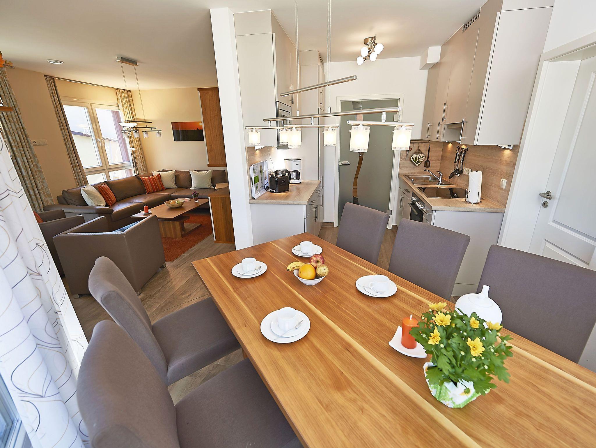 Auf der unteren Ebene finden Sie den hochwertig ausgestatteten Wohn- und Essbereich mit einem Esstisch für 6 Personen.[nbsp] Entspannen Sie sich abends auf der gemütlichen Sofaecke und dem Sessel bei knisterndem Kaminfeuer (Kaminholz ist bitte selbst mitzubringen). Ein Flachbild-TV, ein Radio und kostenfreies W-LAN gehören ebenfalls zur Ausstattung.