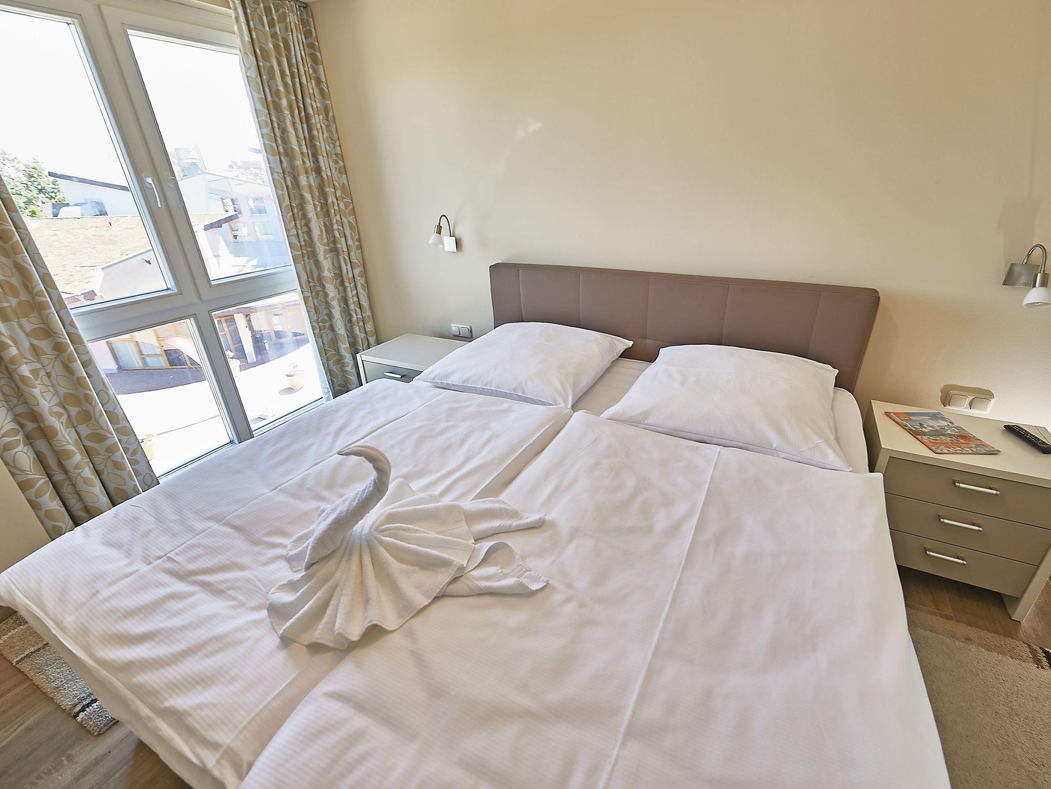 Über eine Treppe gelangen Sie in das obere Geschoss des Appartements. Hier gibt es 4 weitere Schlafmöglichkeiten. Die beiden Schlafzimmer sind ebenfalls mit je einem Boxspringbett (180 x 200 cm) und TV ausgestattet.