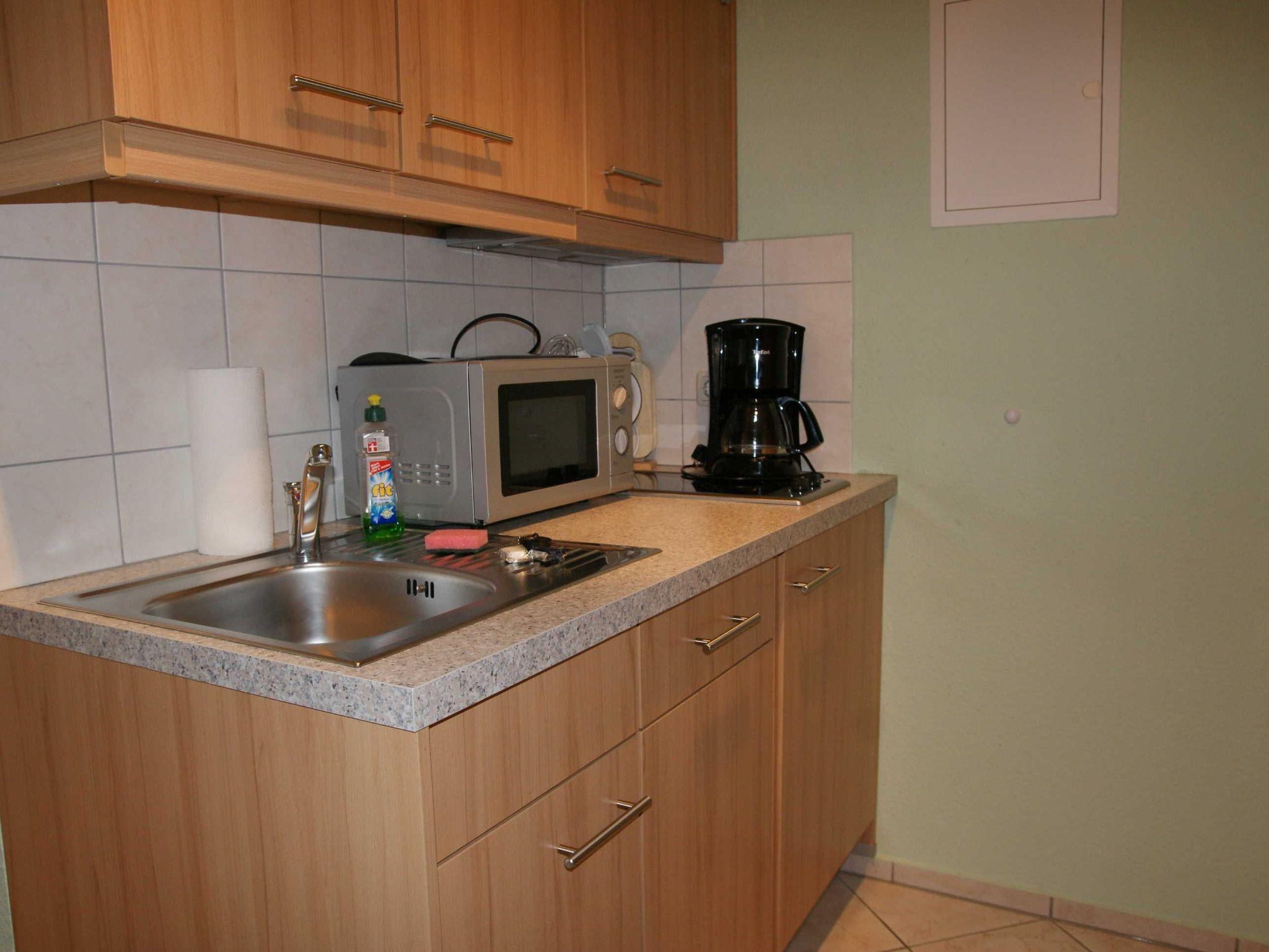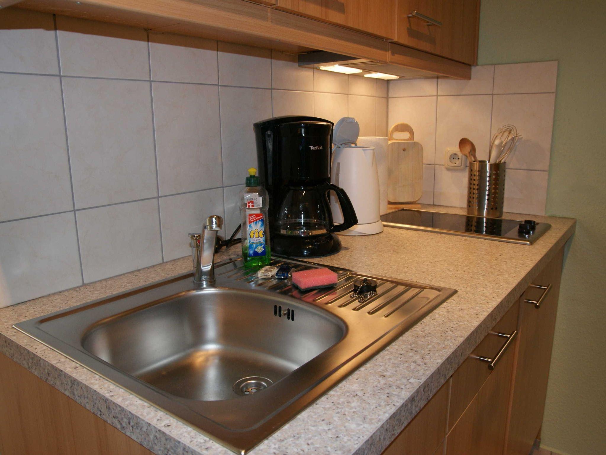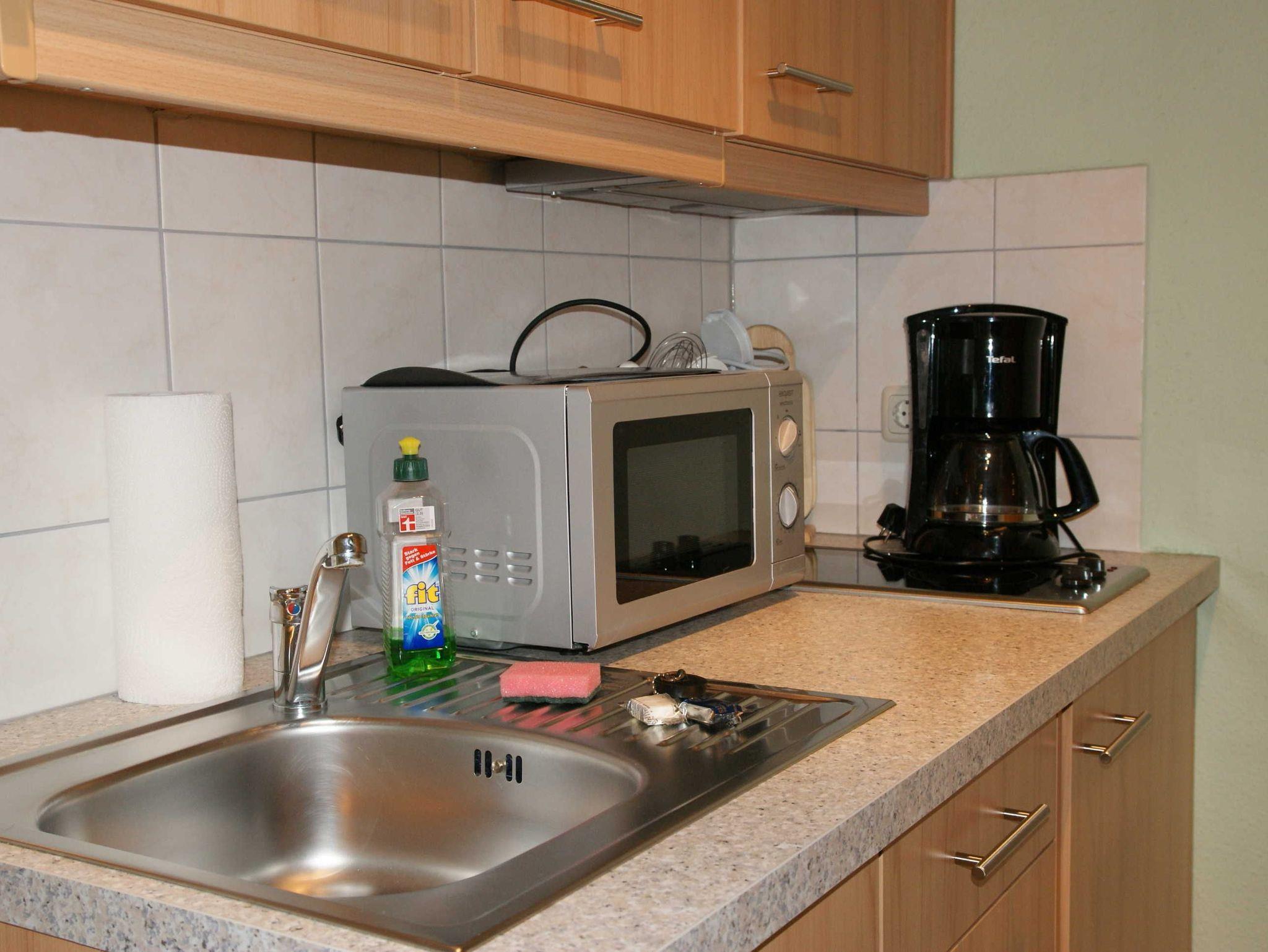 Küche mit Kühlschrank, Spülmaschine, 2-Zonen-Ceranfeld, Mikrowelle, Kaffeemaschine, Toaster, Wasserkocher sowie diversen Küchenutensilien
