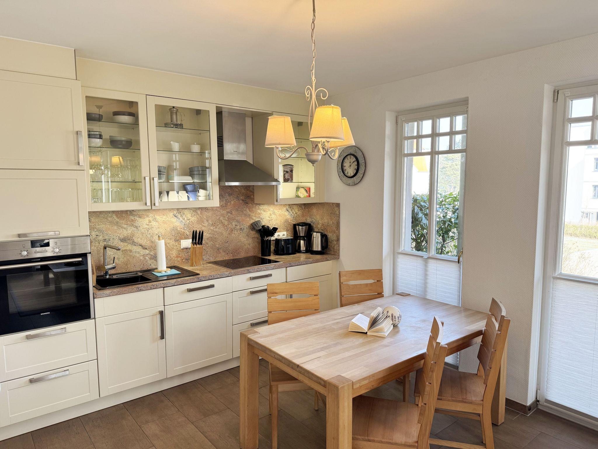 Die modern eingerichtete Nichtraucherferienwohnung 02 im Haus Strandkiefer befindet sich im Erdgeschoss. Sie bietet Ihnen mit ca. 56 m² ausreichend Platz für 2 bis 4 Personen + 1 Kleinkind bis 3 Jahre im Kinderreisebett. Vom Flur mit Garderobe gelangen sie in alle Räumlichkeiten. Der helle Wohn-/Essbereich besticht mit seinen bodentiefen Holzfenstern. Der Wohnbereich wurde mit einer Couch, einem Couchtisch, einem Sessel, einem TV-Board mit einem Smart-TV, einem WLAN-Zugang und einem Blu-Ray-Player ausgestattet. Abgerundet wird der Raum durch einen Kamin, der Ihnen gerade in der kälteren Jahreszeit, zusätzlich zur Fußbodenheizung, eine wohlige Wärme beschert. Die angrenzende Küchenzeile lässt keine Wünsche offen, so dass Sie mit einem Geschirrspüler, einem Backofen (selbstreinigend), einem Kühlschrank mit Gefrierfach, einem Cerankochfeld, einer Mikrowelle, einer Kaffeemaschine, einem Toaster, einem Wasserkocher, einem Mixer sowie diversen Küchenutensilien jede Mahlzeit zubereiten können. Zusätzlich finden Sie hier auch eine Waschmaschine mit Trocknerfunktion. Durch den Essplatz am Fenster wird der Bereich komplettiert. Ihre bestuhlte Terrasse (Ost) erreichen Sie vom Wohnbereich, von wo Sie auch einen ganz kleinen Blick auf das Meer erhaschen können. Das große Schlafzimmer verfügt über ein Doppelbett (1,80m x 2,00m), verstellbare Lattenroste, Nachttischablagen mit Beleuchtung, einem großen Kleiderschrank, Verdunklungsplissees sowie einem Flachbild-TV. Das kleine Schlafzimmer verfügt über ein Tandembett (0,90m x 2,00m) welches zusätzlich über eine Ausziehfunktion für die 4. Person verfügt sowie einer Kommode. Das innenliegende Badezimmer ist mit einer Dusche (flacher Einstieg), einem WC, einem Waschtisch, einem Kosmetikspiegel, einem Fön und einer Badewanne ausgestattet. Ein Wäscheständer sowie Reinigungsutensilien runden die Ausstattung ab. Ihre mitgebrachten oder geliehenen Fahrräder können Sie im kleinen abschließbaren Fahrradschuppen unterbringen. Dieser befindet sich direkt an Ihrem Carport (Nr.02) welches auch gleichzeitig Ihr Stellplatz für Ihren PKW ist. 2 Haustiere sind gegen eine Gebühr gern gesehene Gäste. Die Erstausstattung eines Wäschepaketes (komplette Bettwäsche, 1 Duschhandtuch, 1 kleines Handtuch) können Sie bis 14 Tage vor Anreise gegen einen Aufpreis dazu buchen oder durch eigenes Ergänzen. Ab 2 gebuchten Paketen erhalten Sie einmalig 1 Geschirrhandtuch und 1 Duschvorleger hinzu.