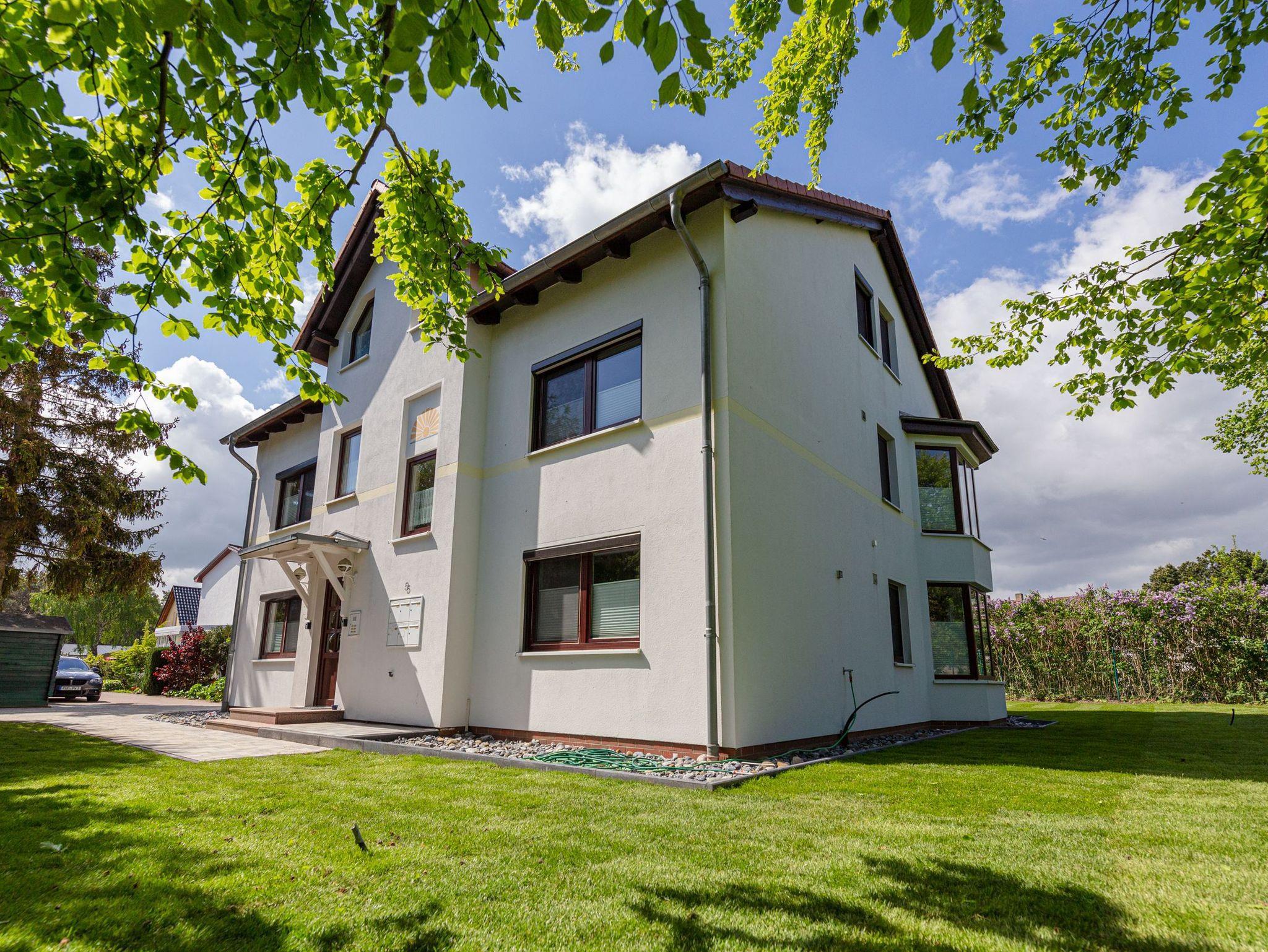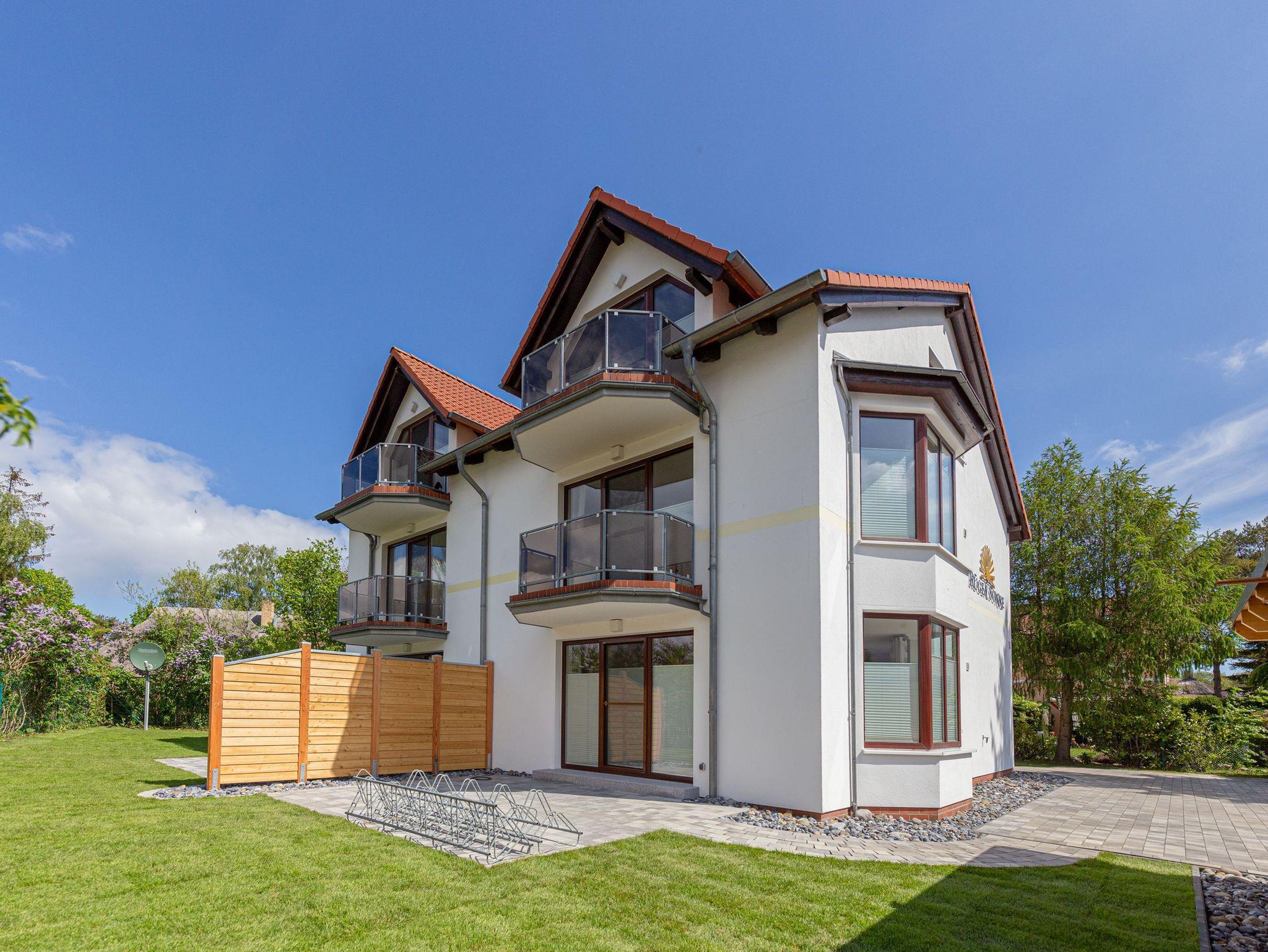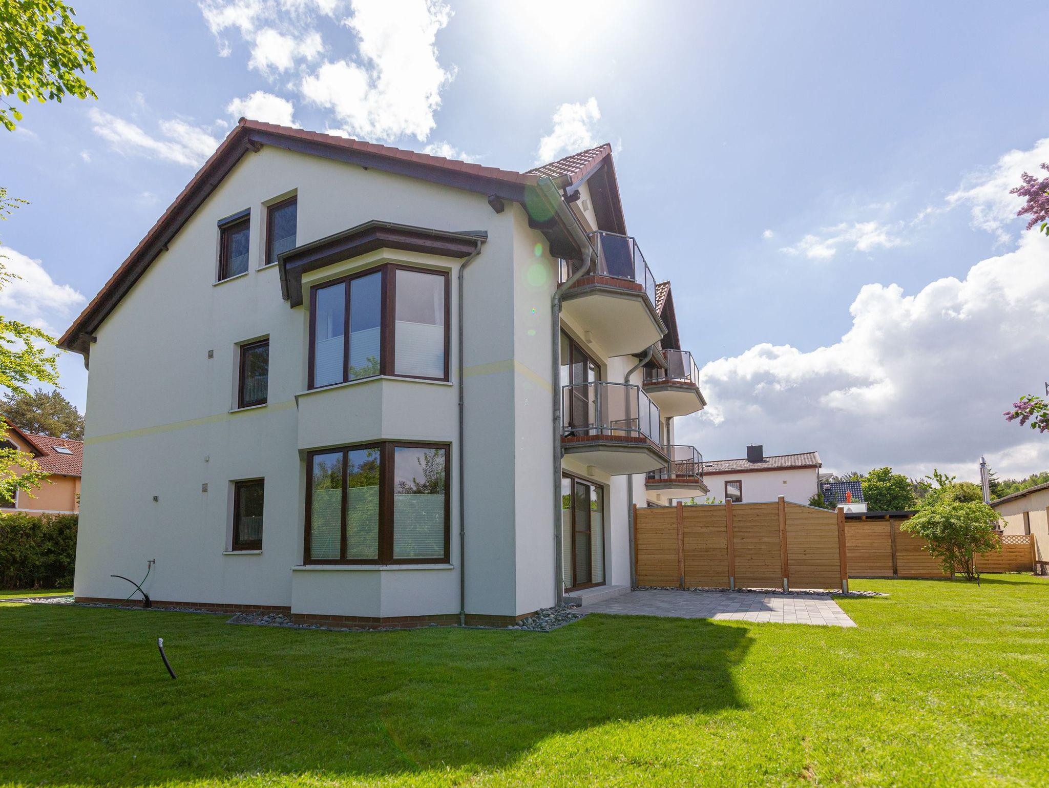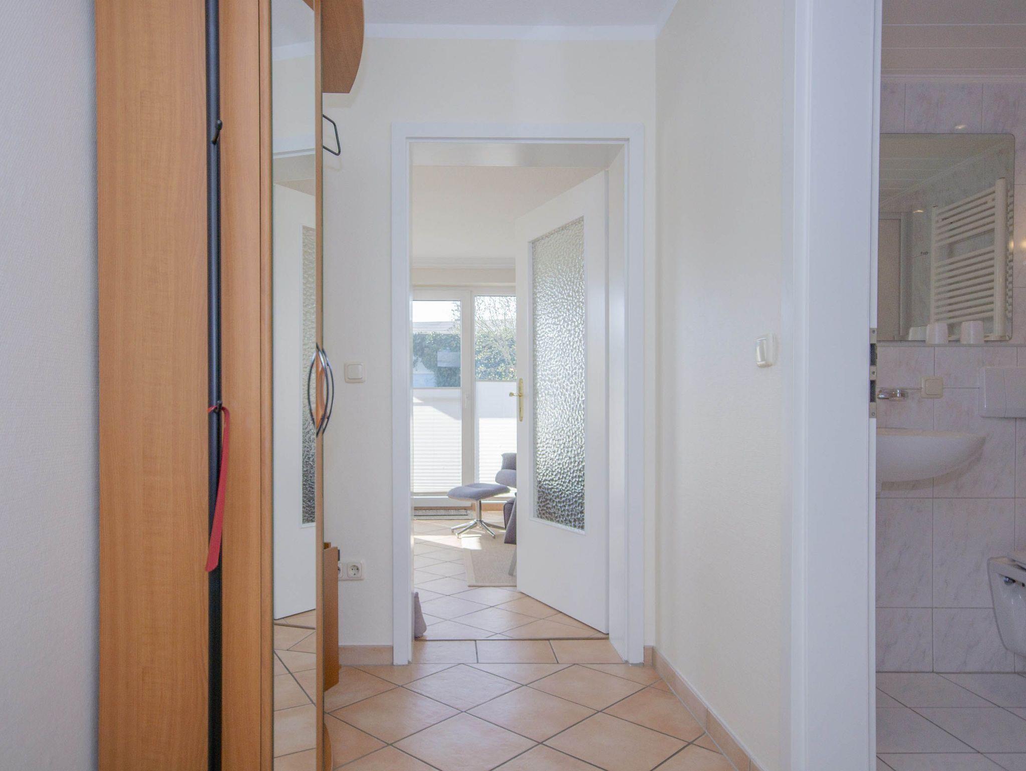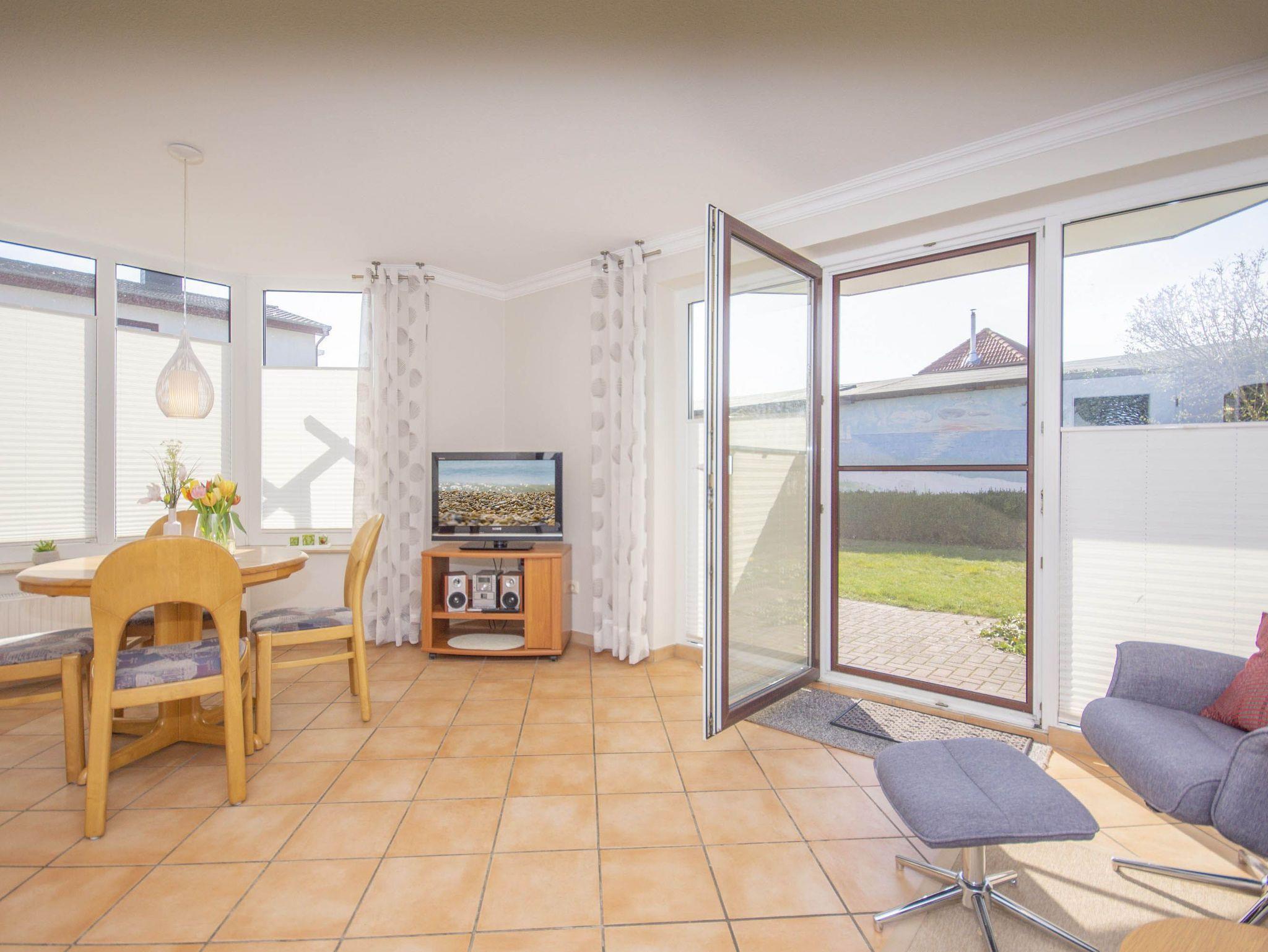 Die Ferienwohnung 3 im Erdgeschoss im Haus Rügensonne verfügt über einen freundlichen Eingangsbereich, eine sonnige Terrasse, einen gemütlichen Wohnbereich und ein separates Schlafzimmer.