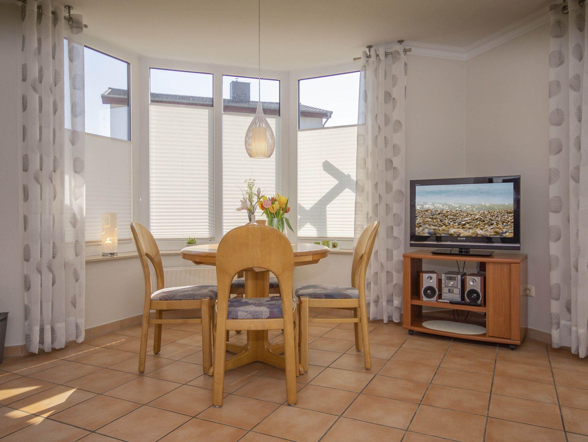 Der freundliche Wohnbereich bietet einen gemütlichen Ort zum Ausklingen der erlebnisreichen Tage auf Rügen. Hier befindet sich neben einem modernen Flachbild-TV auch eine außerordentlich komfortable Couchgarnitur, die eine optionale Aufbettung für bis zu 2 weitere Personen darstellt. Von diesem Zimmer erhalten Sie einen direkten Zugang auf die eigene Terrasse, welche mit komfortablen Gartenmöbeln ausgestattet ist. Hier können Sie nach einem erlebnisreichen Strandtag in Baabe einfach mal die Seele baumeln lassen.