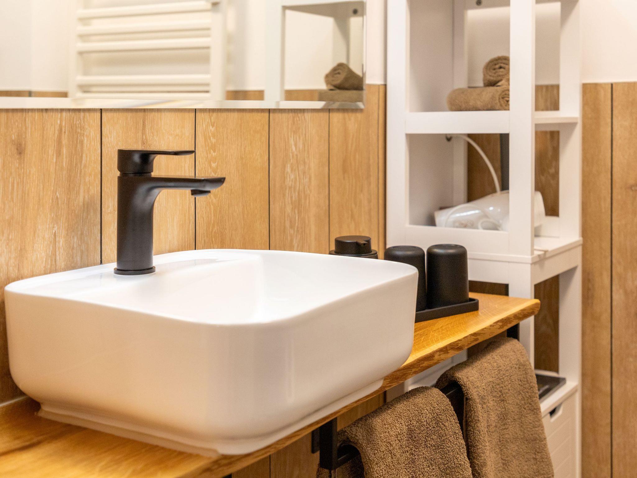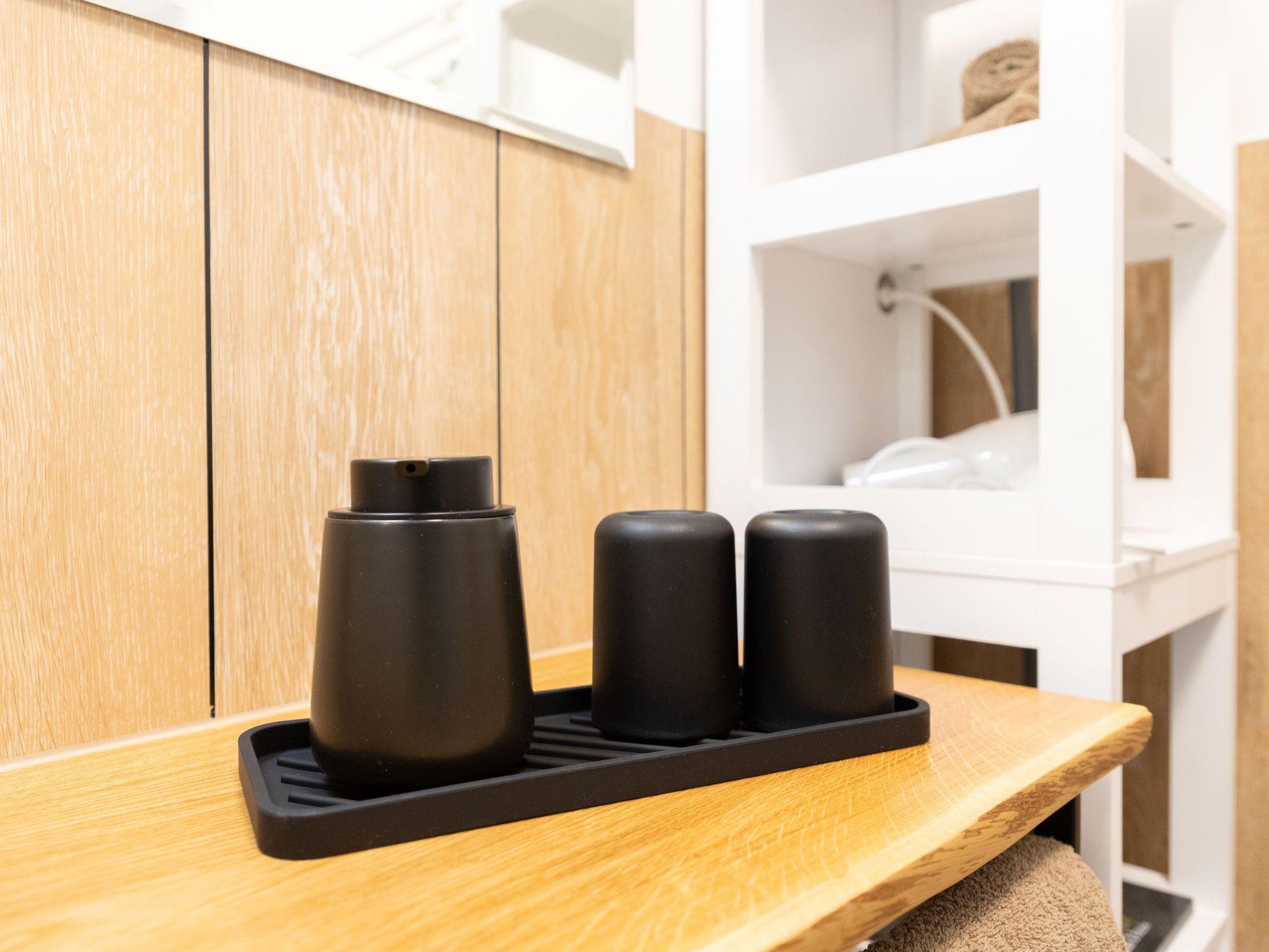 Die separate Küche ist mit allem ausgestattet, was es für den effizienten Selbstversorger benötigt; ein Ceranfeld, ein Backofen, eine Geschirrspülmaschine, ein Kühlschrank mit Gefrierfach und ein Kaffeevollautomat. Auch allerlei Küchenutensilien und Kleingeräte finden hier ihren Platz. Direkt daneben, führt ein schmaler Treppenaufgang, direkt in den Schlafbereich mit einem bequemen Doppelbett und einem weiteren Smart TV.