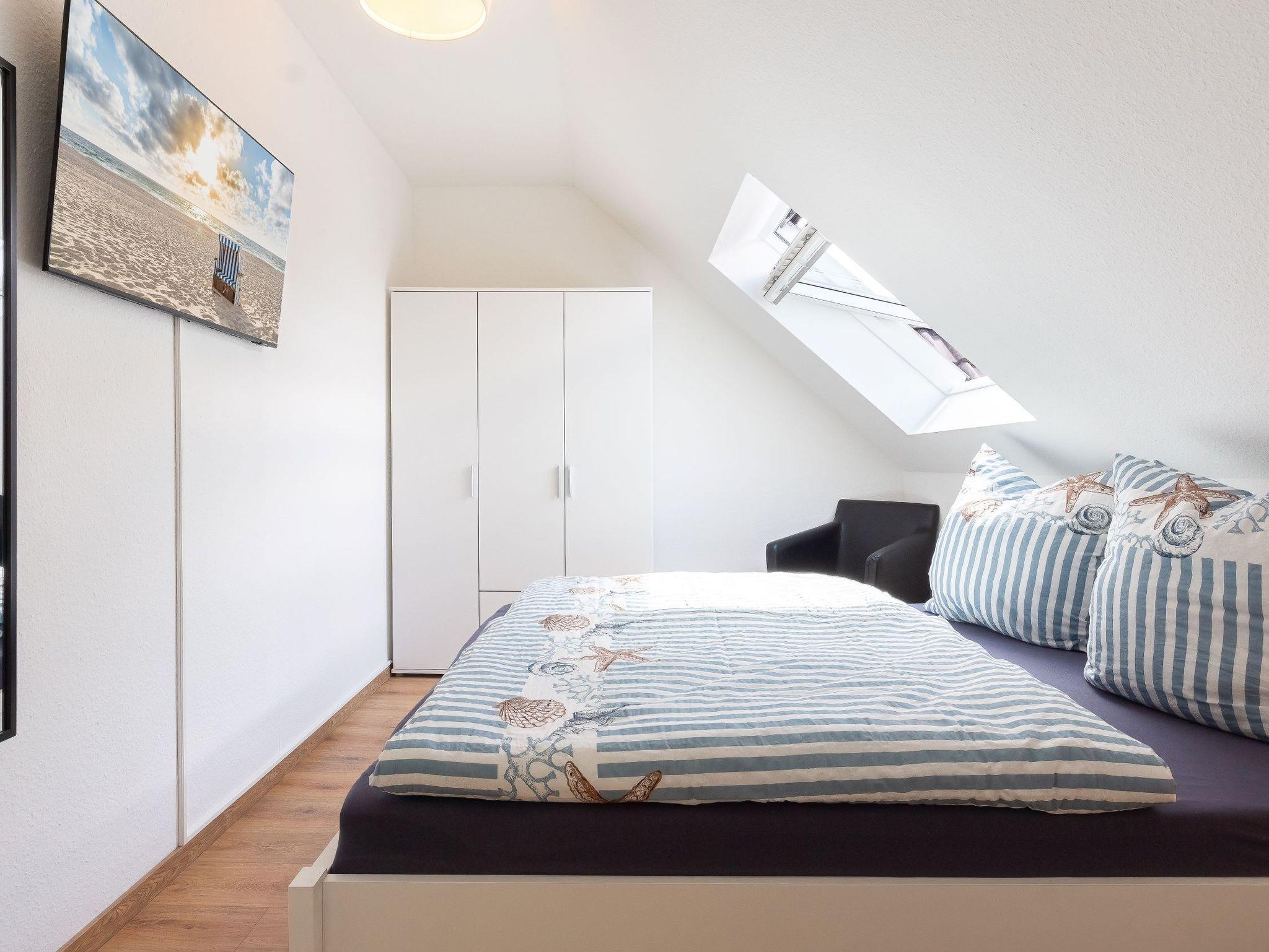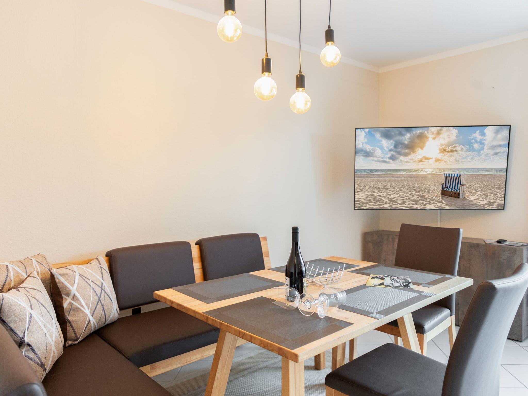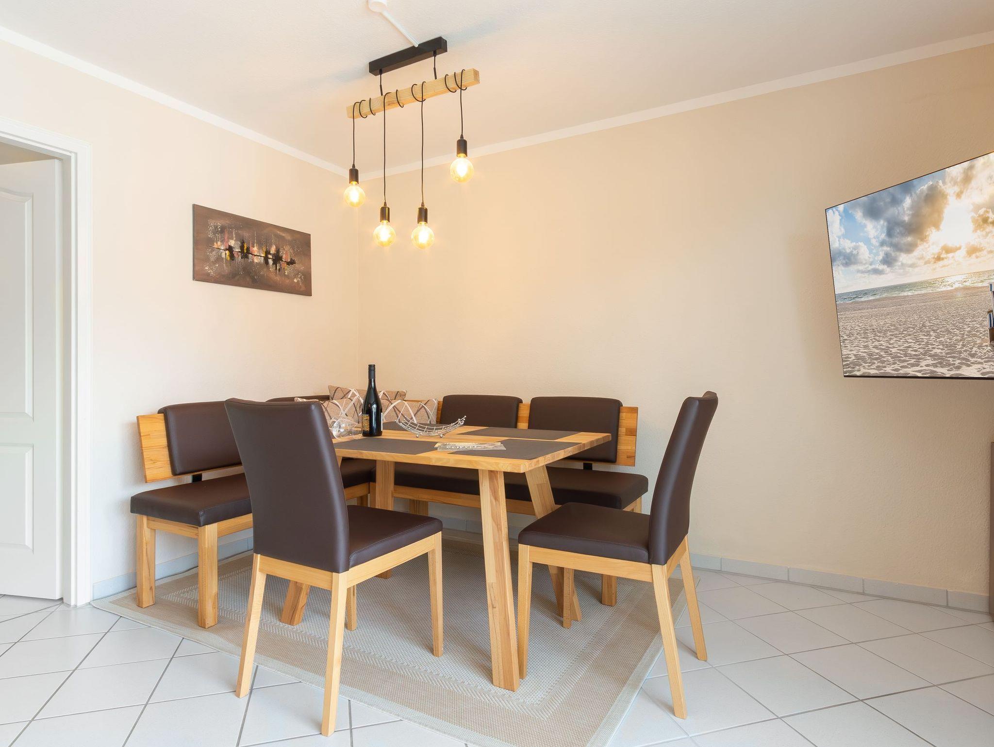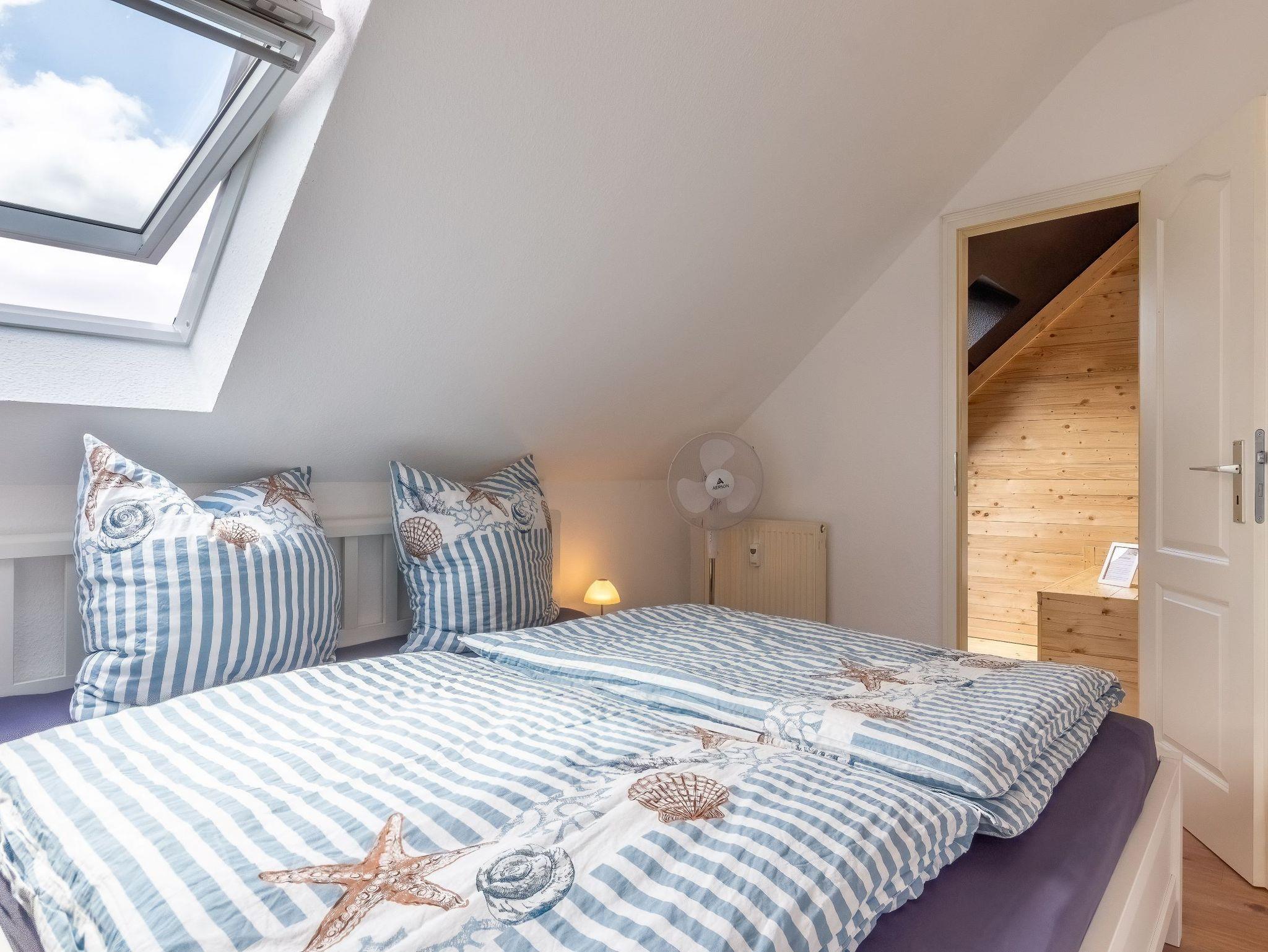 Die Maisonette-Wohnung, mit ihren 52m², bietet Platz für bis zu zwei Personen. Liebevoll eingerichtet, mit moderner Ausstattung, lädt die Ferienwohnung zum Verweilen ein. Vom Wohnbereich mit Esstisch, Sofa und Smart-TV aus gelangt man auf den sonnigen Süd-Balkon, auf dem gemütliche Grillabende bei wunderschönem Sonnenuntergang über dem Selliner See verbracht werden können.