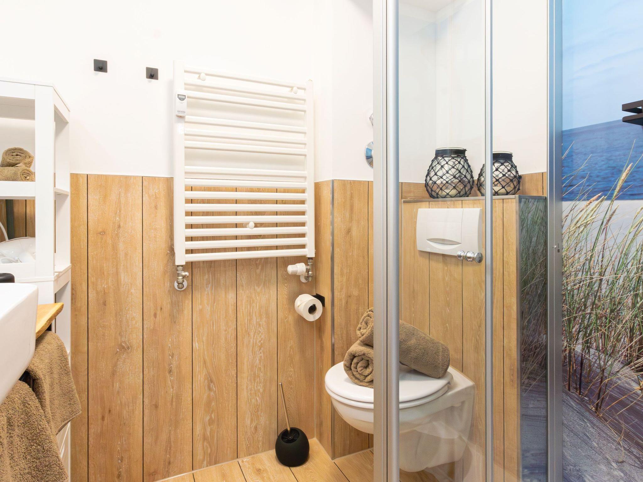 Das moderne Badezimmer bietet eine Glasdusche mit Strandfeeling, ein WC und ein Waschbecken mit Spiegel.