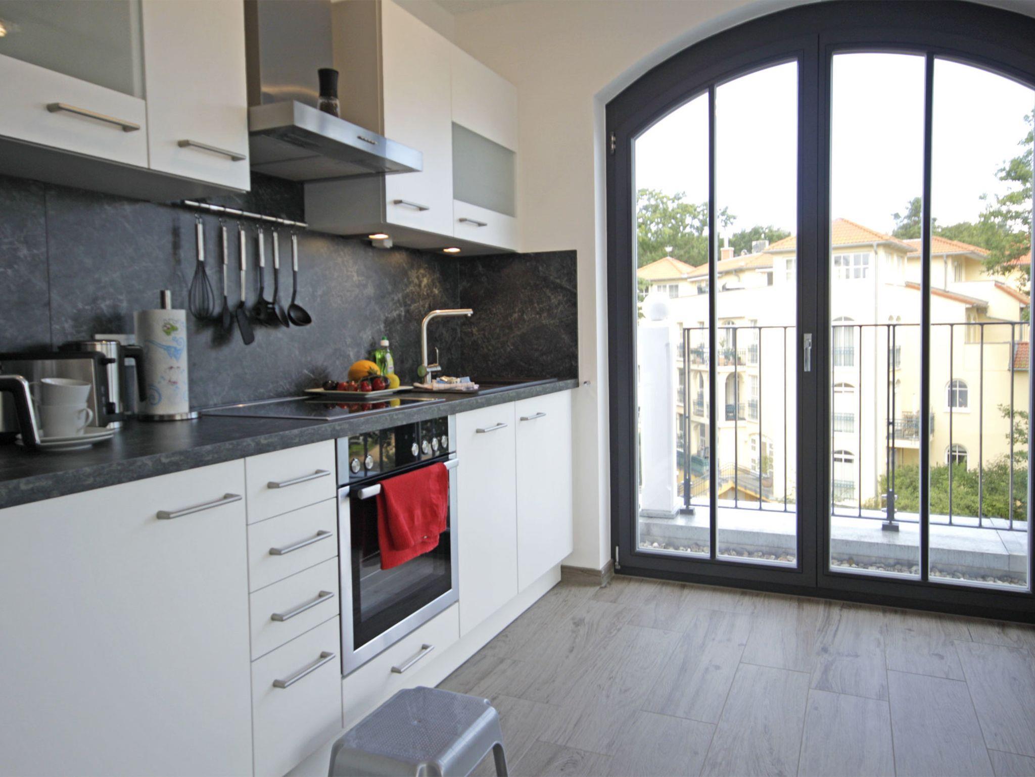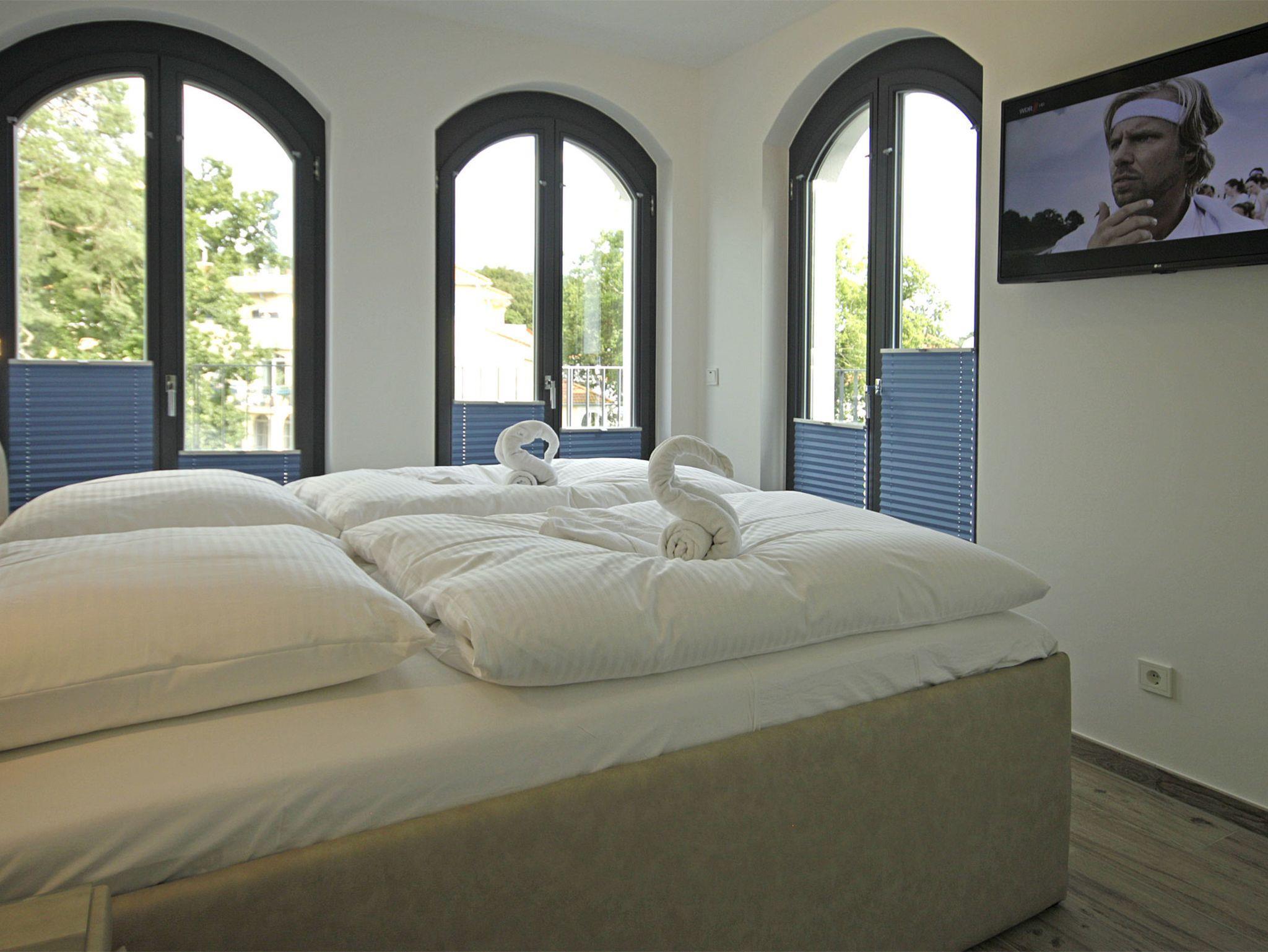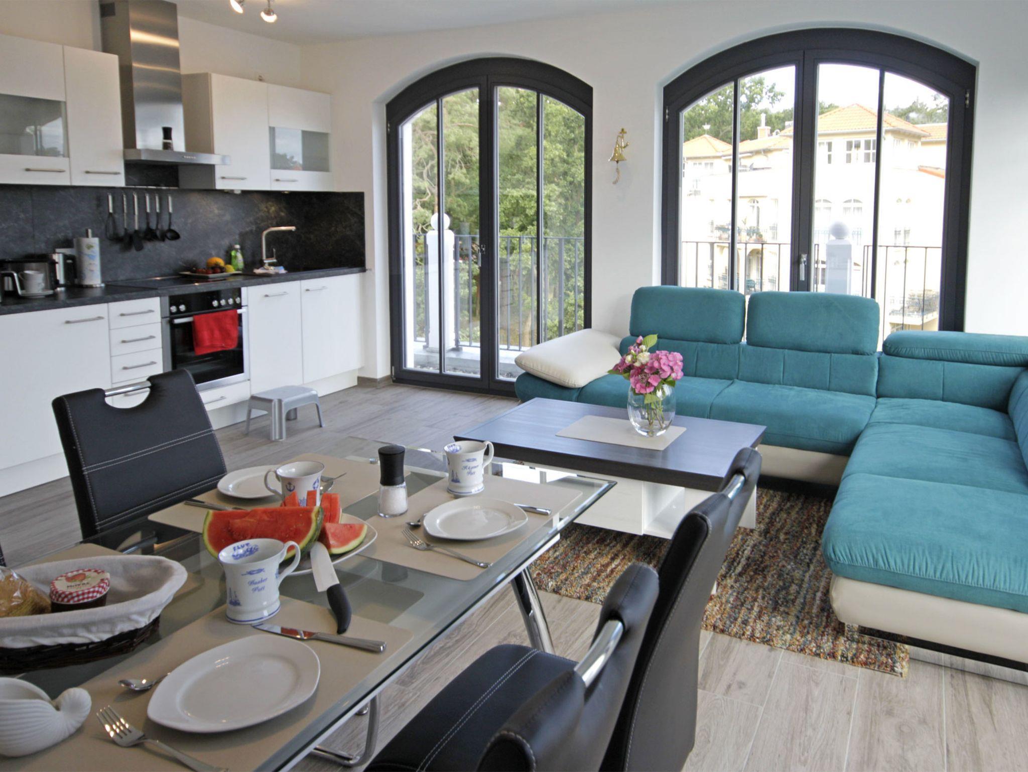 Vis a vis dem Strand, Luxus pur: 98 qm große Penthouse Ferienwohnung mit herrlichen Meerblick an der Promenade von Baabe für 4 Personen mit 2 Schlafzimmern, 2 Bädern und 2 großen Balkonen. Die Villa Andrea liegt in bester Lage zum Strand, verfügt über Lift, WLAN, Tiefgaragenstellplatz und einer Gemeinschaftssauna im Souterrain. Ein schön angelegter Garten umgibt das Haus. Die Wohnung ist ebenfalls gut geeignet für bewegungseingeschränkte Personen, da auch das Duschbad ebenerdig ist.
