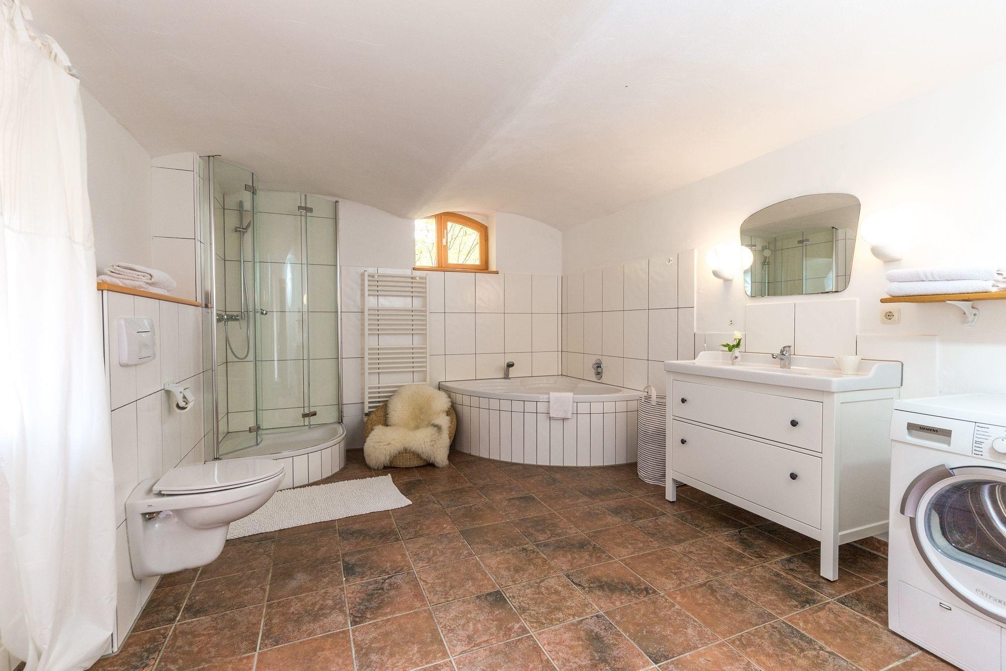 Alle drei Schlafzimmer im Obergeschoß haben einen tollen Ausblick ins Grüne - eines ist mit einem en-Suite-Badezimmer (Dusche, WC, Waschbecken) ausgestattet. Das zweite große Badezimmer im ehemaligen Stall finden Sie im Erdgeschoß. Hier stehen Ihnen auch Waschmaschine und Wäschetrockner zur Verfügung.