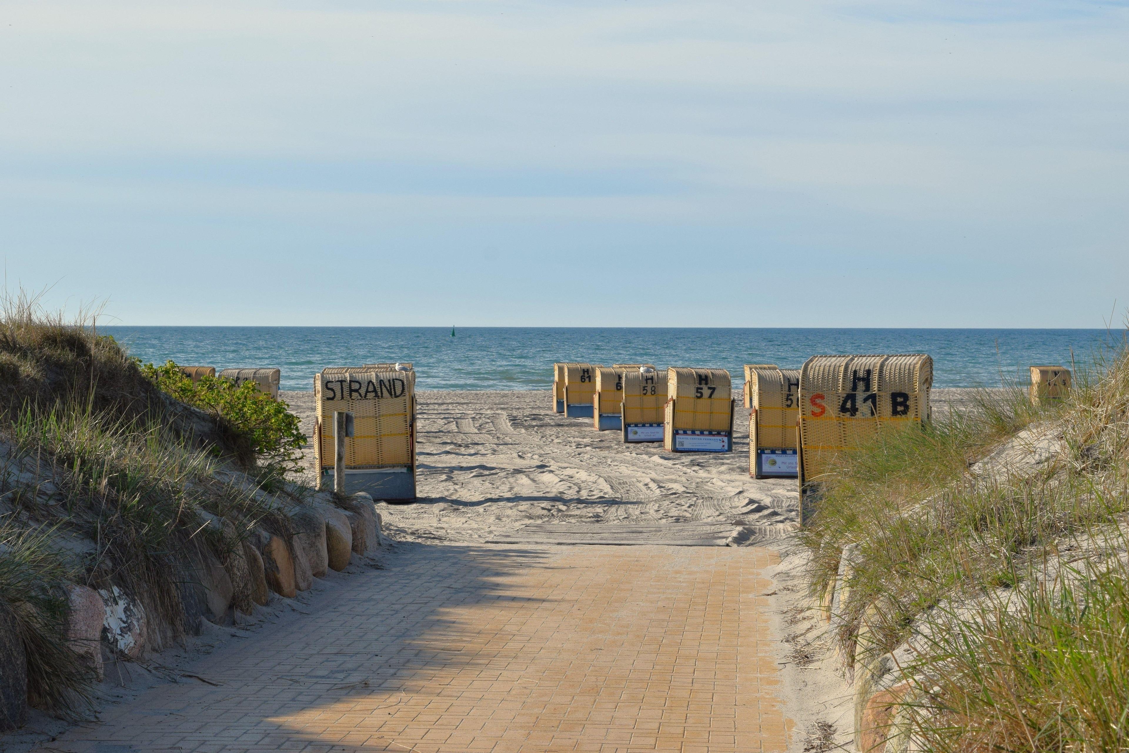 Rückseits der Wohnanlage gelangen Sie, durch die Siedlung, innerhalb von 3 min. an den wunderschönen Südstrand und eine weitere Promenade mit Strandzugängen , Strandkorbvermietung, dem "Chillaz" direkt an der Hafeneinfahrt mit tollem Ambiente und schöner Aussicht.