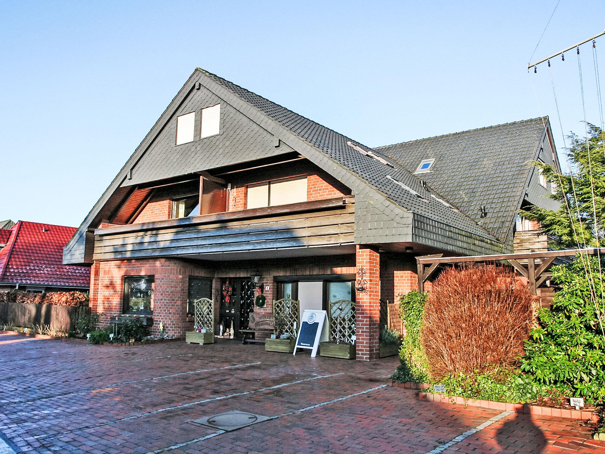 Apartment block "Windrose". In the resort, 300 m from the centre, 2 km from the sea, 2 km from the beach, located by a road. For shared use: property 3'000 m2 (fenced), garden, lawn for sunbathing, indoor pool heated (5 x 13 m, depth 160 cm, seasonal availability: 15.Mar. - 15.Nov.). Table tennis, terrace, garden furniture, barbecue, children's playground. In the house: reception, lounge, sauna (extra). Solarium (extra). Central heating system. Parking at the house. Shop 300 m, grocery 500 m, restaurant 300 m, café, bus stop 600 m, railway station "Nordenham" 20 km, sandy beach 2 km.