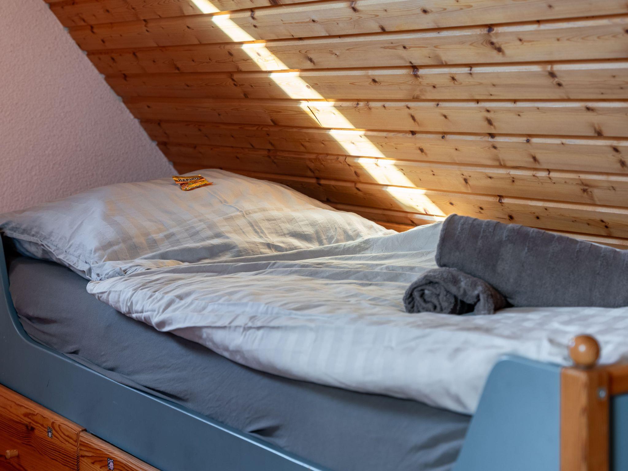Vom Wohnzimmer aus erreichen Sie alle weiteren Räume. Über eine Treppe gelangen Sie zudem auf die offene Schlafgalerie, die mit einem Doppelbett, Kleiderschrank, Kinderecke und Kinderbett eingerichtet ist.