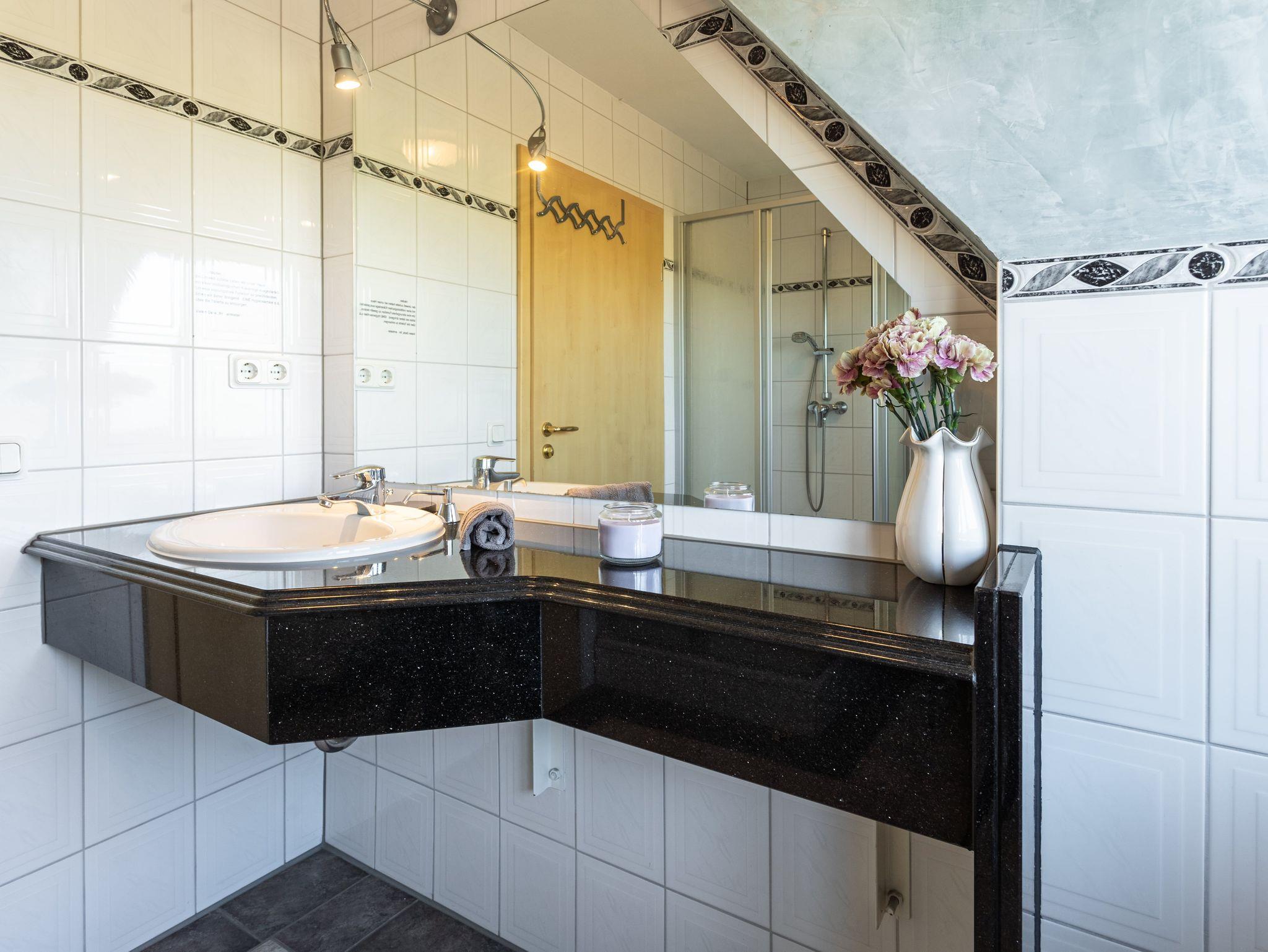 Das separate Schlafzimmer verfügt über ein Doppelbett und einen großzügigen Kleiderschrank. Das Badezimmer ist mit einer Dusche ausgestattet.