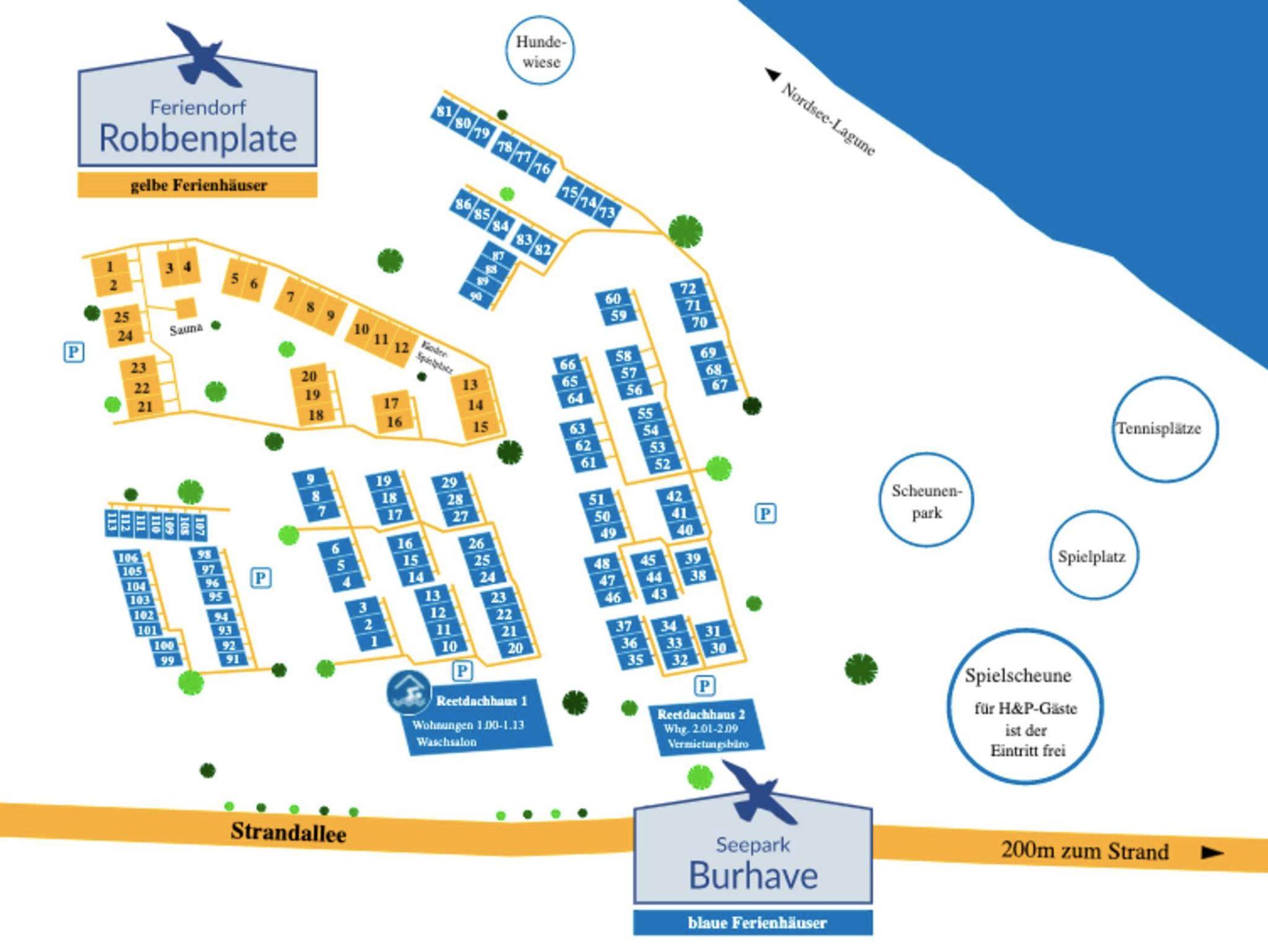 Unser Feriendorf Robbenplate mit seinen 25 exklusiven Doppel-, Reihenhäusern und einem Saunahaus befindet sich in zentraler Lage in Burhave und ist nur 200 m vom Strand entfernt. Die vielfältigen Freizeitaktivitäten wie die Spielscheune und die Nordseelagune sind in wenigen Gehminuten erreichbar. Die exklusiven und familienfreundlichen 3 ? bis 5-Zimmerhäuser sind modern ausgestattet und lassen keinerlei Komfort vermissen. Sie bieten im Erd- und Obergeschoss Platz für bis zu 8 Personen (großzügige Raumaufteilung auf rund 78 ? 86 m²).