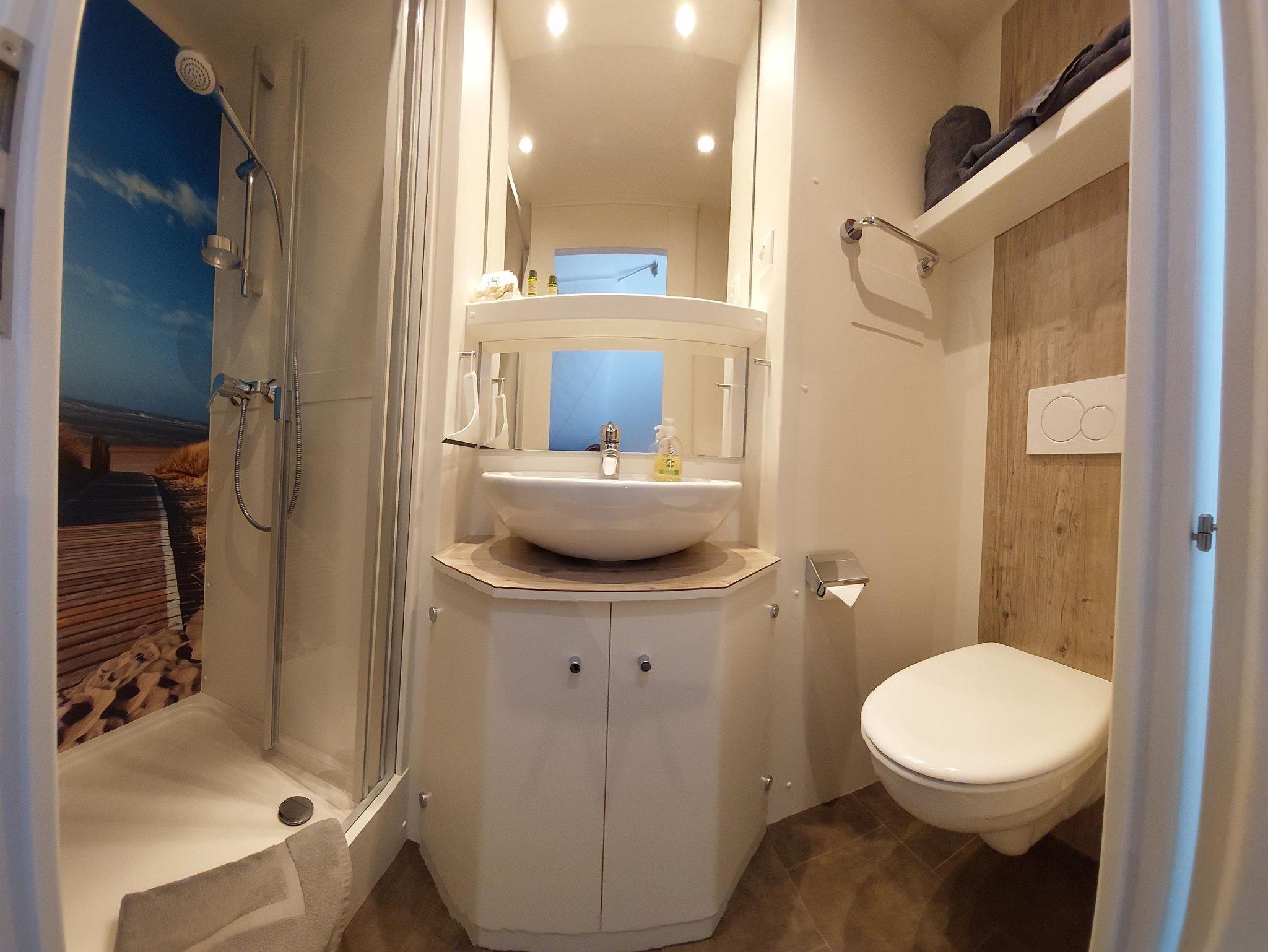 Das Zimmer verfügt über eine Klimaanlage/Heizung, Smart-TV, Kaffeemaschine, Wasserkocher, Föhn, WLAN und einen kleinen Kühlschrank. Zu dem Zimmer gehört eine eigene kleine Badezimmerkabine, wie sie sonst nur auf Kreuzfahrtschiffen zu finden sind.