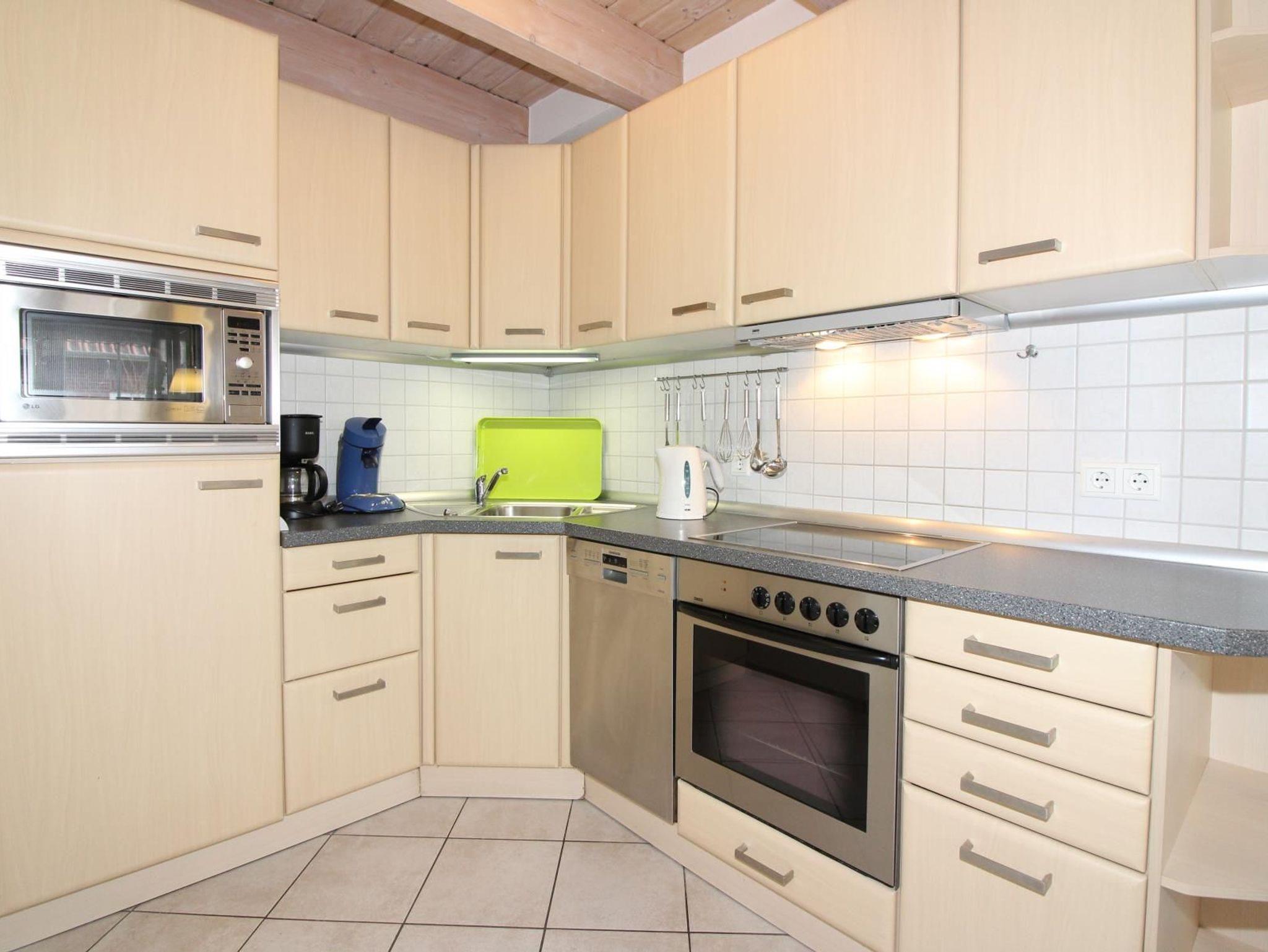 Die komplett eingerichtete Küche verfügt u.a. über Mikrowelle, Spülmaschine, Kaffeepad-Maschine, Herd mit Ceranfeld und Backofen.