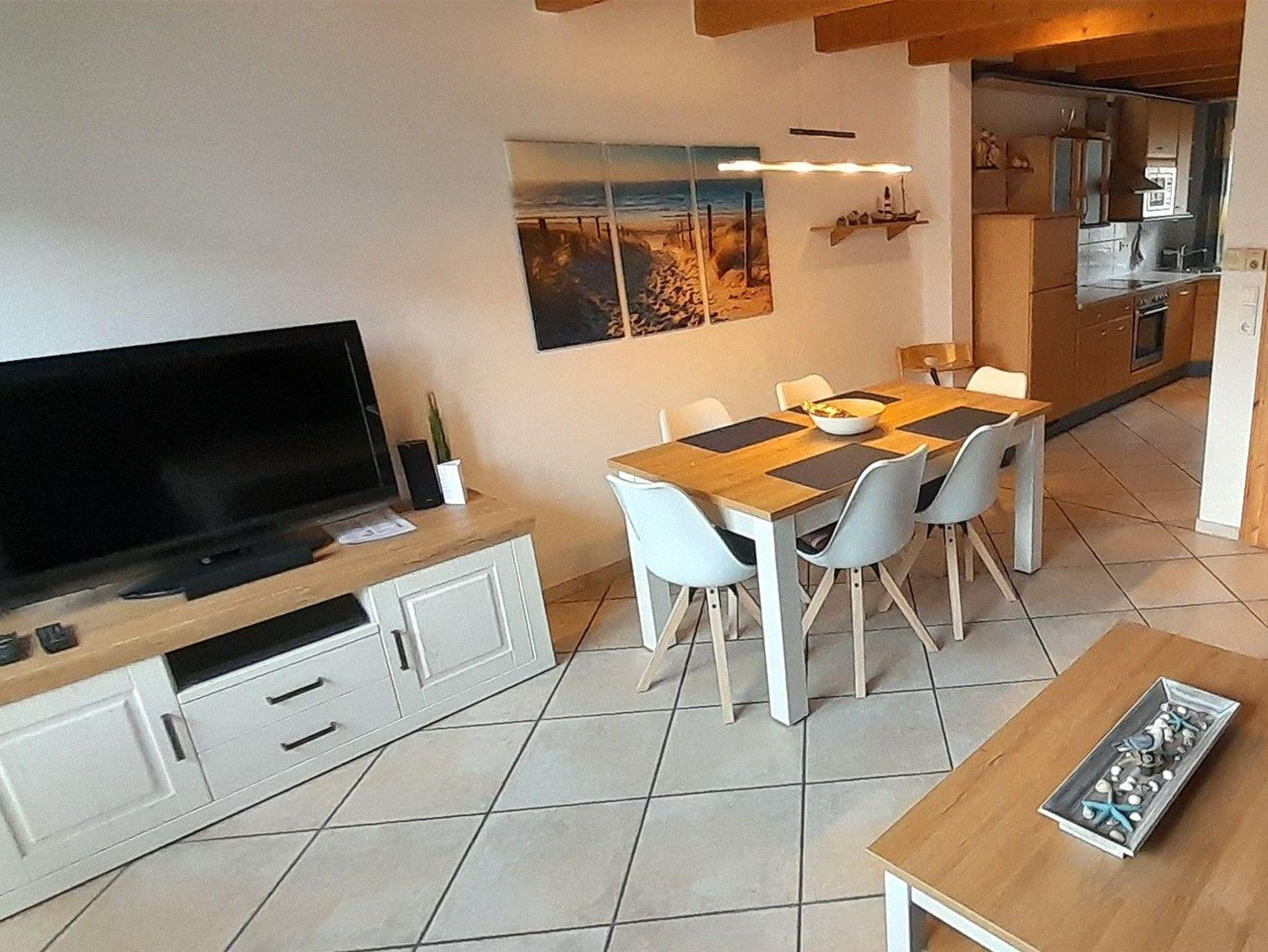 sehr geräumiger, im Frühjahr 2023 (teil-)neu möblierter Wohn- und Essbereich mit gemütlicher Leder-Couch und moderner Essgruppe für bis zu 6 Personen, zwei Kinderhochstühle, 102 cm LCD-HD-Fernseher mit Digital-Kabel-TV, Sony Sound-Anlage mit Blu-Ray-Spieler, Fußbodenheizung, Deckenfluter inkl. Leselampe, Blu-Rays, DVDs, CDs, Spiele, Bücher