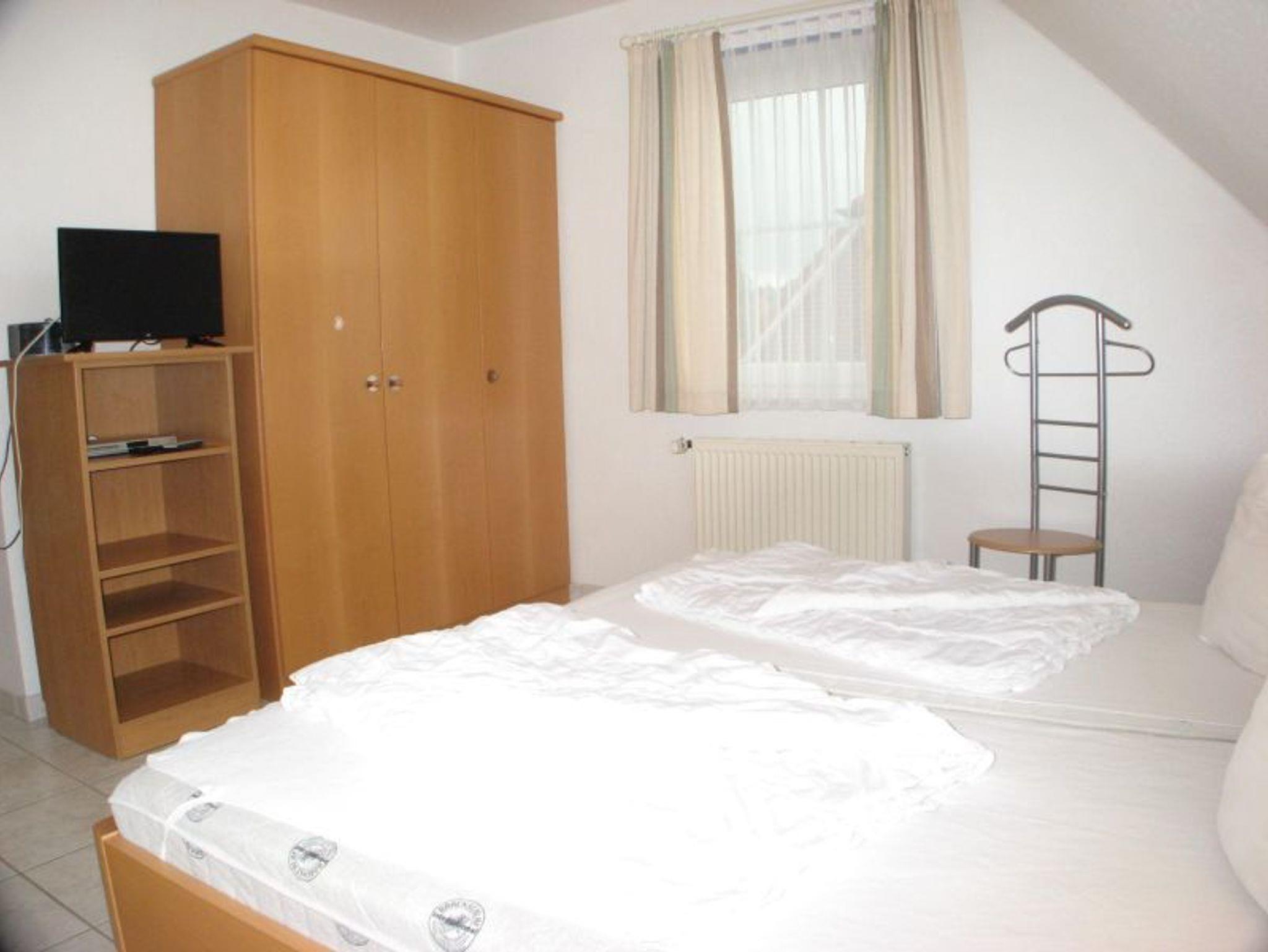 Das Haus verfügt über drei Schlafzimmer, zwei im Obergeschoß und eins mit zwei Einzelbetten im Erdgeschoss. Jedes Schlafzimmerfenster ist mit Vorbaurollladen zur Verdunkelung der Räume ausgestattet. Außerdem sind zwei Bäder mit Dusche, WC, Föhn, Kosmetikspiegel und Trittschemel für die Kleinen vorhanden, so dass auch gehbehinderte Feriengäste bequem ohne Treppensteigen ihren Urlaub genießen können.