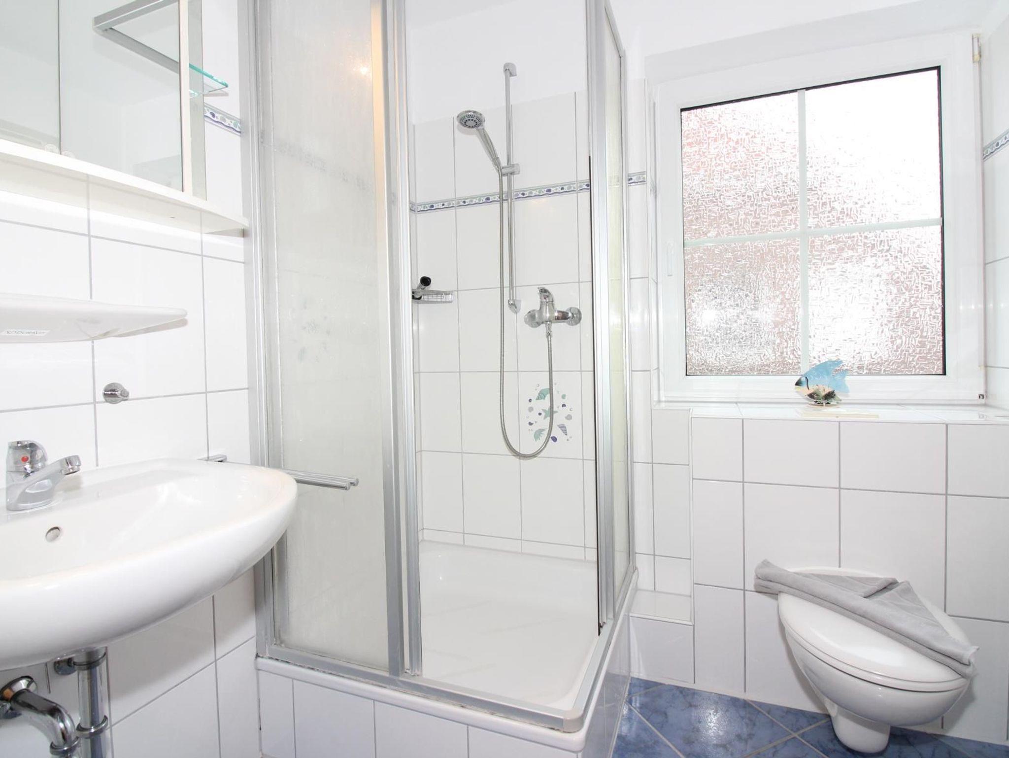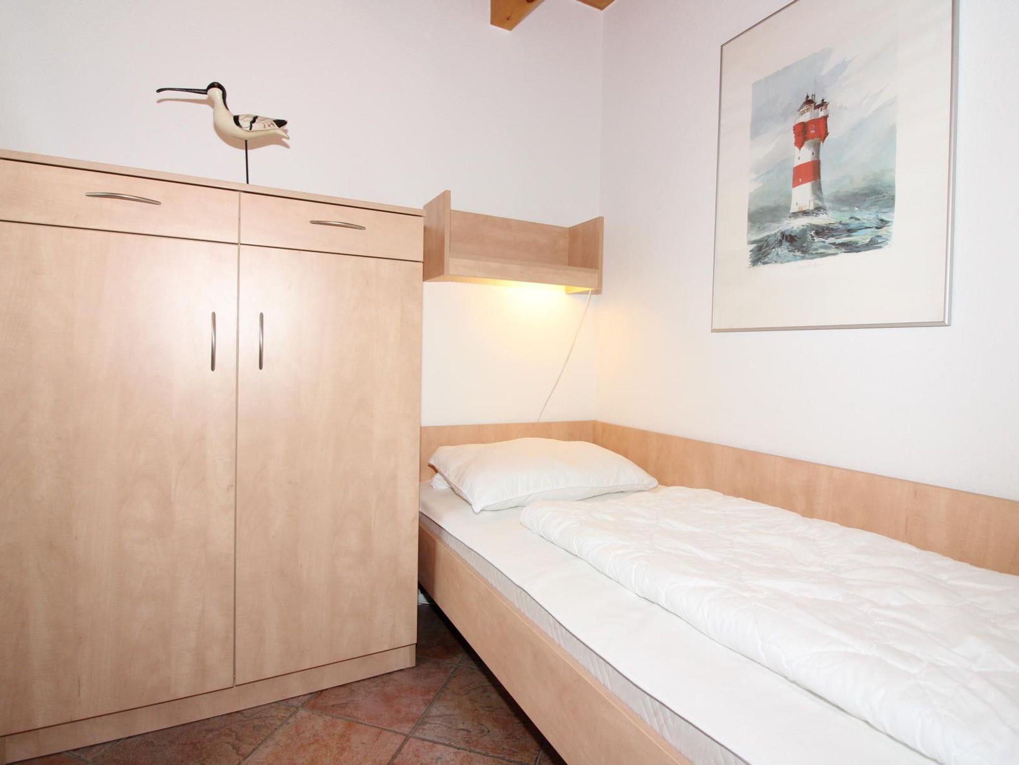 1. Etage: Ein Schlafzimmer mit Doppelbett (inkl. TV) und ein Schlafzimmer mit zwei getrennten Betten (inkl. Schreibtisch). Ein zusätzliches Kinderbett ist vorhanden und kann aufgestellt werden. Außerdem ein Badezimmer mit Dusche/WC.