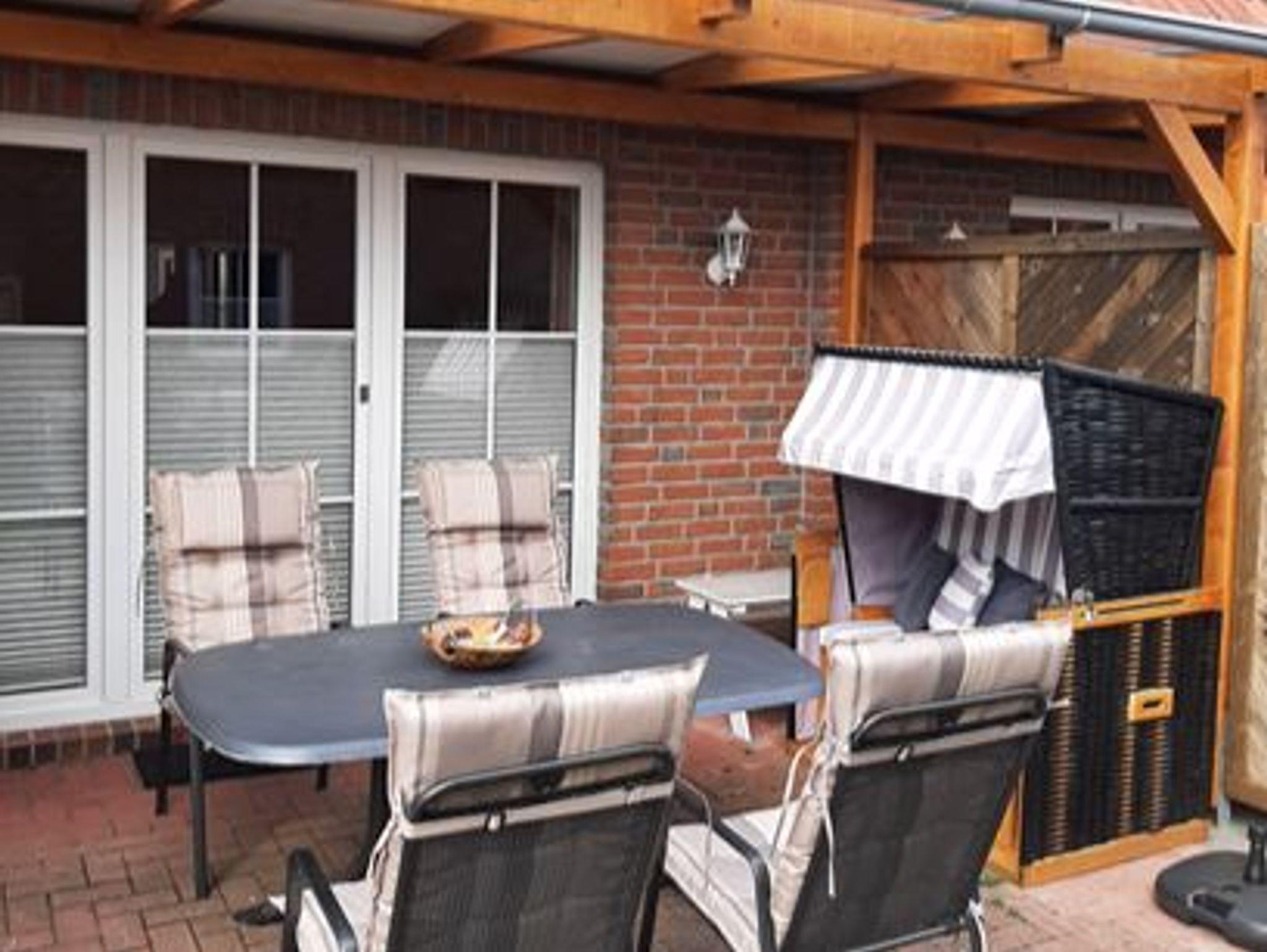 Eine teilweise überdachte Terrasse mit Tisch, 6 Stühlen inkl. Auflagen, Sonnenschirm und Strandkorb sowie einem Elektrogrill - aus Brandschutzgründen ist die Nutzung von Holzkohlegrills untersagt!