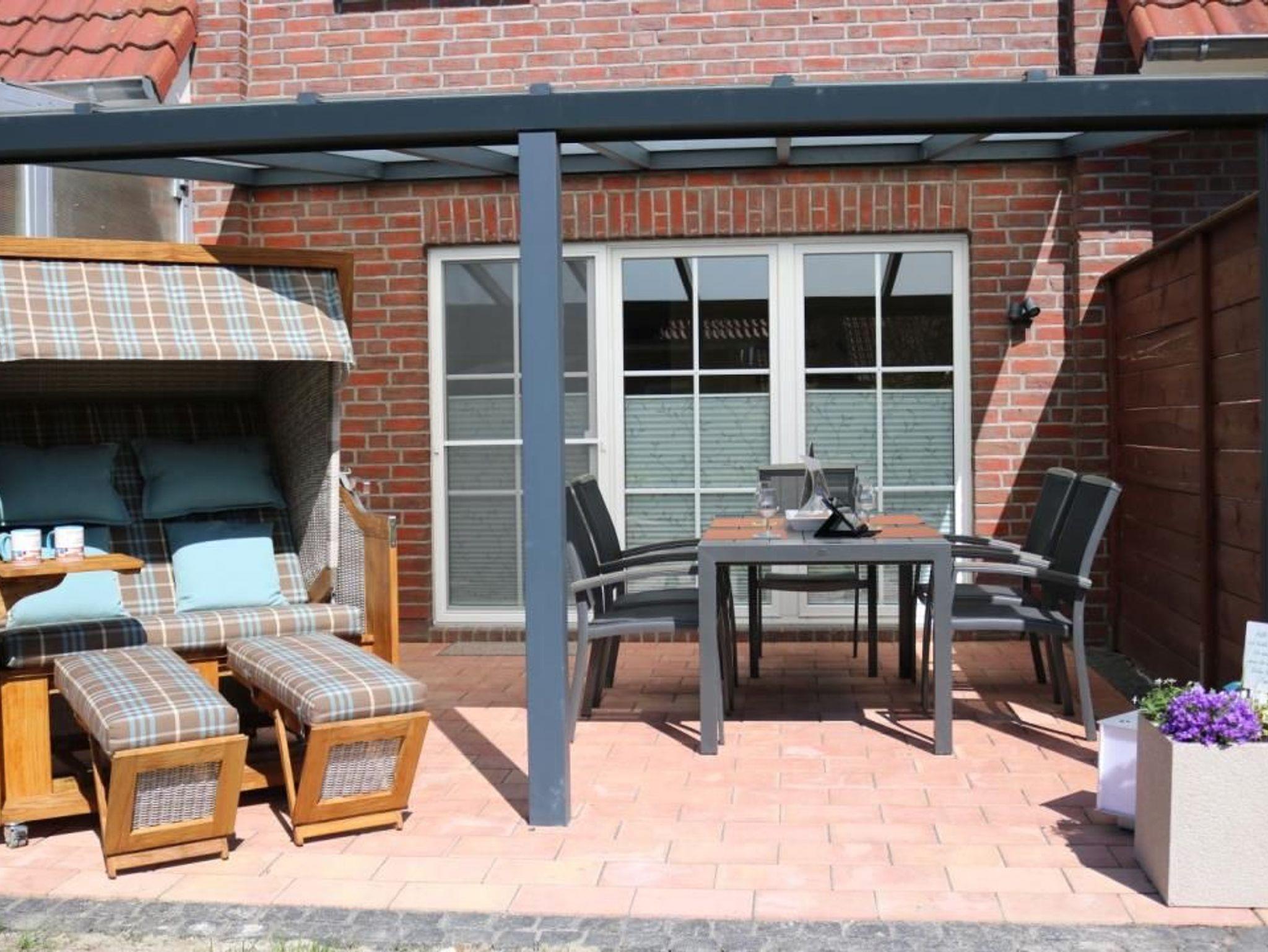 Die Terrasse ist mit einem Echtglasdach überdacht und bietet Ihnen die Möglichkeit bei jedem Wetter draußen zu sitzen. Es gibt auch eine elektrische Unterfahr-Markise. Genießen Sie einen gemütlichen Grillabend (Grill vorhanden) oder entspannen Sie in unserem sehr bequemen XXL Strandkorb.