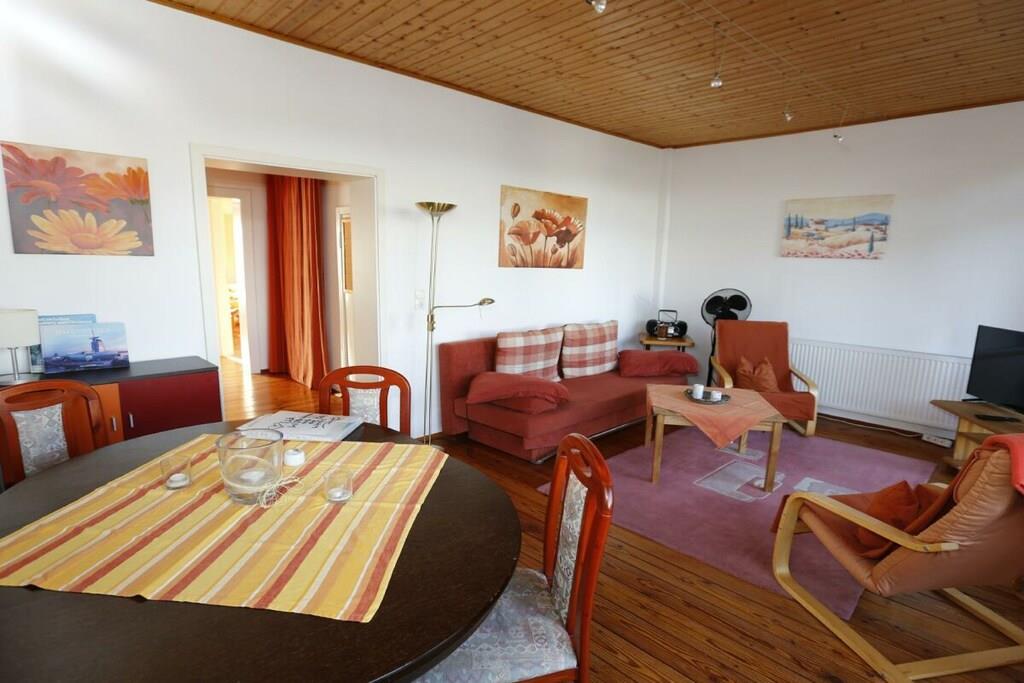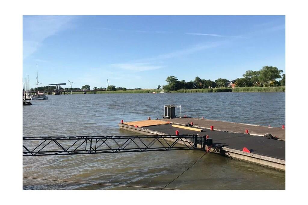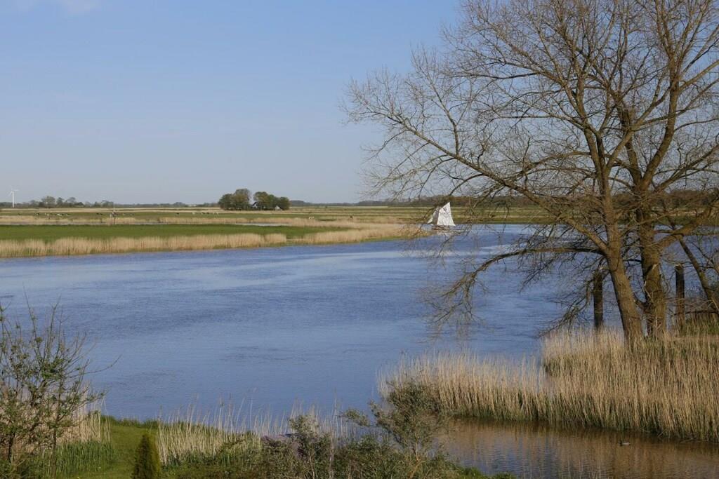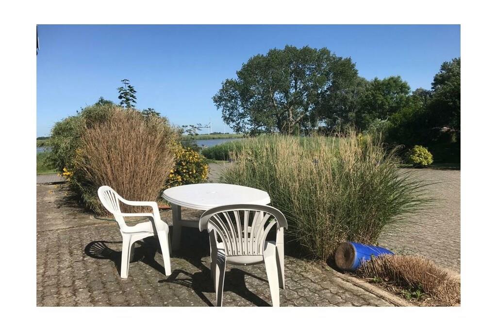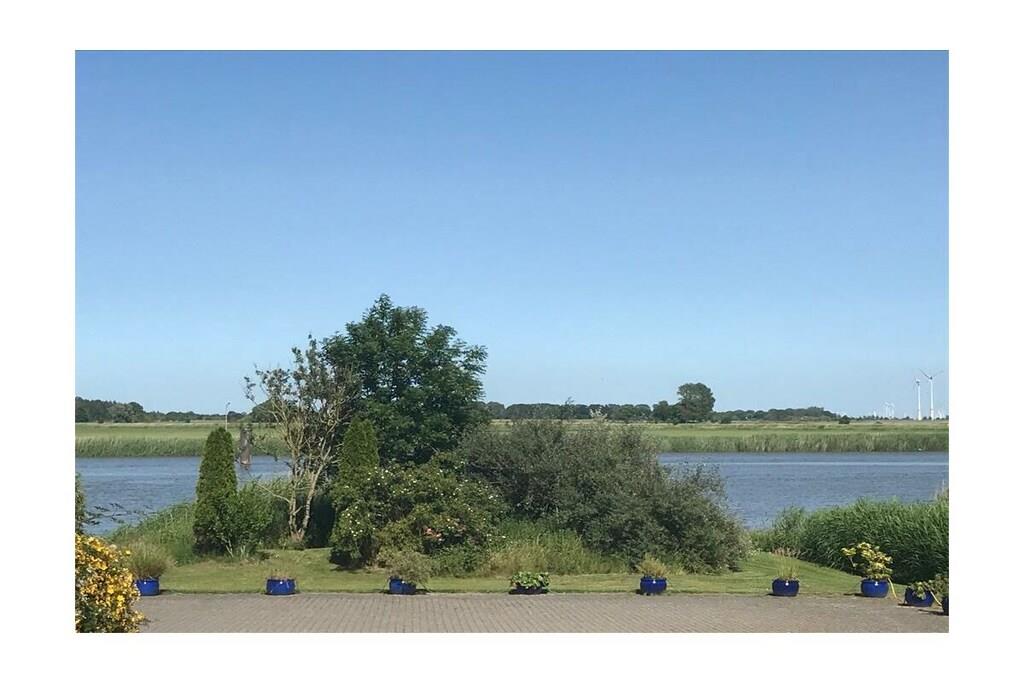 Semesterlägenheten är särskilt ljus och cirka 90 kvadratmeter stor. Trägolvet och inredningen ger den en varm karaktär. Duschrummet och köket är kaklade med terrakottakakel, vilket skapar en mysig medelhavsatmosfär. Det ljusa köket är utrustat med keramikhäll, ugn, mikrovågsugn, diskmaskin och kyl-frys. En bekväm frukosthörna finns i köket. Lägenheten har två sovrum med dubbelsäng: ett med dubbelsäng och det andra med två enkelsängar. En extra säng kan ordnas på begäran. Sovrummet med de två enkelsängarna erbjuder utsikt över vattnet från sängen, tillgång till terrassen och en egen ingång. Det andra sovrummet vetter mot sydväst och har utsikt över vallen. Vardagsrummet erbjuder också en vacker utsikt över flodlandskapet och direkt tillgång till terrassen och trädgården. Du kan njuta av utsikten över vattnet från den bekväma soffan eller matplatsen. Markisen över terrassen ger skugga vid behov. Alldeles intill lägenheten finns ett stort grönområde, perfekt för picknick vid floden, bollspel eller som lekplats för dina hundar.