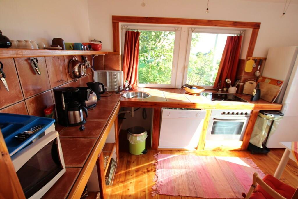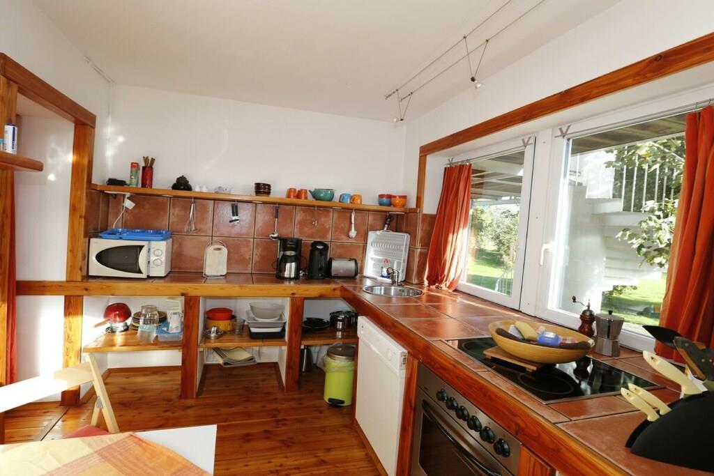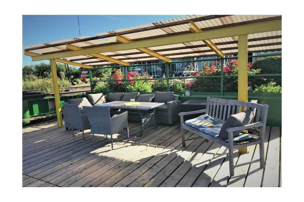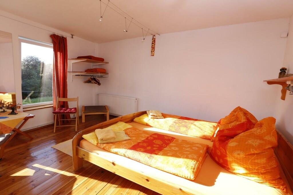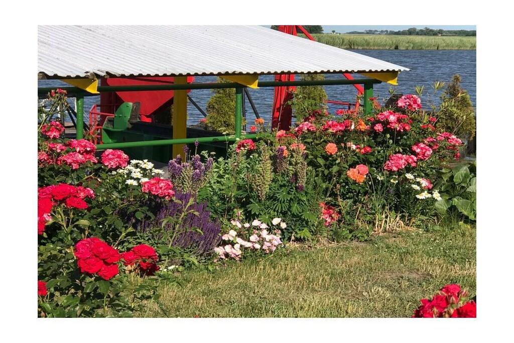 Semesterlägenheten är särskilt ljus och cirka 90 kvadratmeter stor. Trägolvet och inredningen ger den en varm karaktär. Duschrummet och köket är kaklade med terrakottakakel, vilket skapar en mysig medelhavsatmosfär. Det ljusa köket är utrustat med keramikhäll, ugn, mikrovågsugn, diskmaskin och kyl-frys. En bekväm frukosthörna finns i köket. Lägenheten har två sovrum med dubbelsäng: ett med dubbelsäng och det andra med två enkelsängar. En extra säng kan ordnas på begäran. Sovrummet med de två enkelsängarna erbjuder utsikt över vattnet från sängen, tillgång till terrassen och en egen ingång. Det andra sovrummet vetter mot sydväst och har utsikt över vallen. Vardagsrummet erbjuder också en vacker utsikt över flodlandskapet och direkt tillgång till terrassen och trädgården. Du kan njuta av utsikten över vattnet från den bekväma soffan eller matplatsen. Markisen över terrassen ger skugga vid behov. Alldeles intill lägenheten finns ett stort grönområde, perfekt för picknick vid floden, bollspel eller som lekplats för dina hundar.