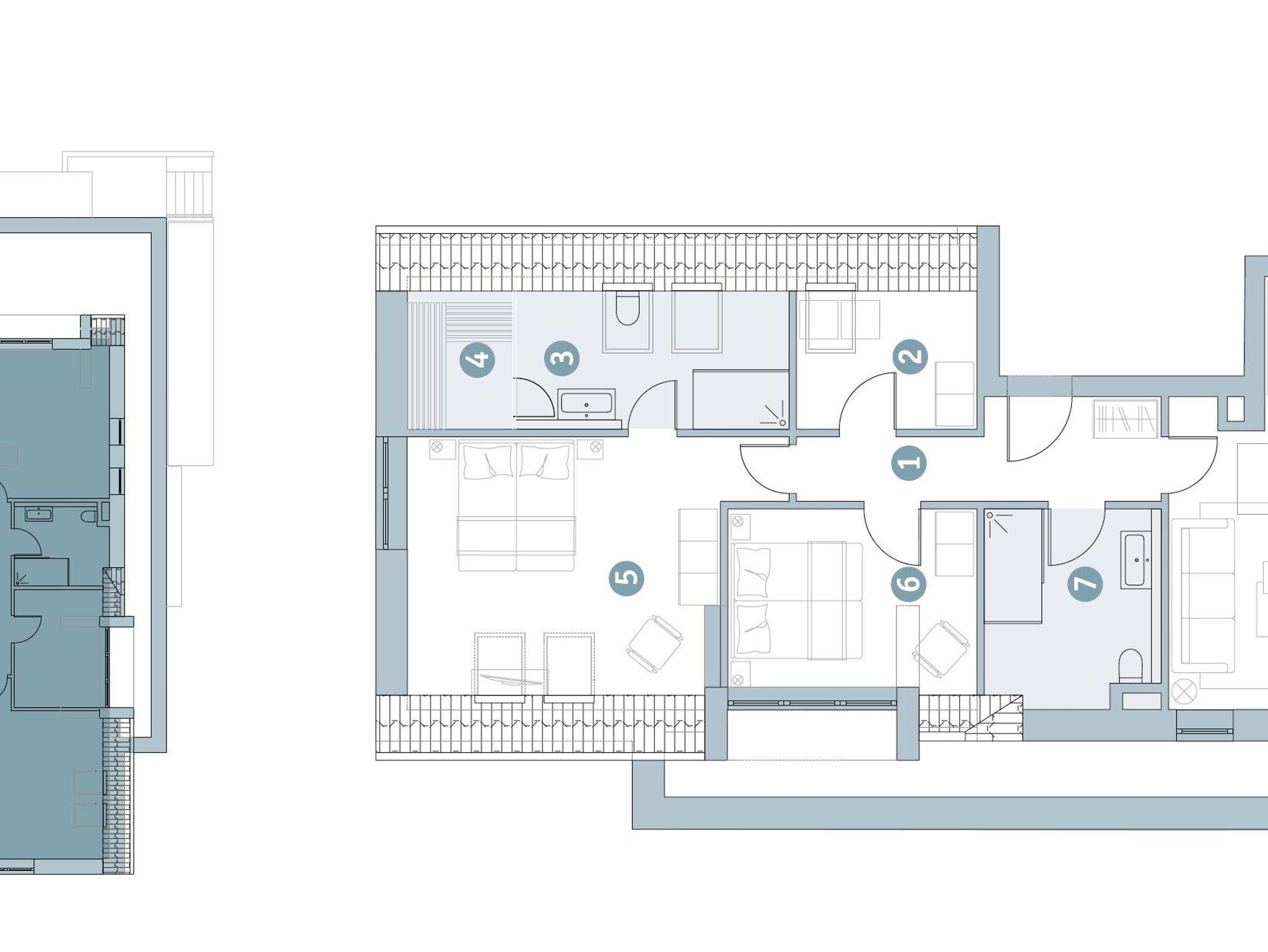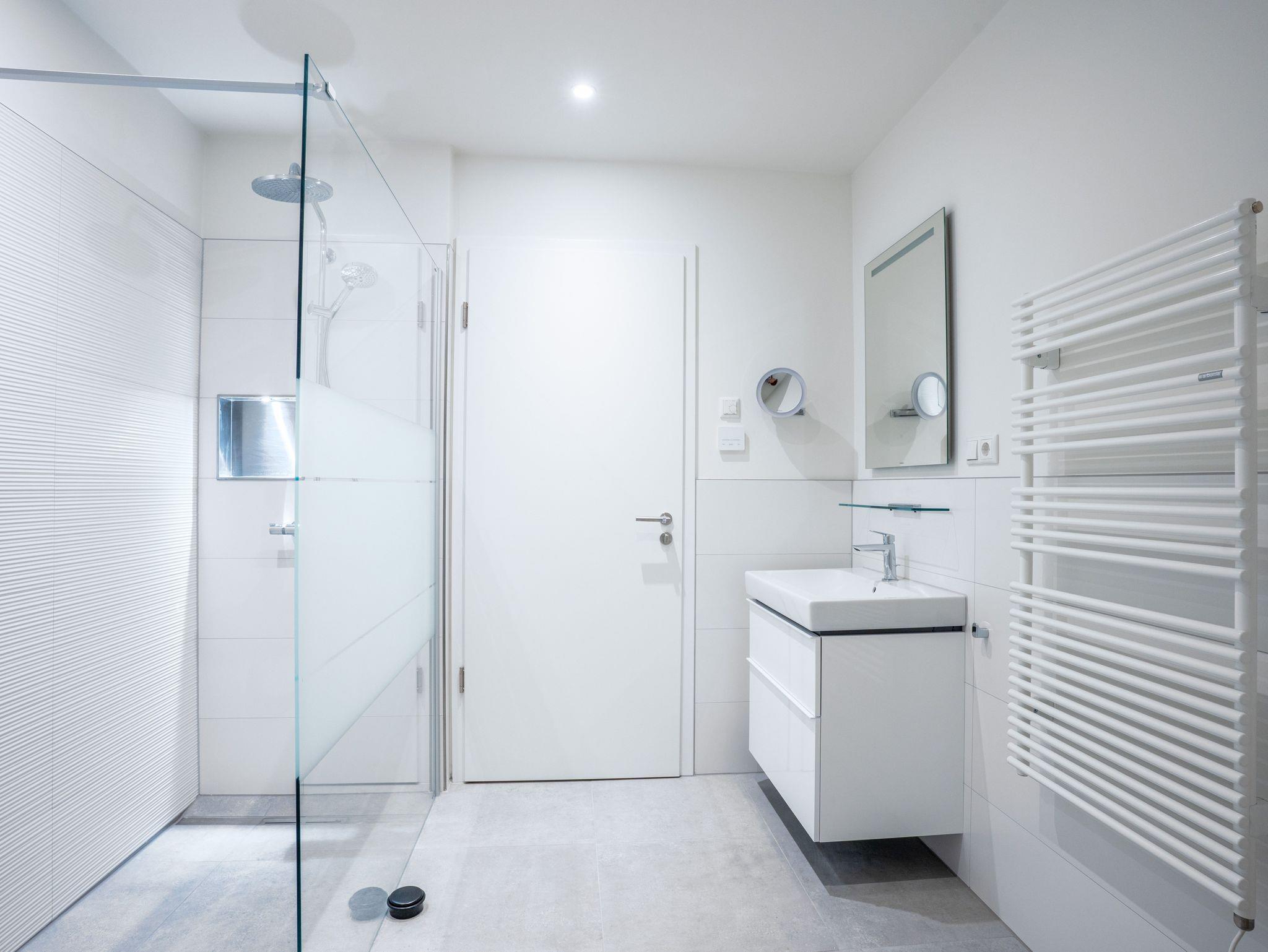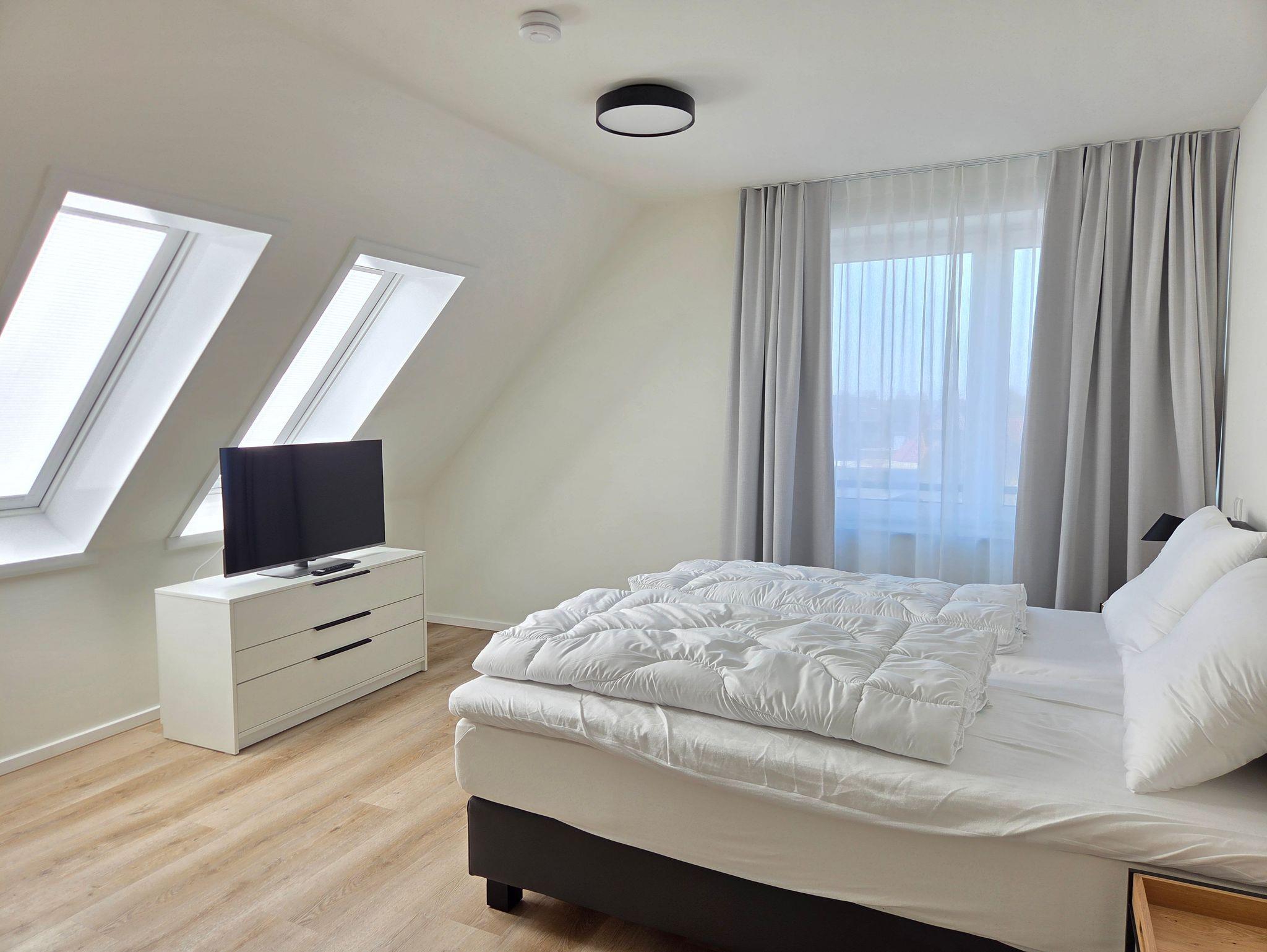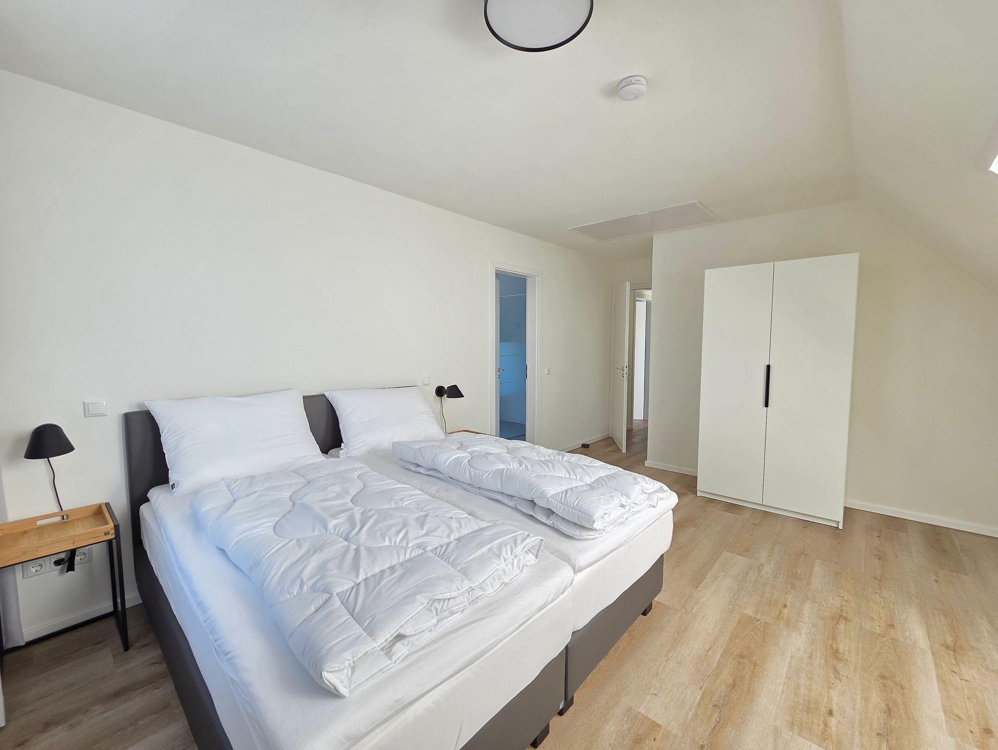 Die Ferienwohnung verfügt zudem über zwei Schlafzimmer mit Boxspringbetten (180x200 cm) sowie über zwei moderne Badezimmer mit Dusche. Eines der Badezimmer ist direkt an eines der Schlafzimmer angeschlossen.