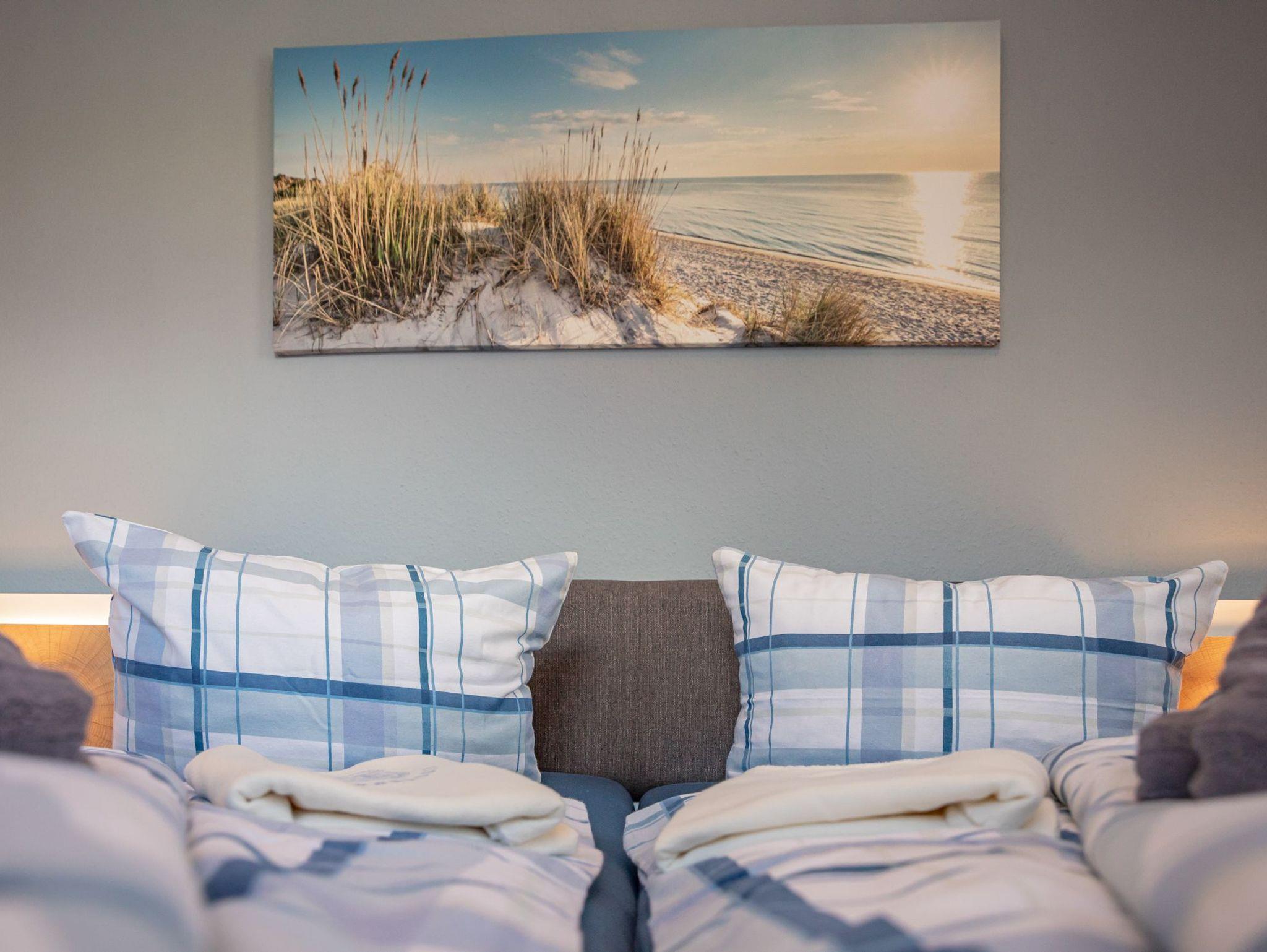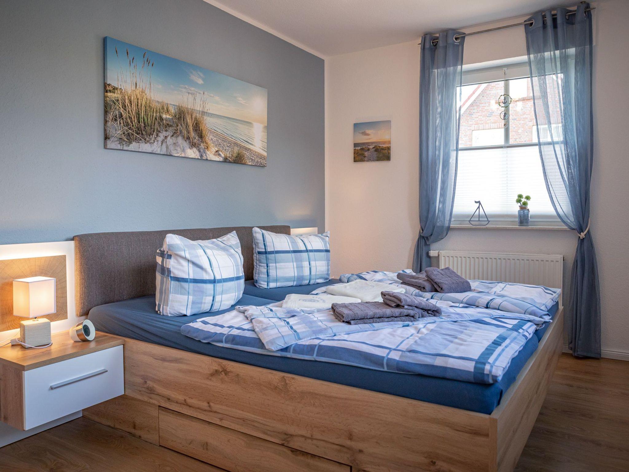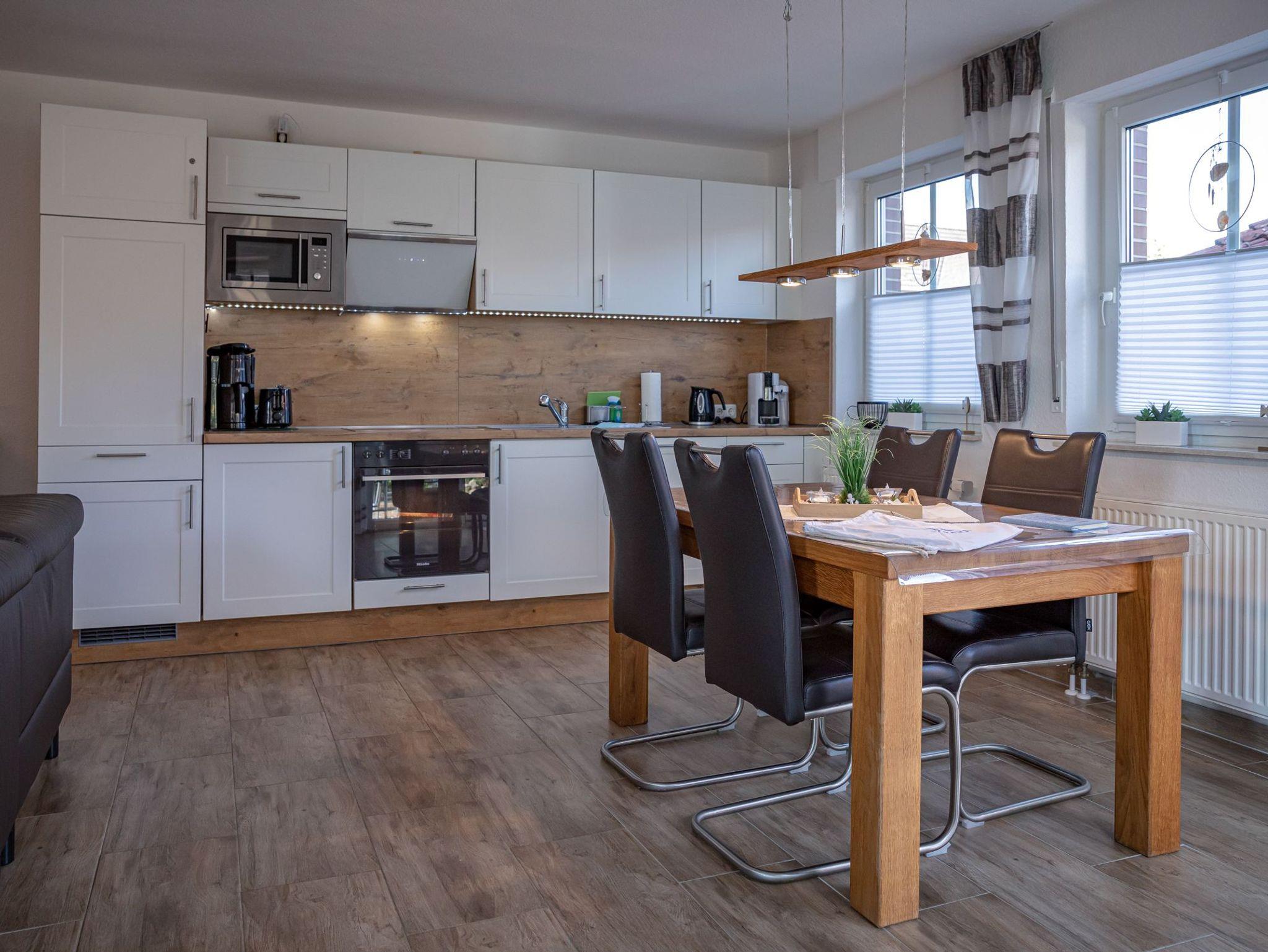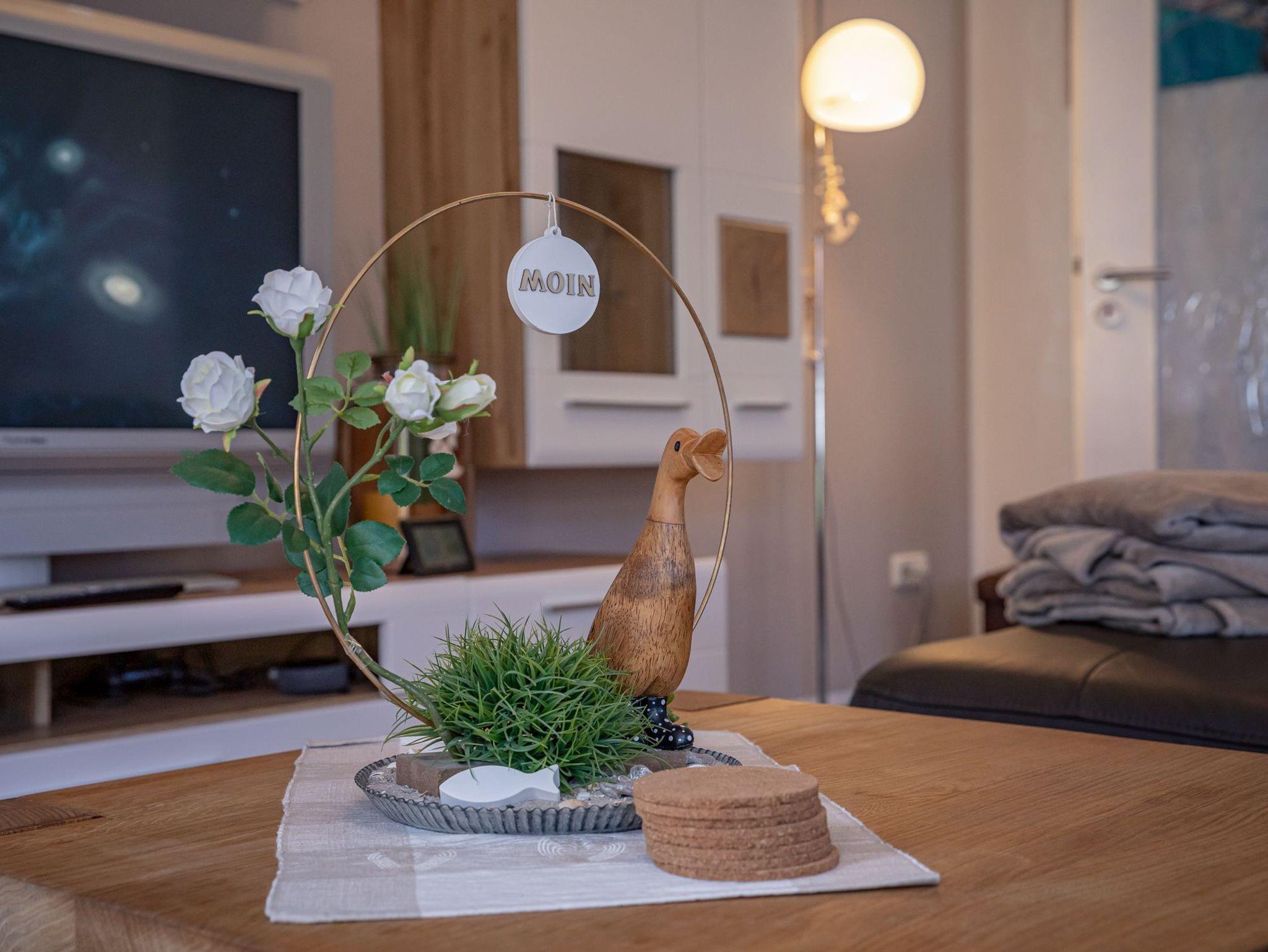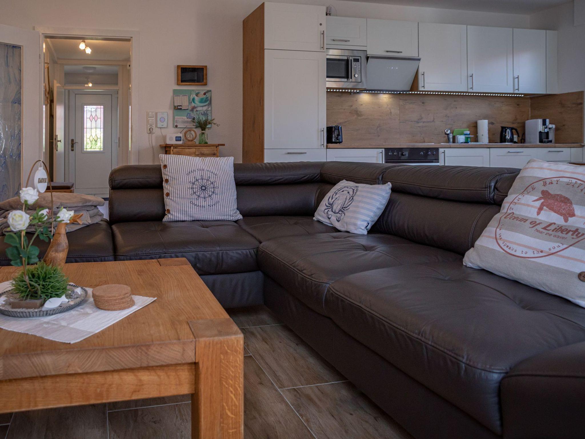 Unsere neu und modern eingerichtete Ferienwohnung liegt im Erdgeschoss mit ebenerdigem Zugang und empfängt Sie mit einem großzügigen und lichtdurchfluteten Wohn-/Essbereich mit Küchenzeile, Schlafsofa und Zugang zur sonnigen und windgeschützten Terrasse. Die Küche bietet Ihnen alles, was Sie für einen entspannten Start in den Tag benötigen. Sie ist mit Mikrowelle sowie Spül- und Waschmaschine ausgestattet. Das Schlafzimmer verfügt über ein Doppelbett (180x200) und einen großen Kleiderschrank, das Bad über eine ebenerdige Dusche. Ihre Fahrräder können im abschließbaren Schuppen untergebracht werden.