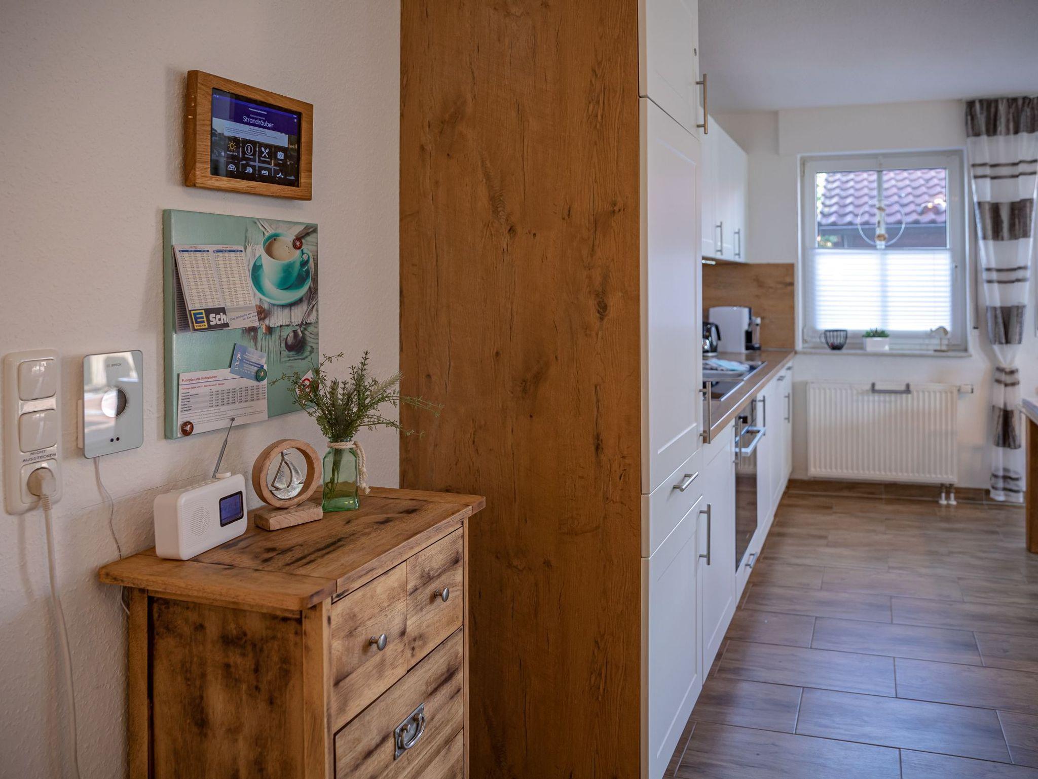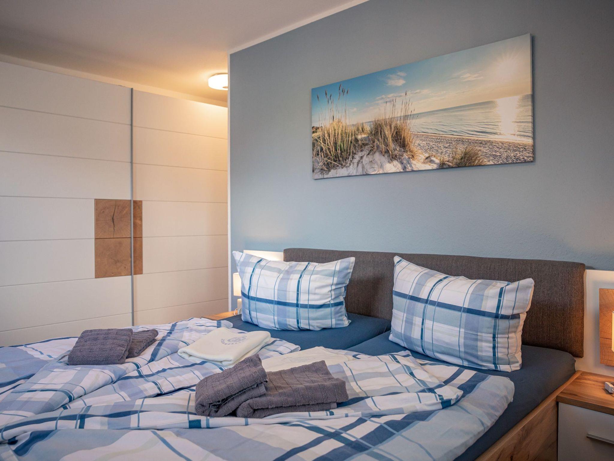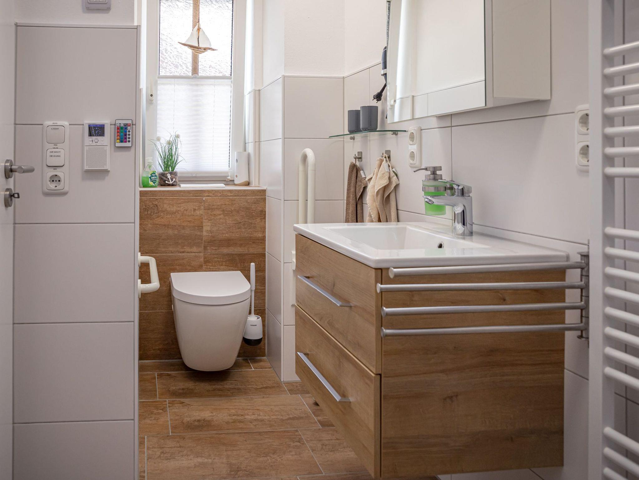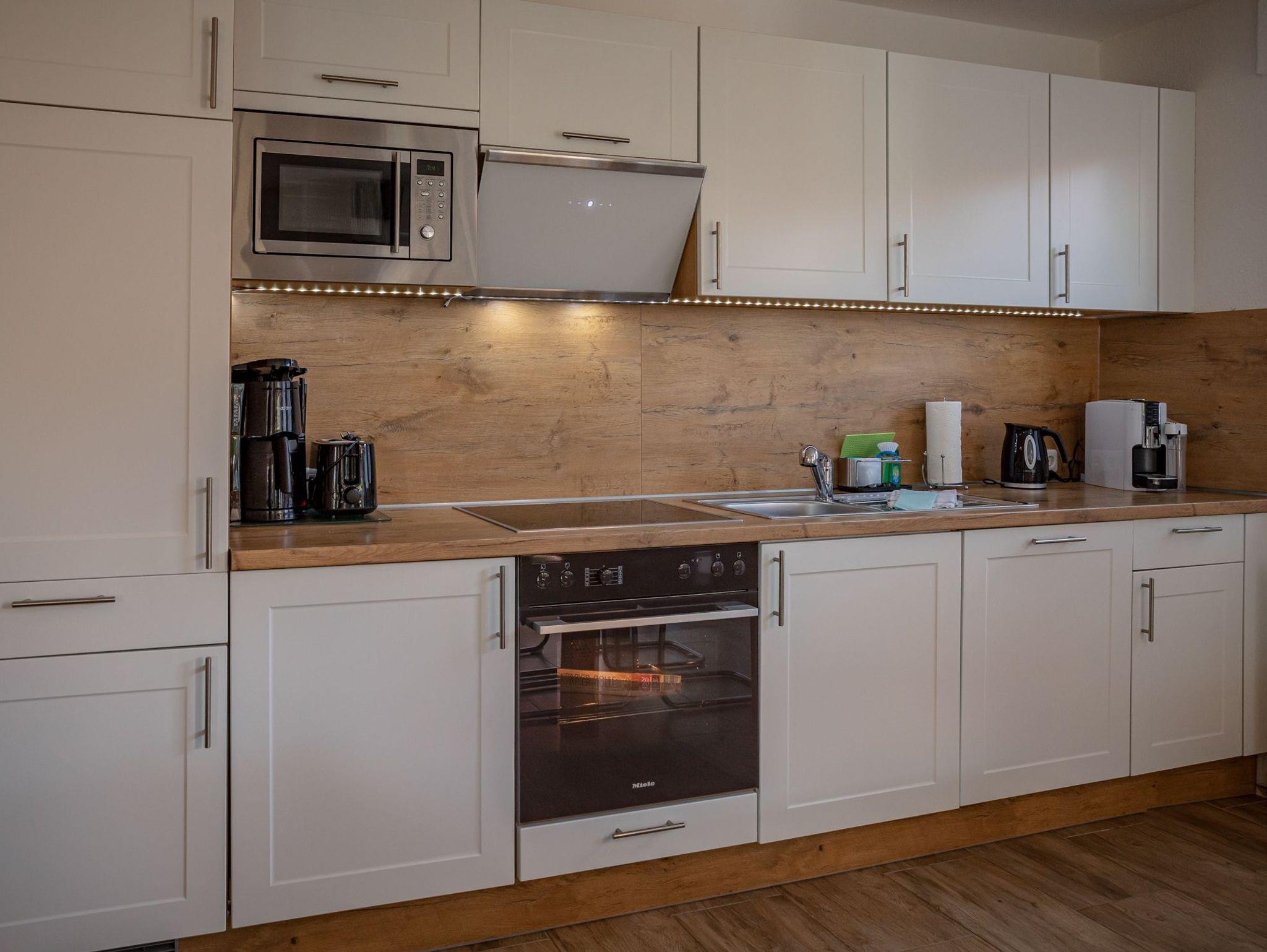 Unsere neu und modern eingerichtete Ferienwohnung liegt im Erdgeschoss mit ebenerdigem Zugang und empfängt Sie mit einem großzügigen und lichtdurchfluteten Wohn-/Essbereich mit Küchenzeile, Schlafsofa und Zugang zur sonnigen und windgeschützten Terrasse. Die Küche bietet Ihnen alles, was Sie für einen entspannten Start in den Tag benötigen. Sie ist mit Mikrowelle sowie Spül- und Waschmaschine ausgestattet. Das Schlafzimmer verfügt über ein Doppelbett (180x200) und einen großen Kleiderschrank, das Bad über eine ebenerdige Dusche. Ihre Fahrräder können im abschließbaren Schuppen untergebracht werden.