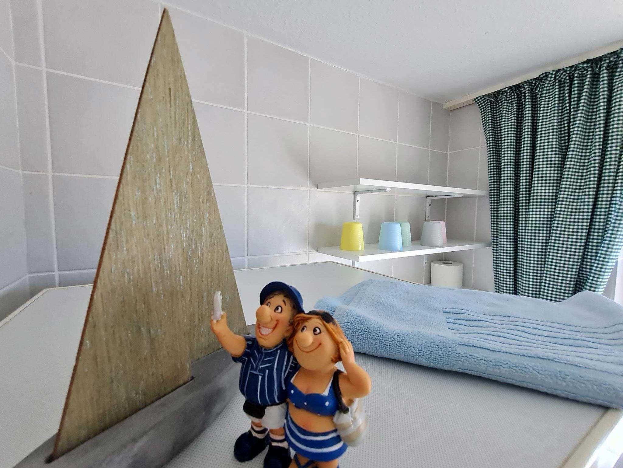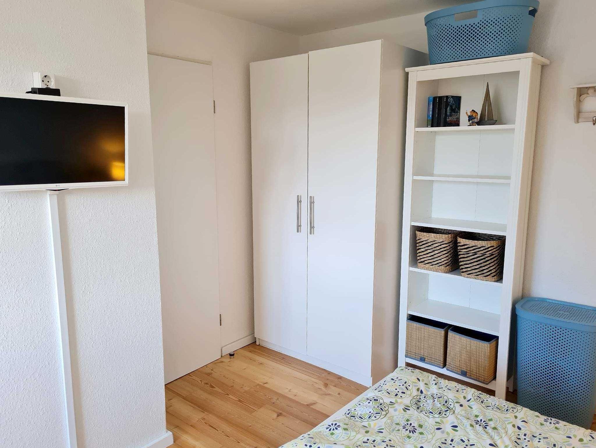 Die mit Holzdielen verkleidete Treppe führt ins Obergeschoss (ebenfalls Holzdielen). Hier finden Sie zwei Schlafräume, die auch jeweils mit einem Satellitenfernseher ausgestattet sind. Ein Schlafzimmer bietet ein Doppelbett, 1 Gitterbettchen und einen Kleiderschrank mit Schubladen. Das zweite Schlafzimmer ist eingerichtet mit einem Einzelbett (120 cm) und einem Kleiderschrank mit Schubladen. Außerdem befindet sich auf dieser Etage das Badezimmer mit Dusche (incl. Duschtür) und WC, Waschmaschine, Trockner und Fön.