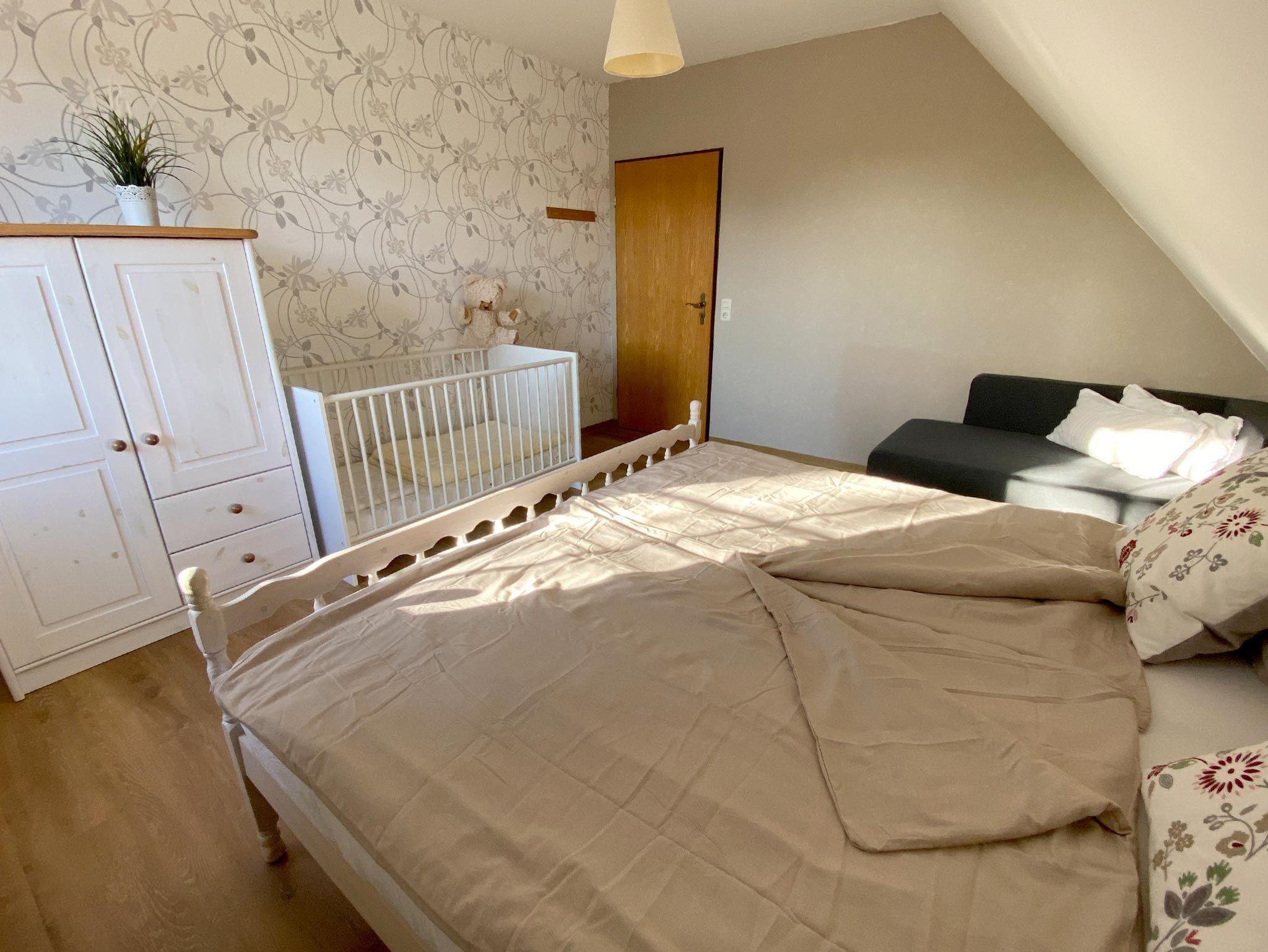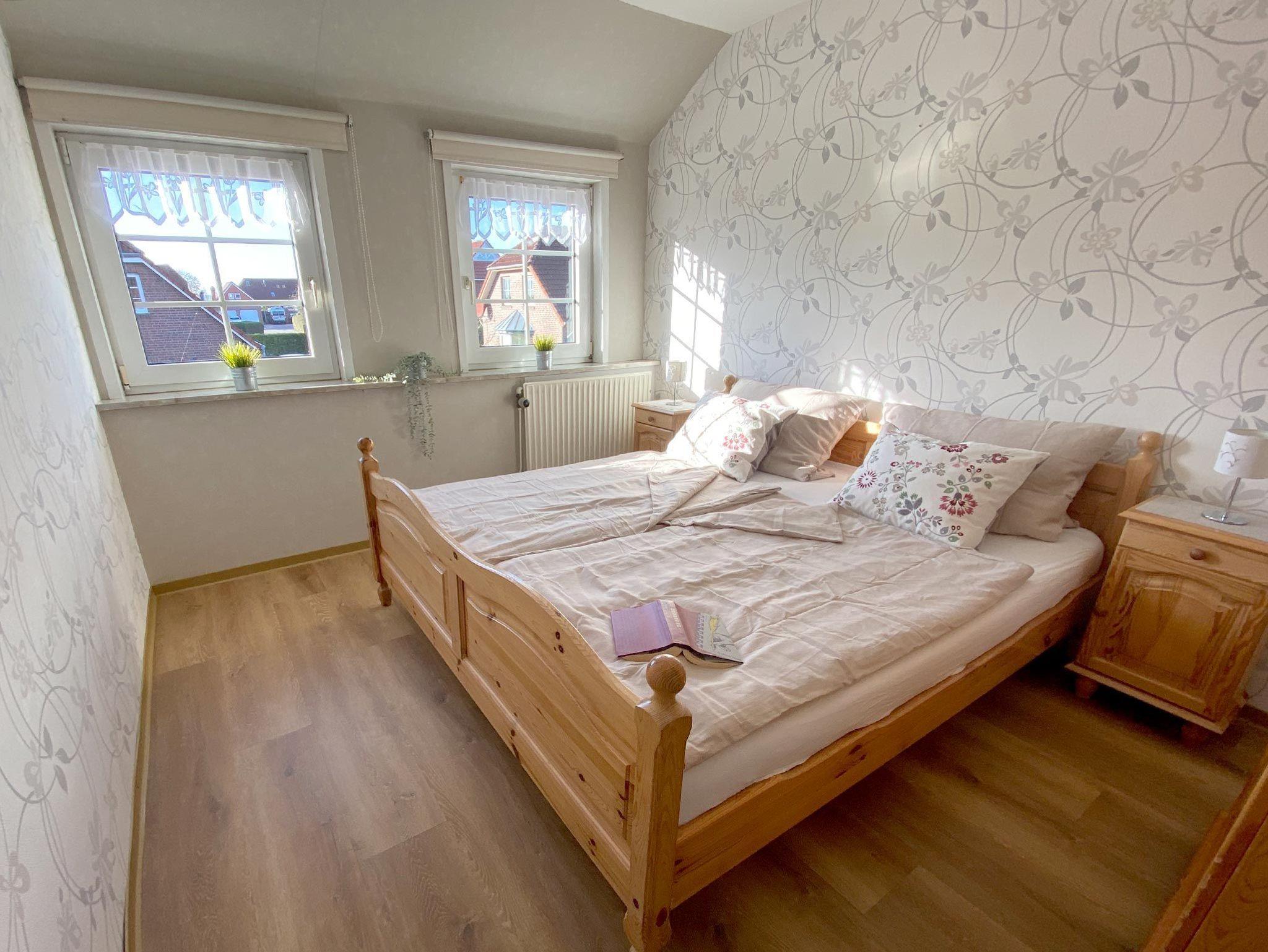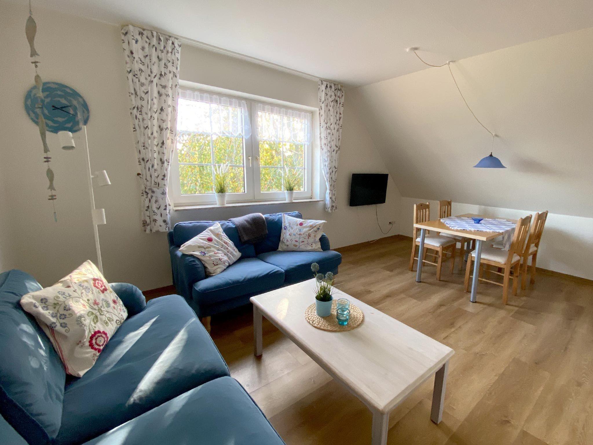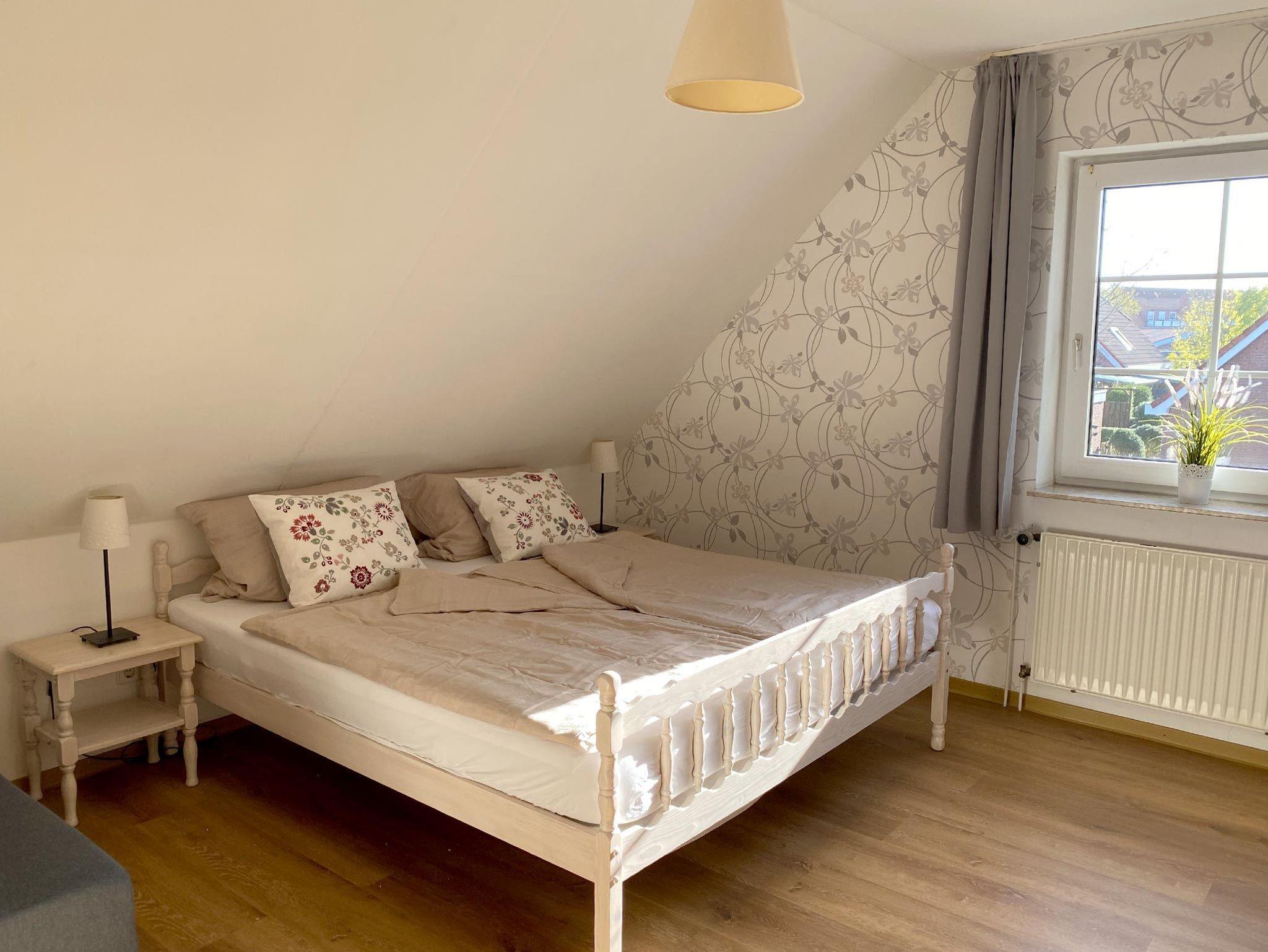 Ferienwohnunng für 4 Erwachsene und ein Kleinkind im Obergeschoss. Die Wohnung bietet Wohn- und Esszimmer, offene, komplett ausgestatte Küche, 2 Schlafzimmer jeweils mit Doppelbett sowie Bad mit Dusche und WC. Im Garten steht eine Terrasse mit Strandkorb und Grillmöglichkeit zur Verfügung.