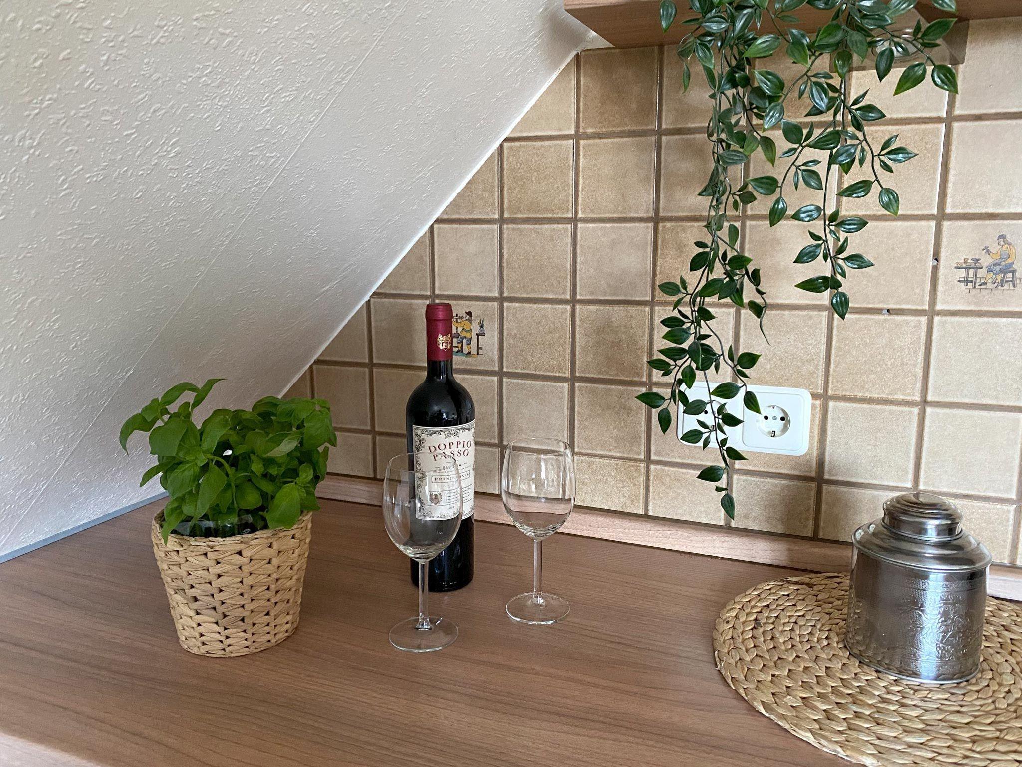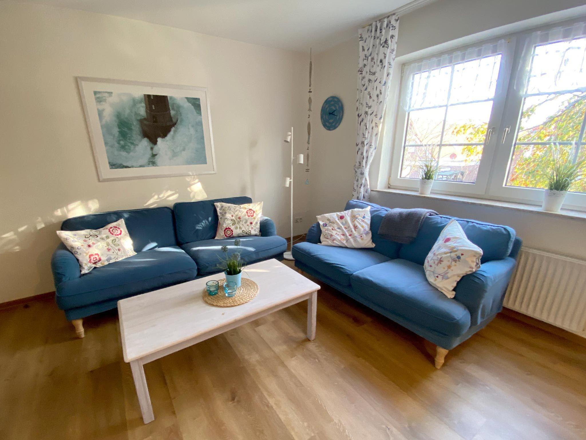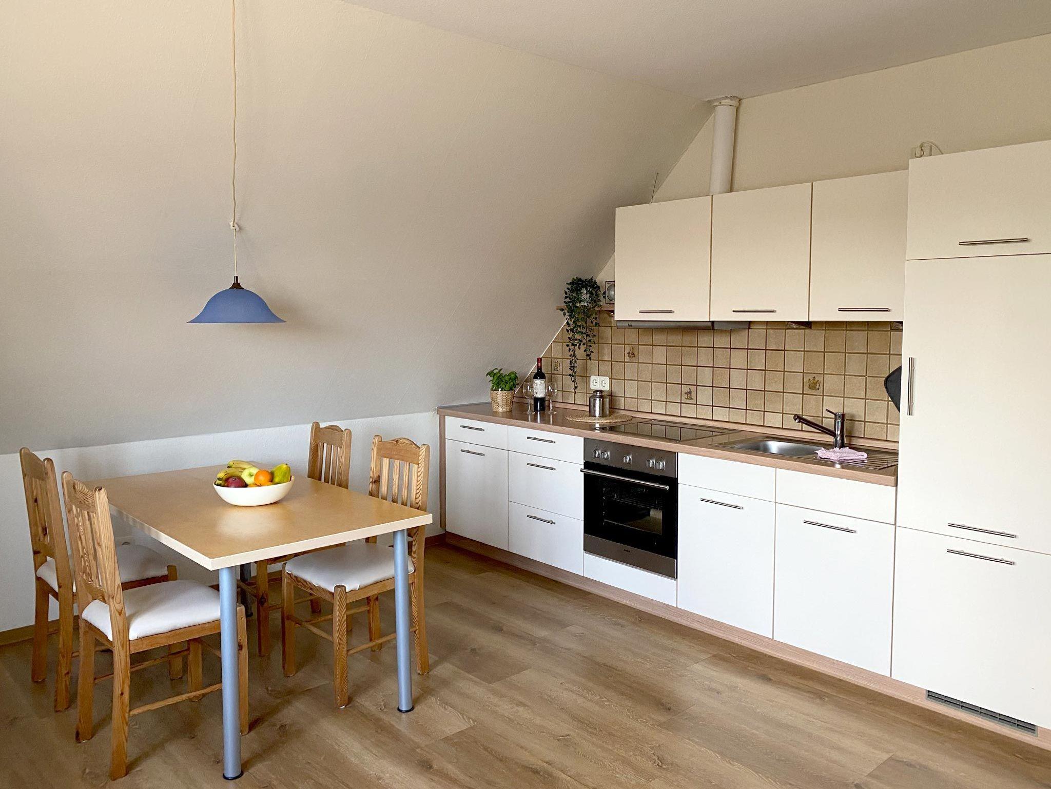 Ferienwohnunng für 4 Erwachsene und ein Kleinkind im Obergeschoss. Die Wohnung bietet Wohn- und Esszimmer, offene, komplett ausgestatte Küche, 2 Schlafzimmer jeweils mit Doppelbett sowie Bad mit Dusche und WC. Im Garten steht eine Terrasse mit Strandkorb und Grillmöglichkeit zur Verfügung.