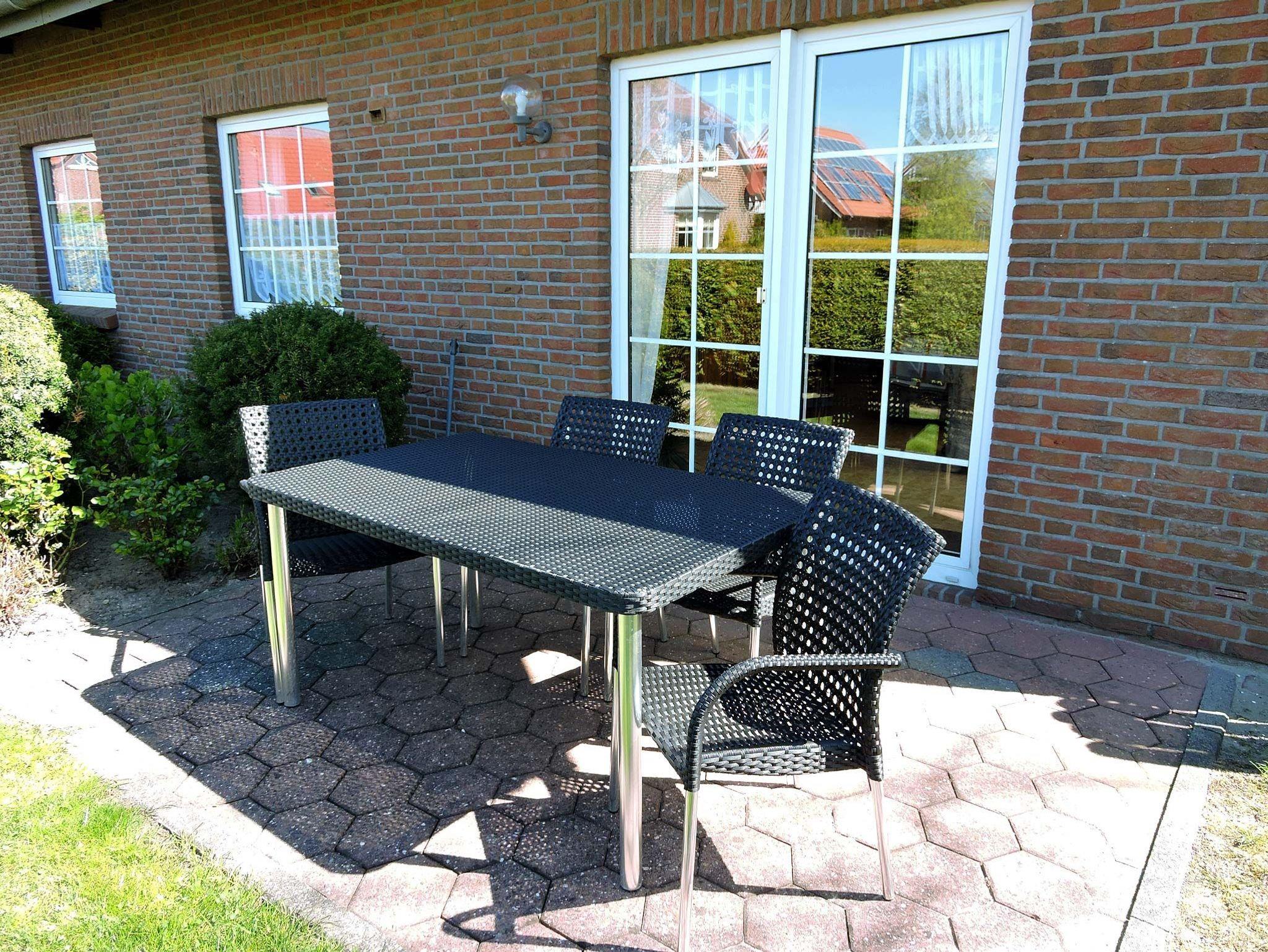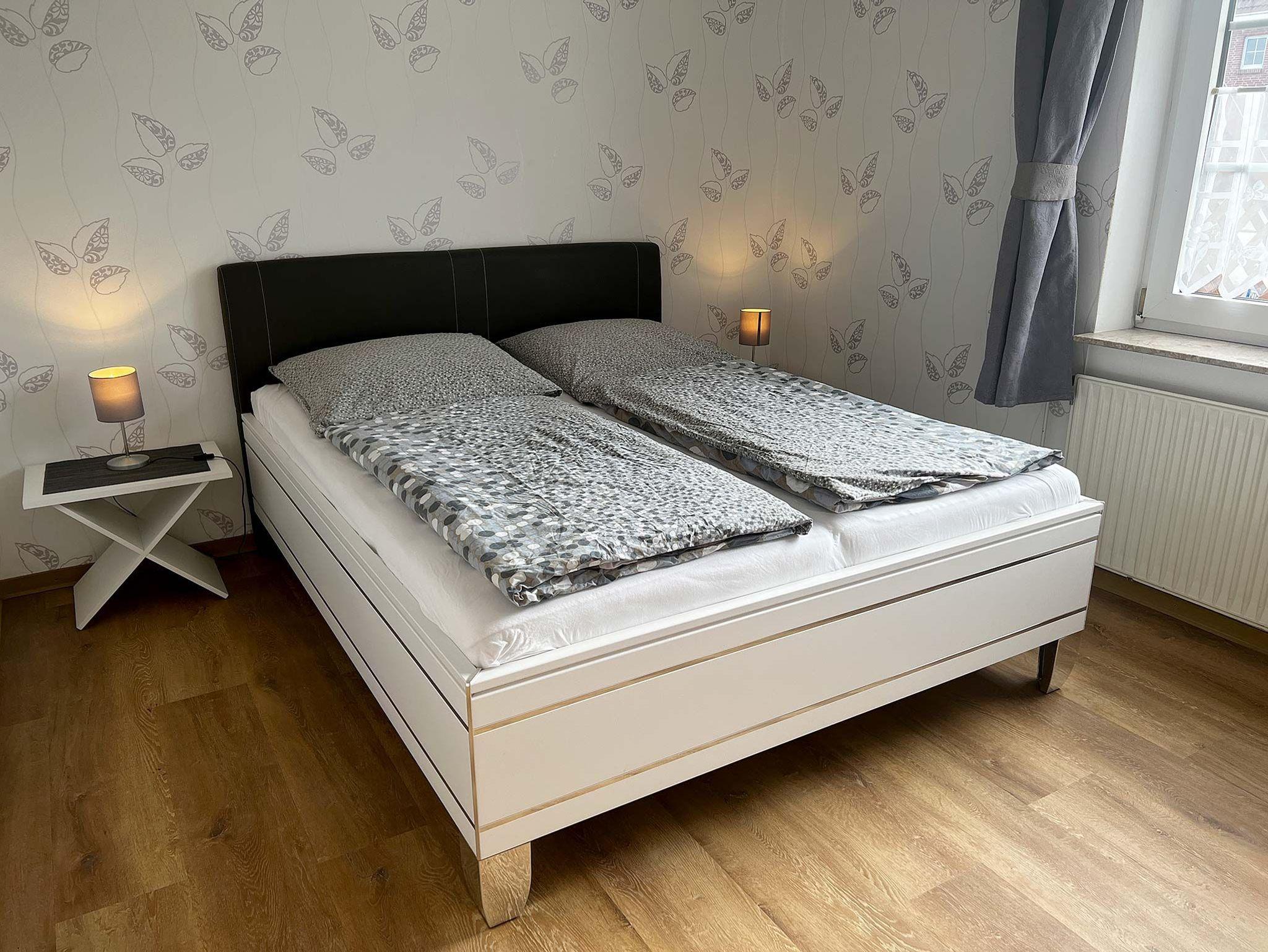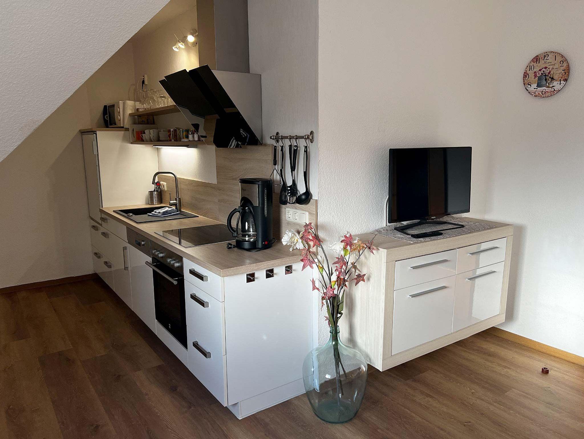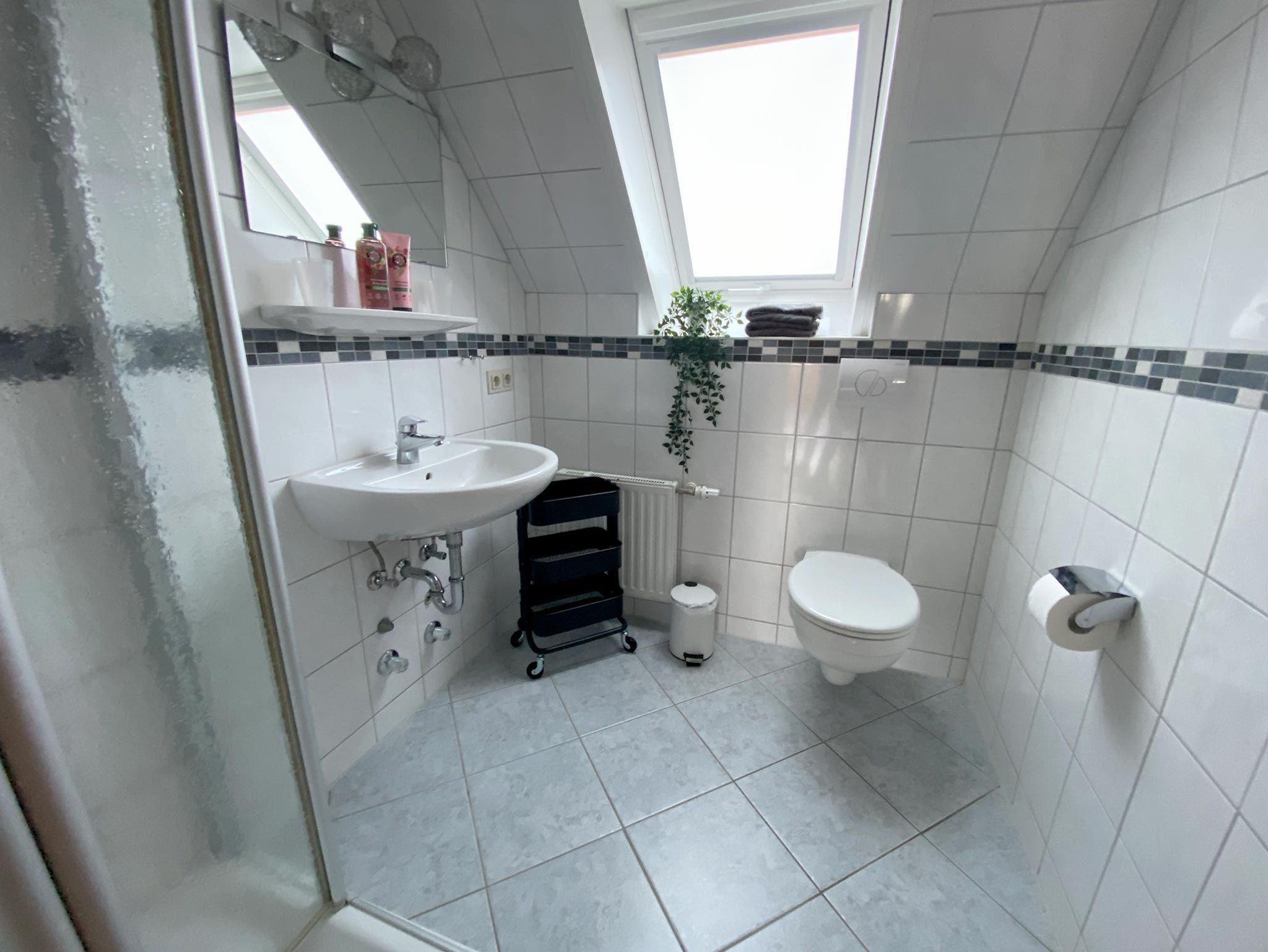 Ferienwohnunng für 4 Erwachsene und ein Kleinkind im Obergeschoss. Die Wohnung bietet Wohn- und Esszimmer, offene, komplett ausgestatte Küche, 2 Schlafzimmer jeweils mit Doppelbett sowie Bad mit Dusche und WC. Im Garten steht eine Terrasse mit Strandkorb und Grillmöglichkeit zur Verfügung.