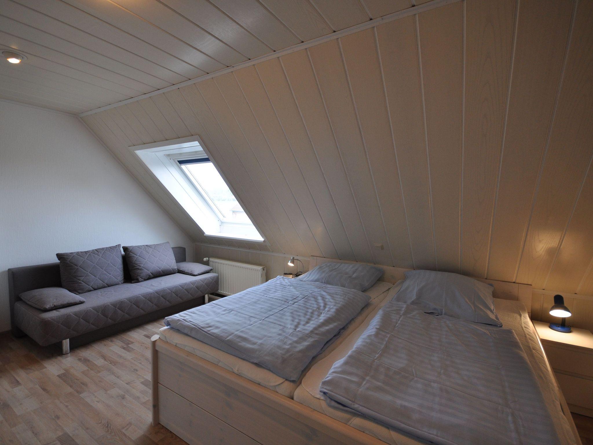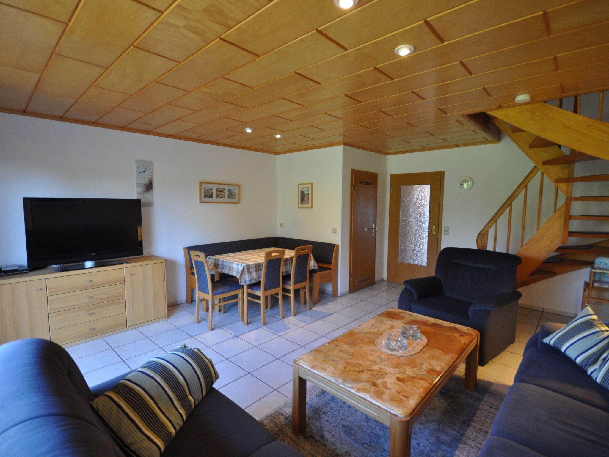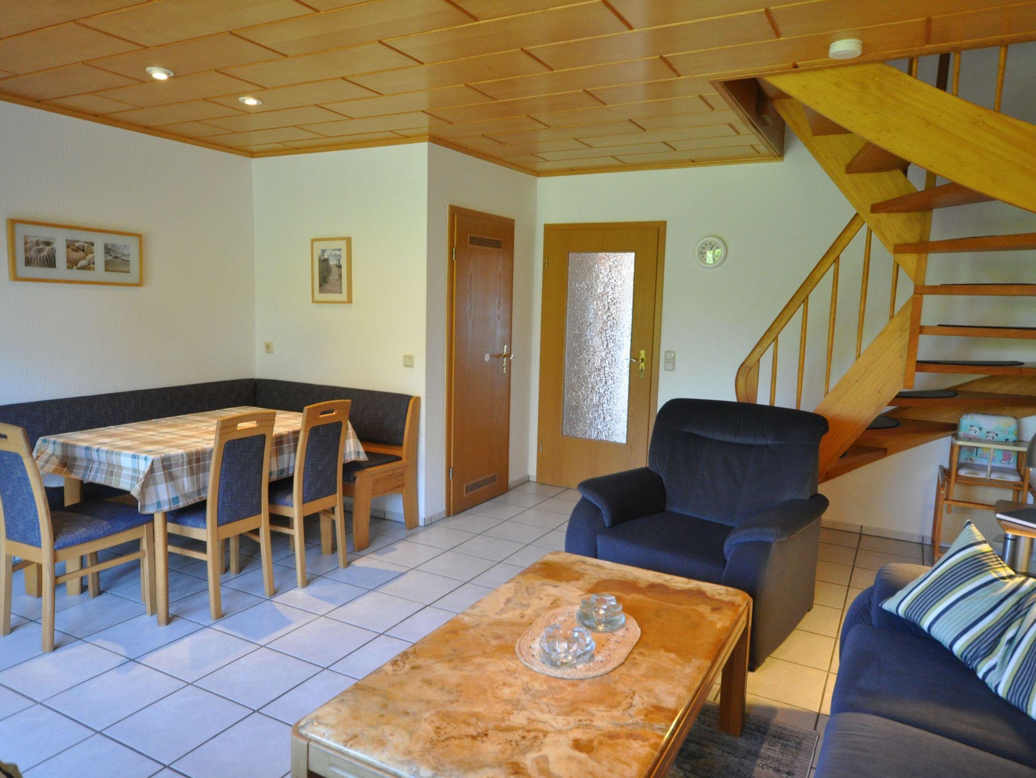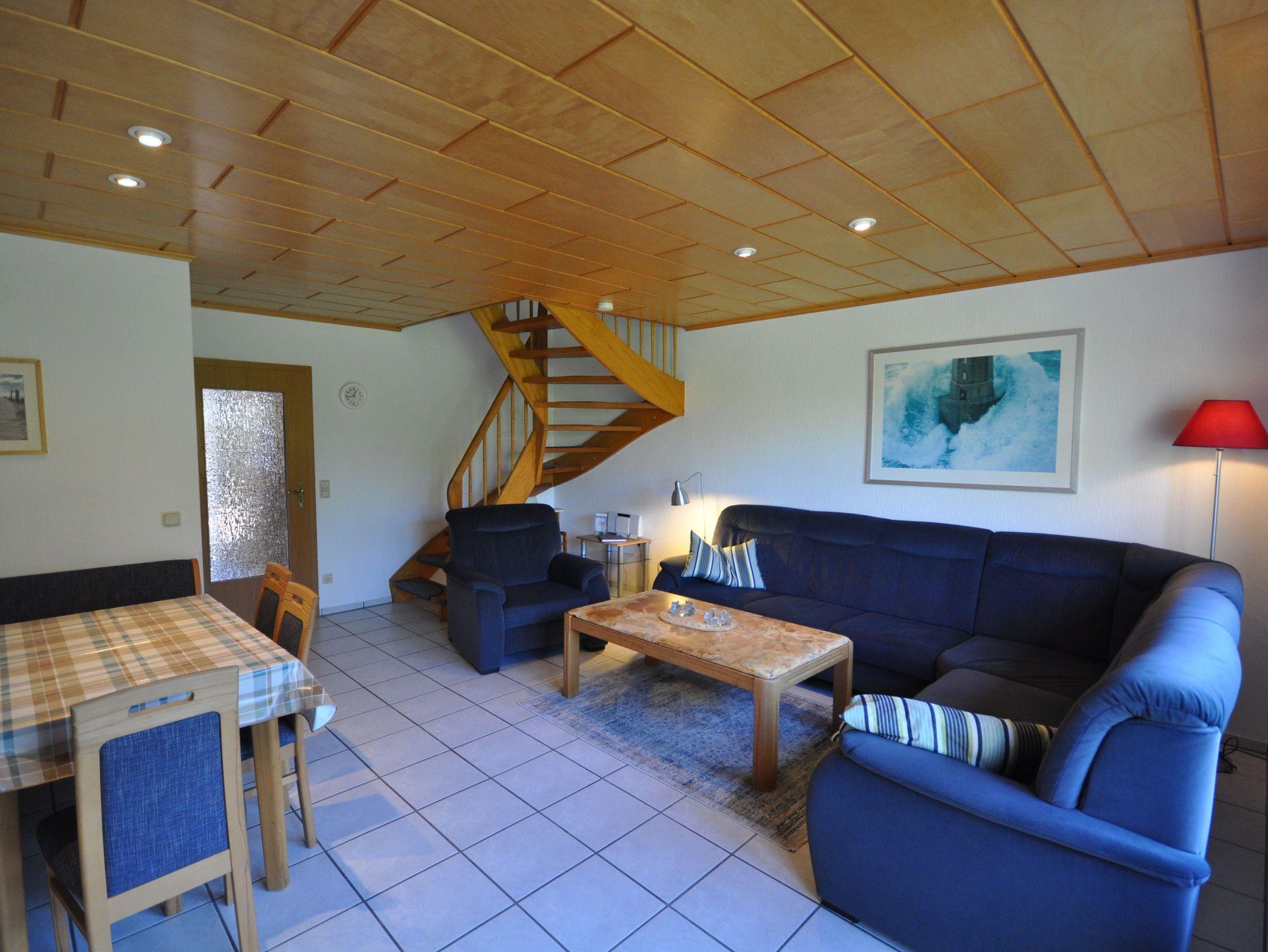 Im Erdgeschoss des ca. 70 m² großen Reihenhauses befinden sich ein großzügiger Wohn- und Essbereich mit Ausgang zur Terrasse, eine separate, vollständig ausgestattete Küche sowie ein Badezimmer mit Dusche und WC. Im Obergeschoss finden Sie zwei Schlafzimmer mit einem Doppelbett bzw. zwei Einzelbetten und ein Bad mit Badewanne vor. Das Badezimmer ist durch das Schlafzimmer mit den Einzelbetten zu erreichen. In einem ausgebauten Dachstudio befinden sich zwei weitere Einzelbetten mit TV. WLAN steht Ihnen kostenlos zur Verfügung.
