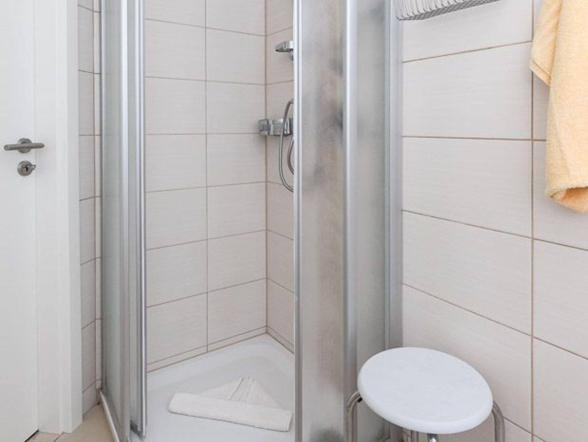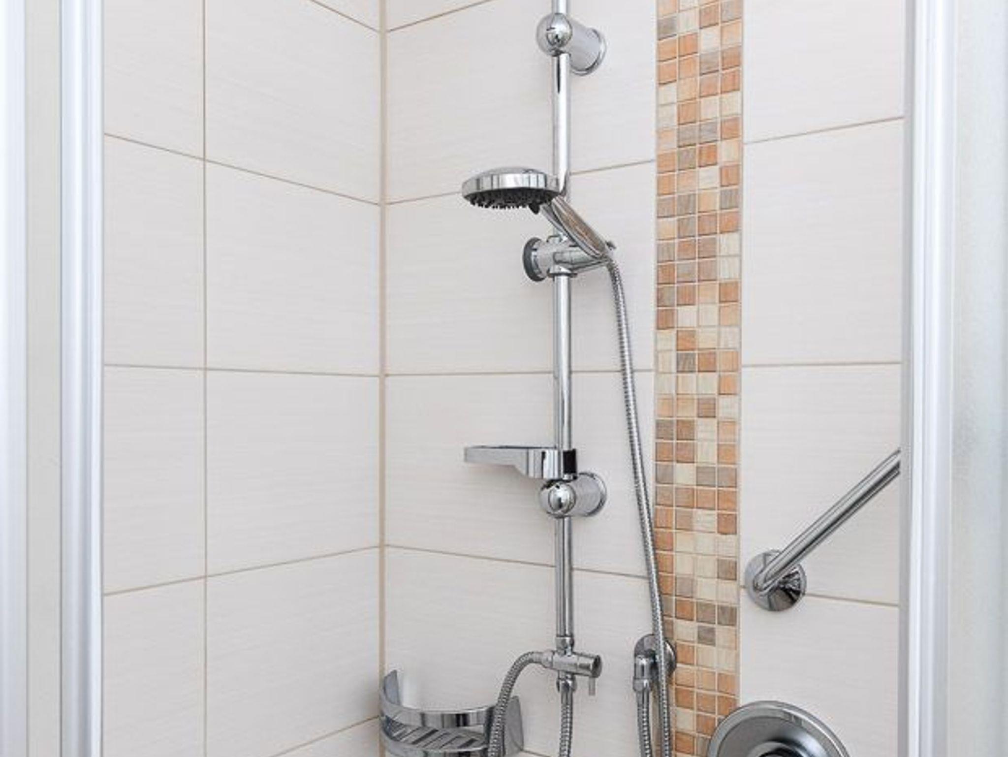 Badezimmer mit Dusche, Waschtisch und WC